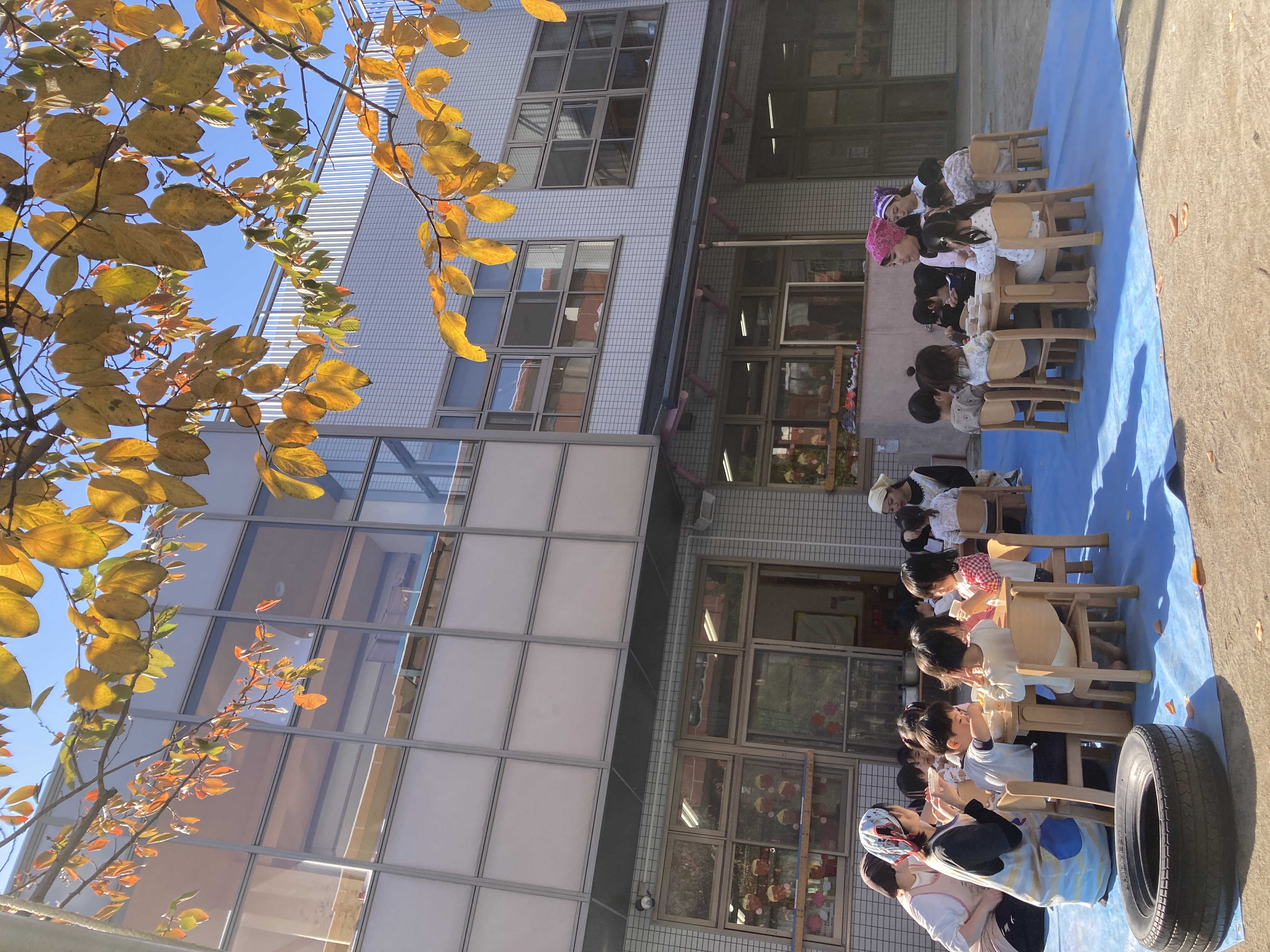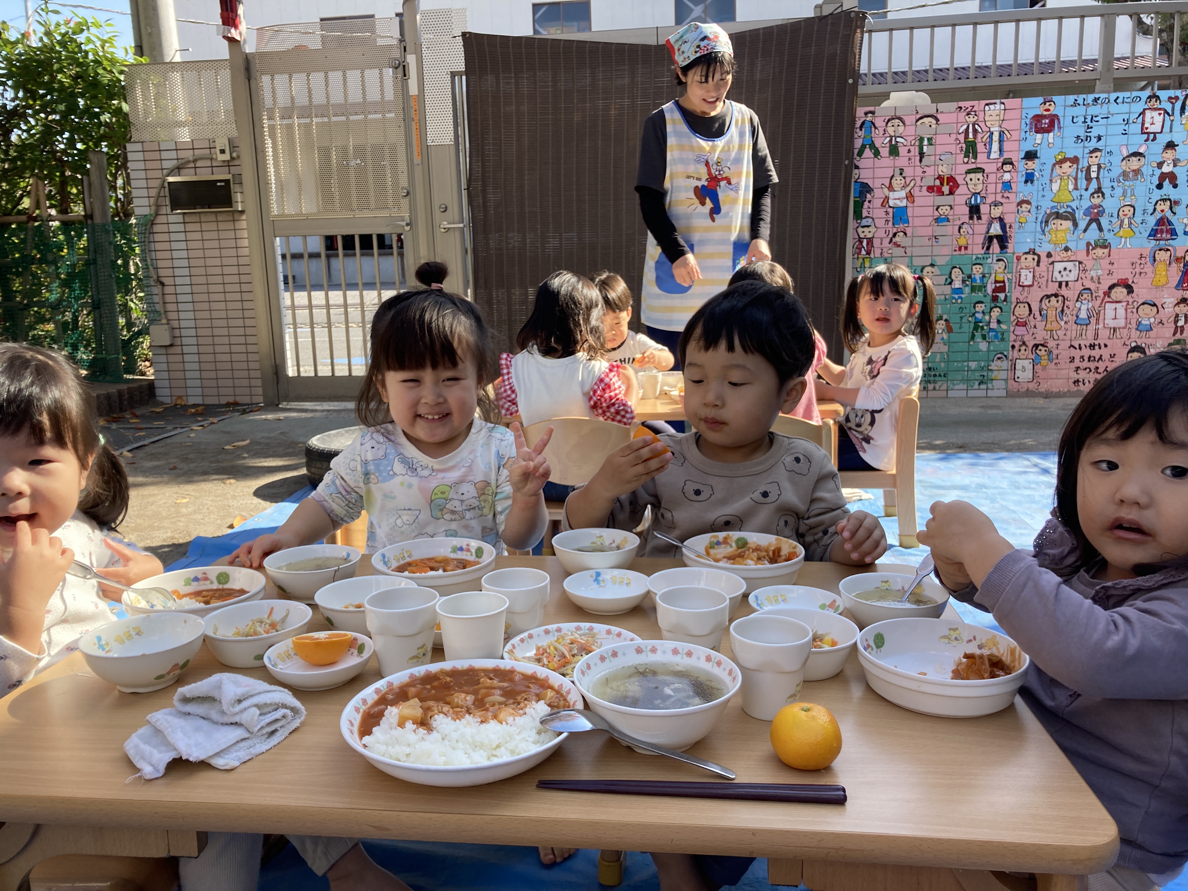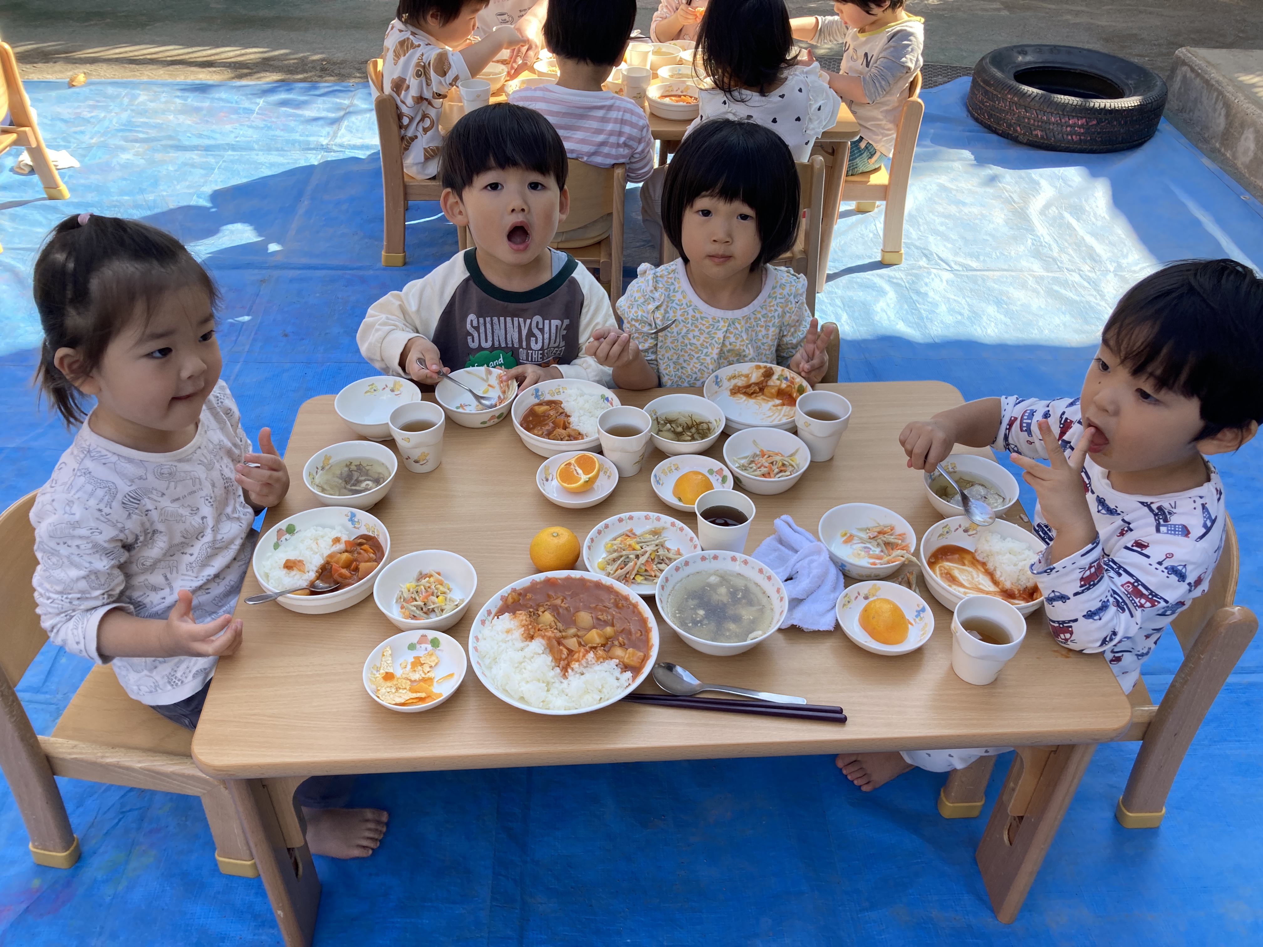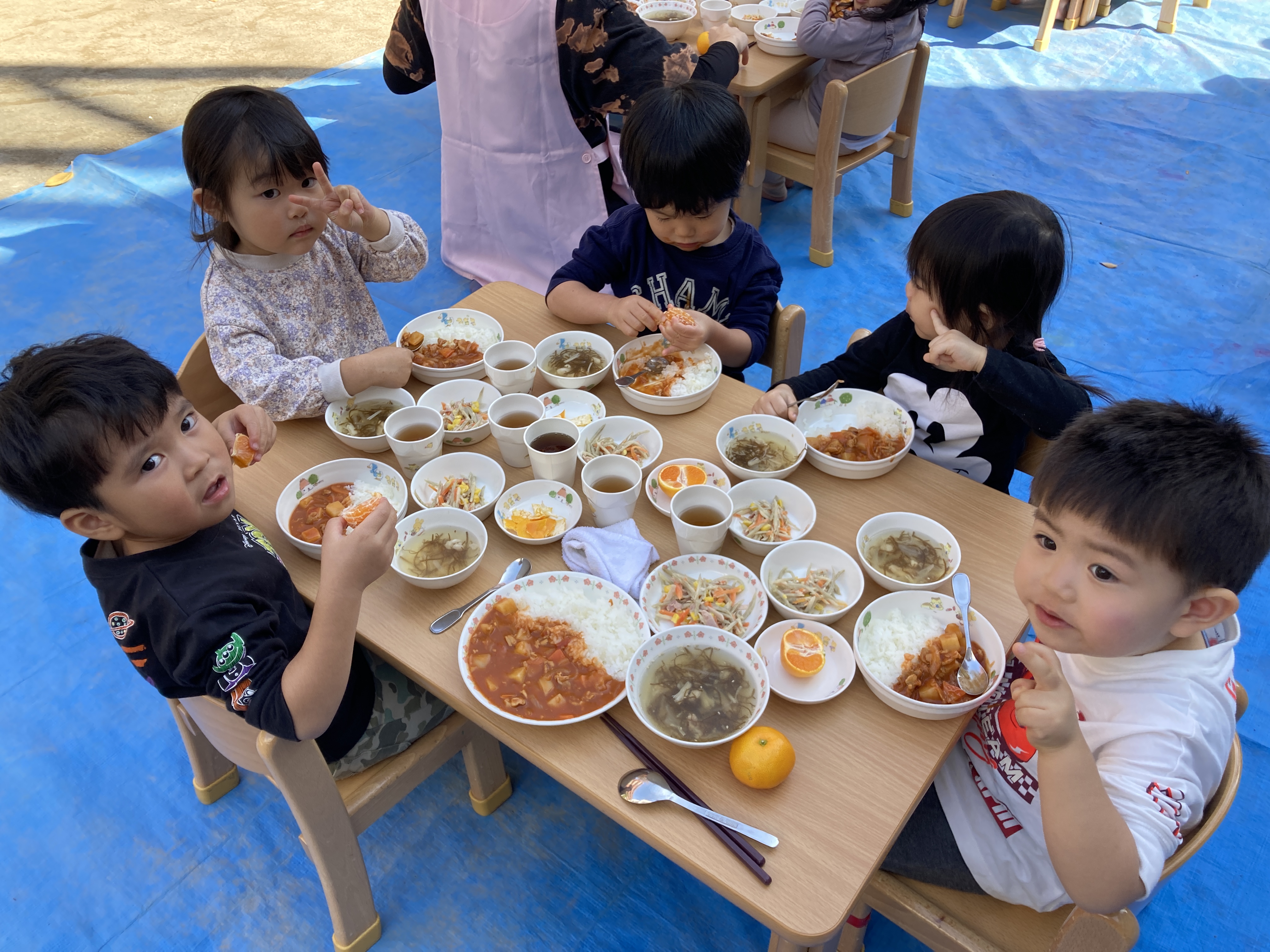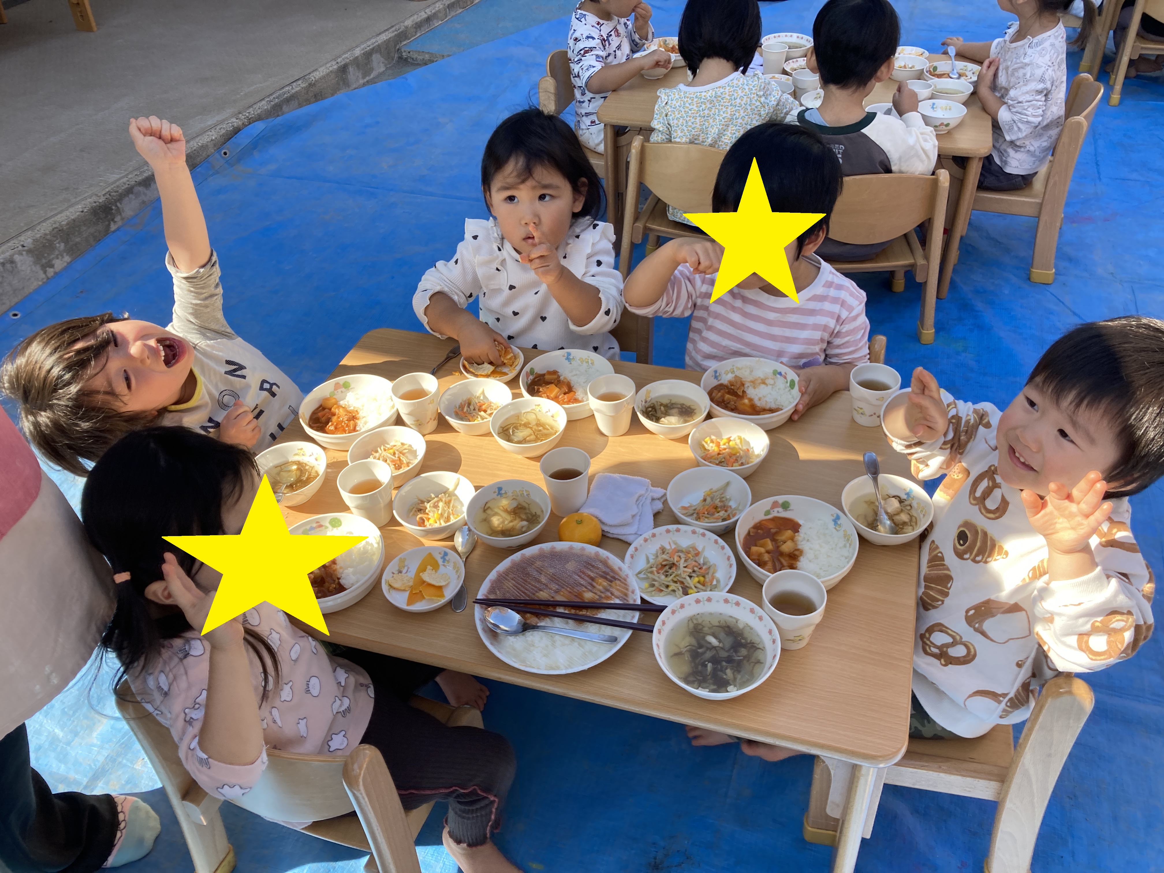 秋晴れの気持ちい青空のもと、今日は園庭で給食をいただきました。