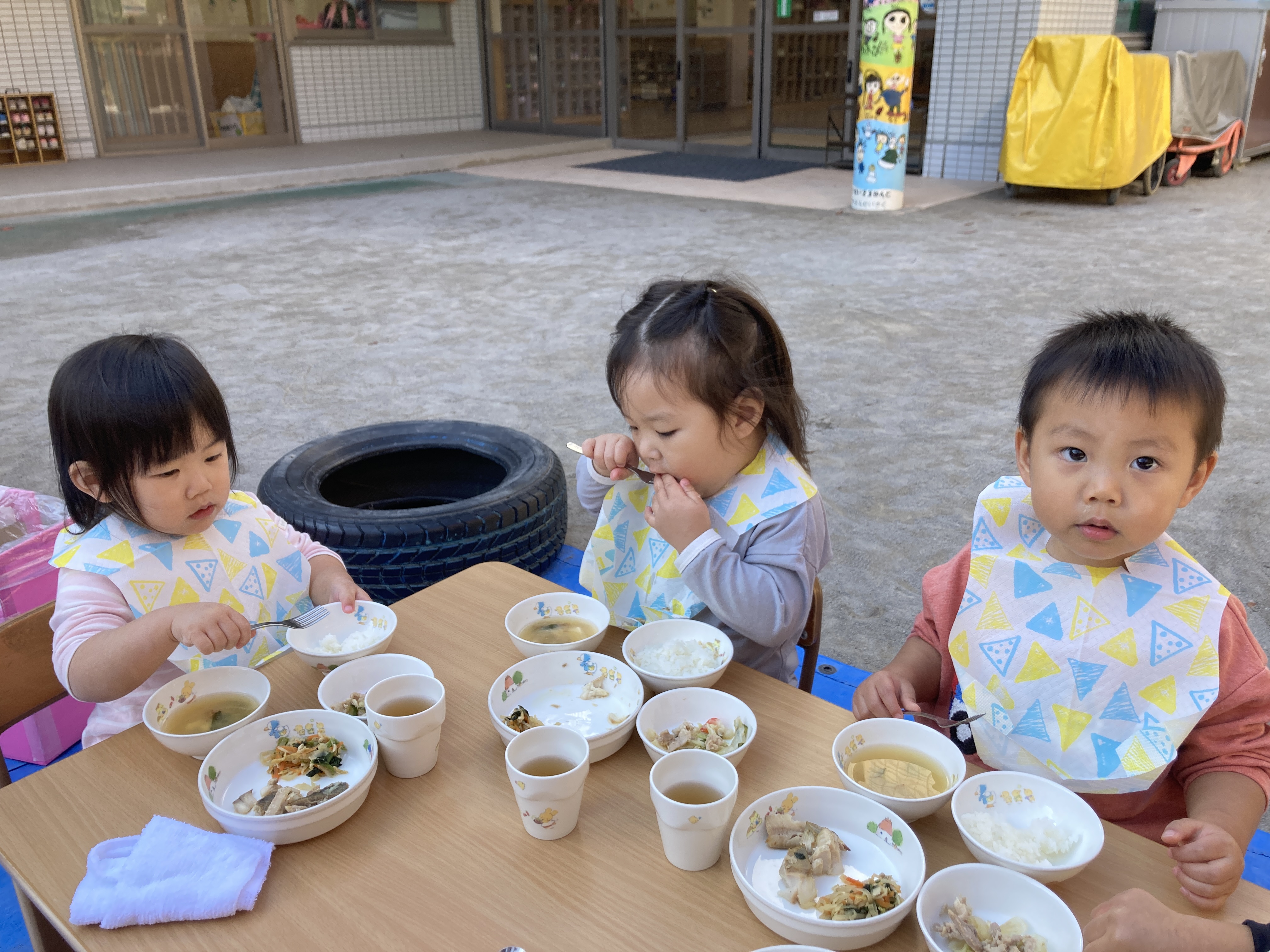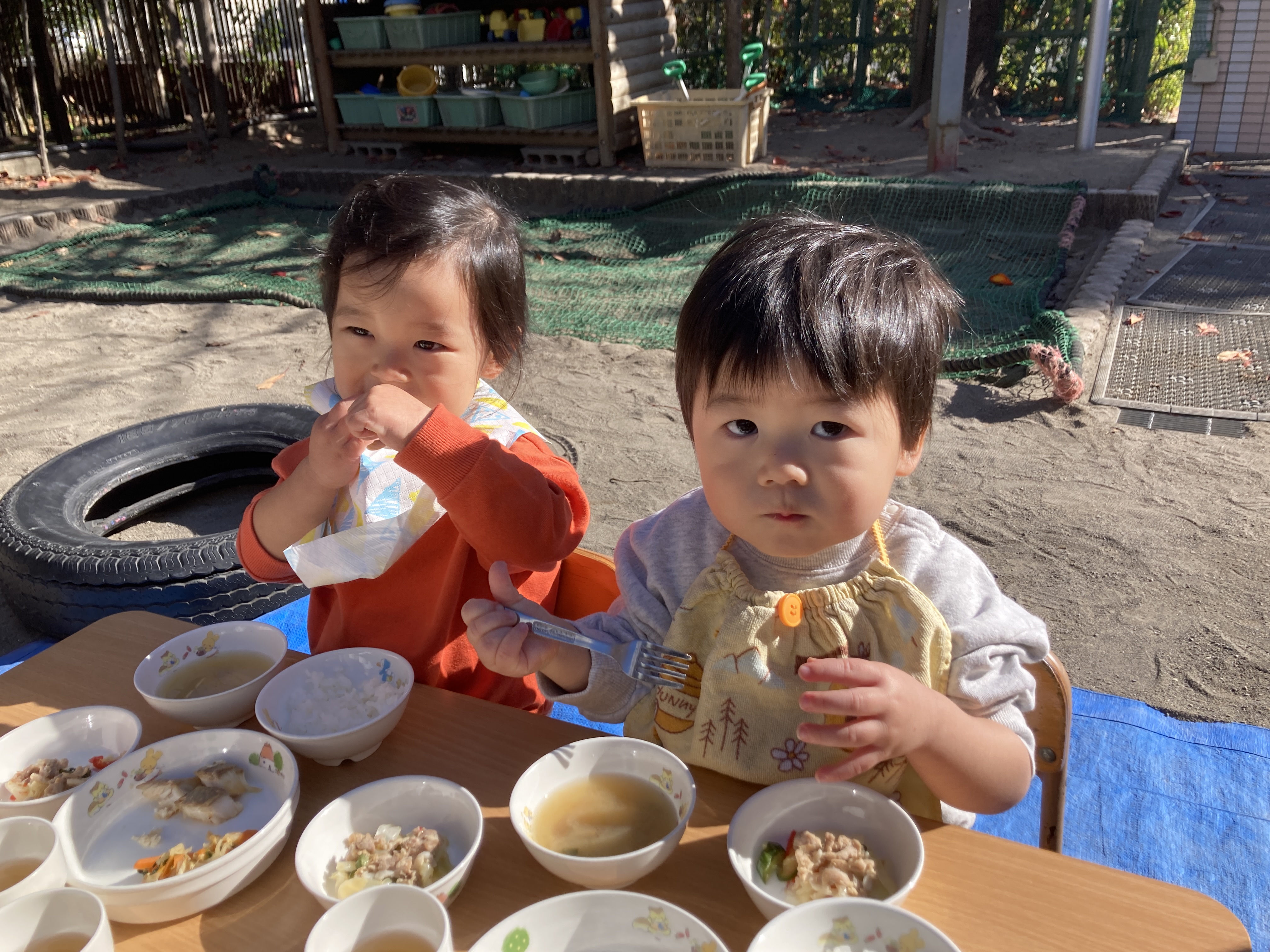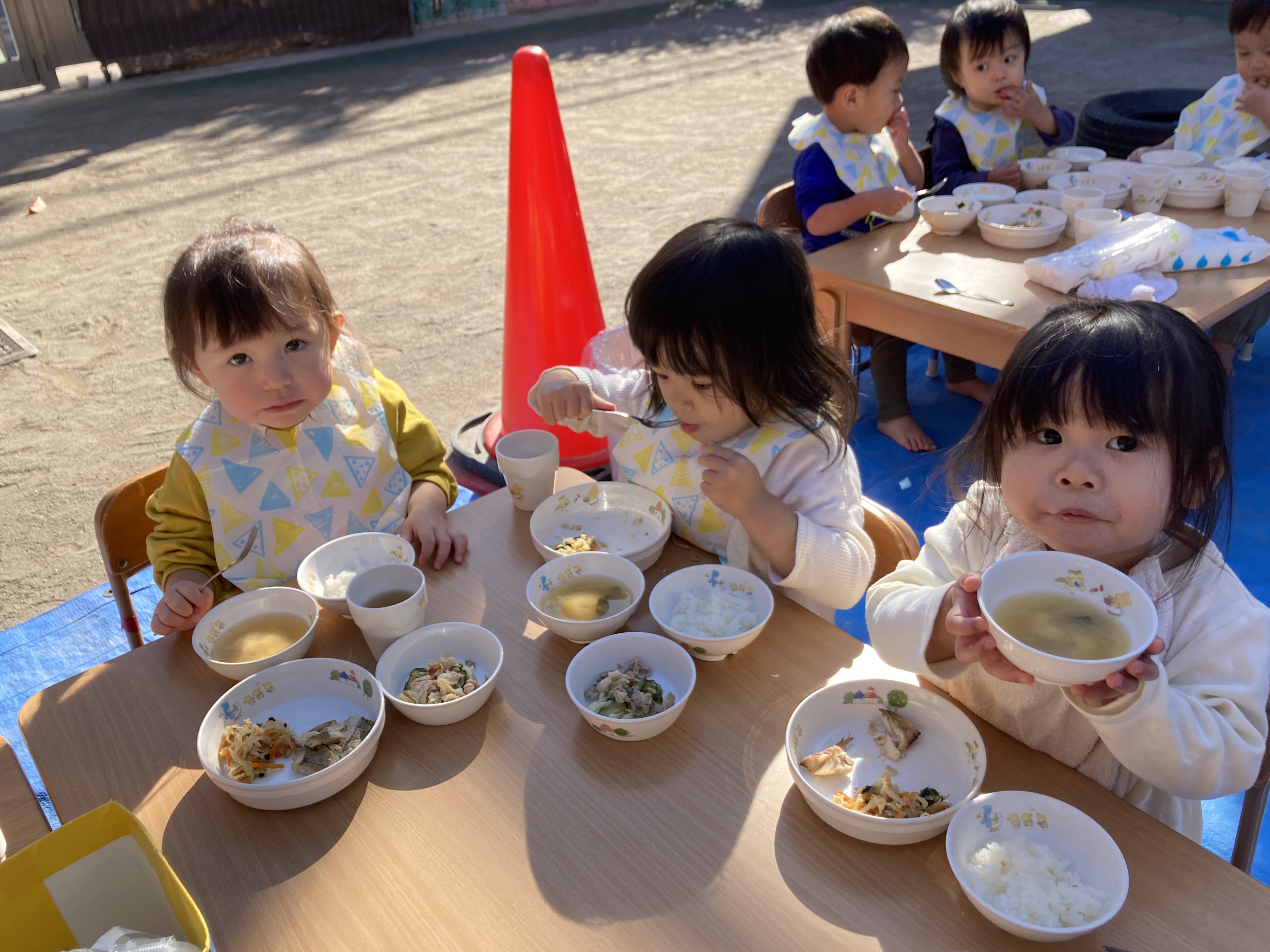 初めて園庭で食べたので、いつもと違う雰囲気に不思議そうにする姿もありましたが、暖かい日差しの中でみんなで食べる給食は楽しかったようで、ご機嫌で食べている子が多かったです。