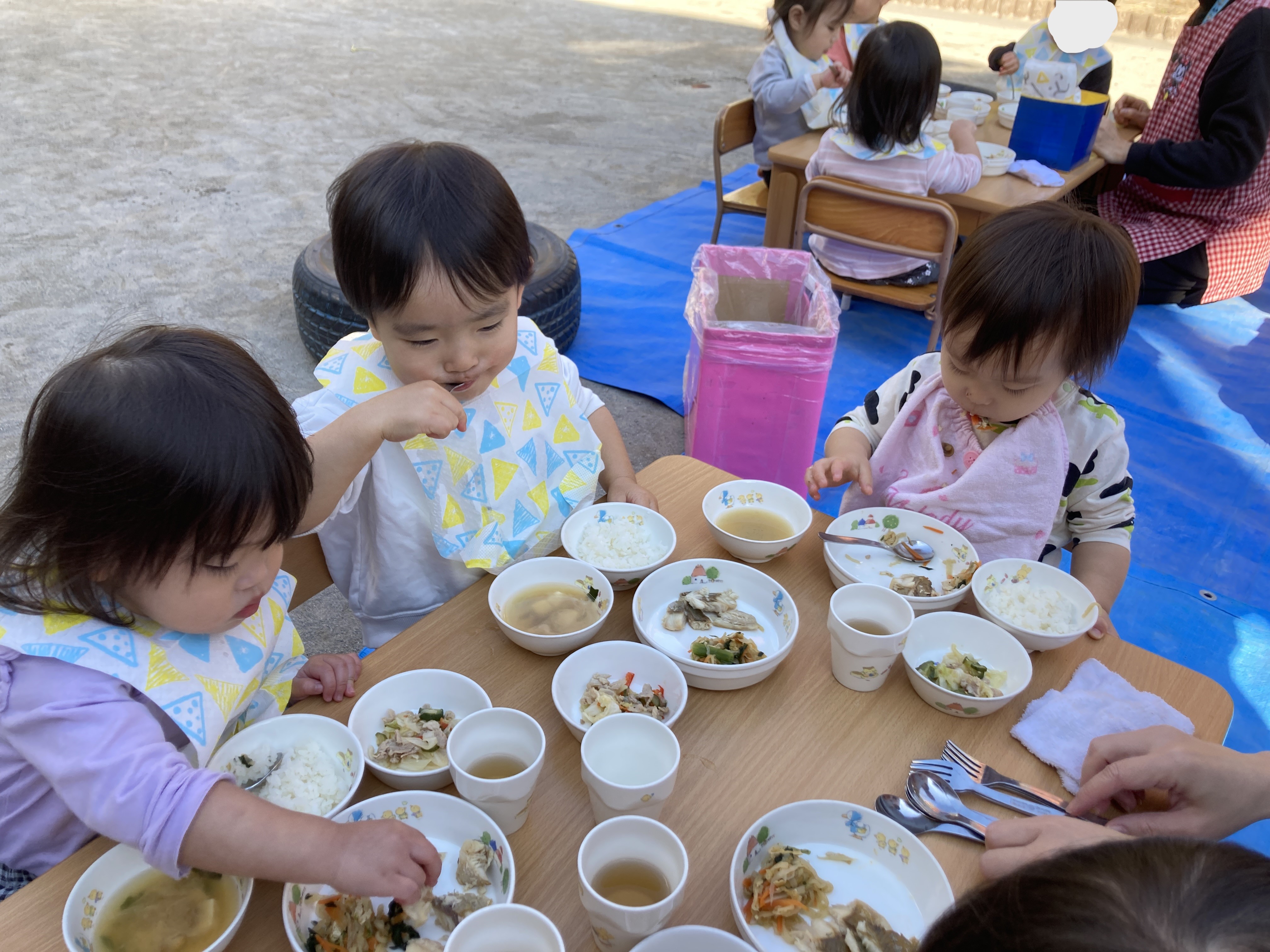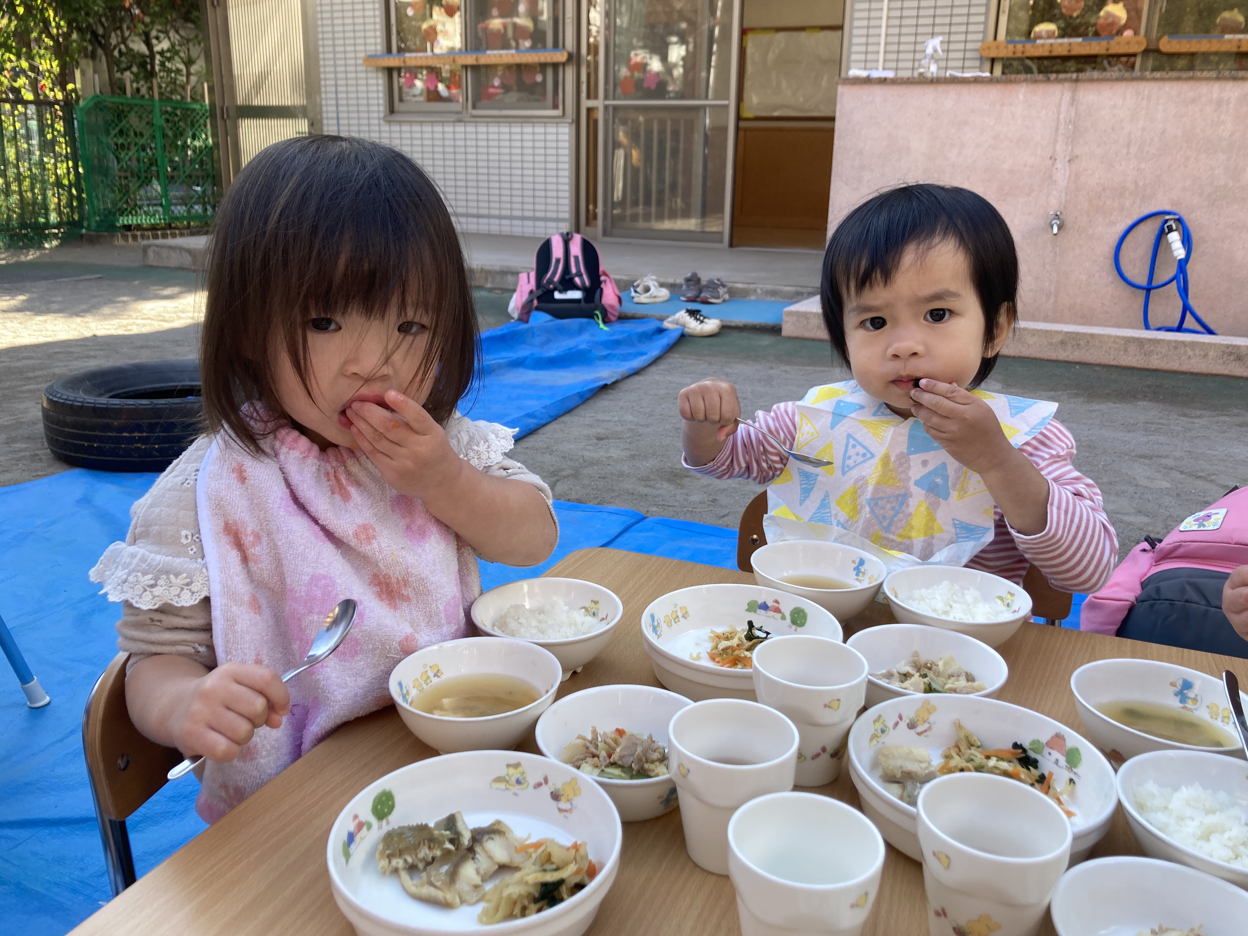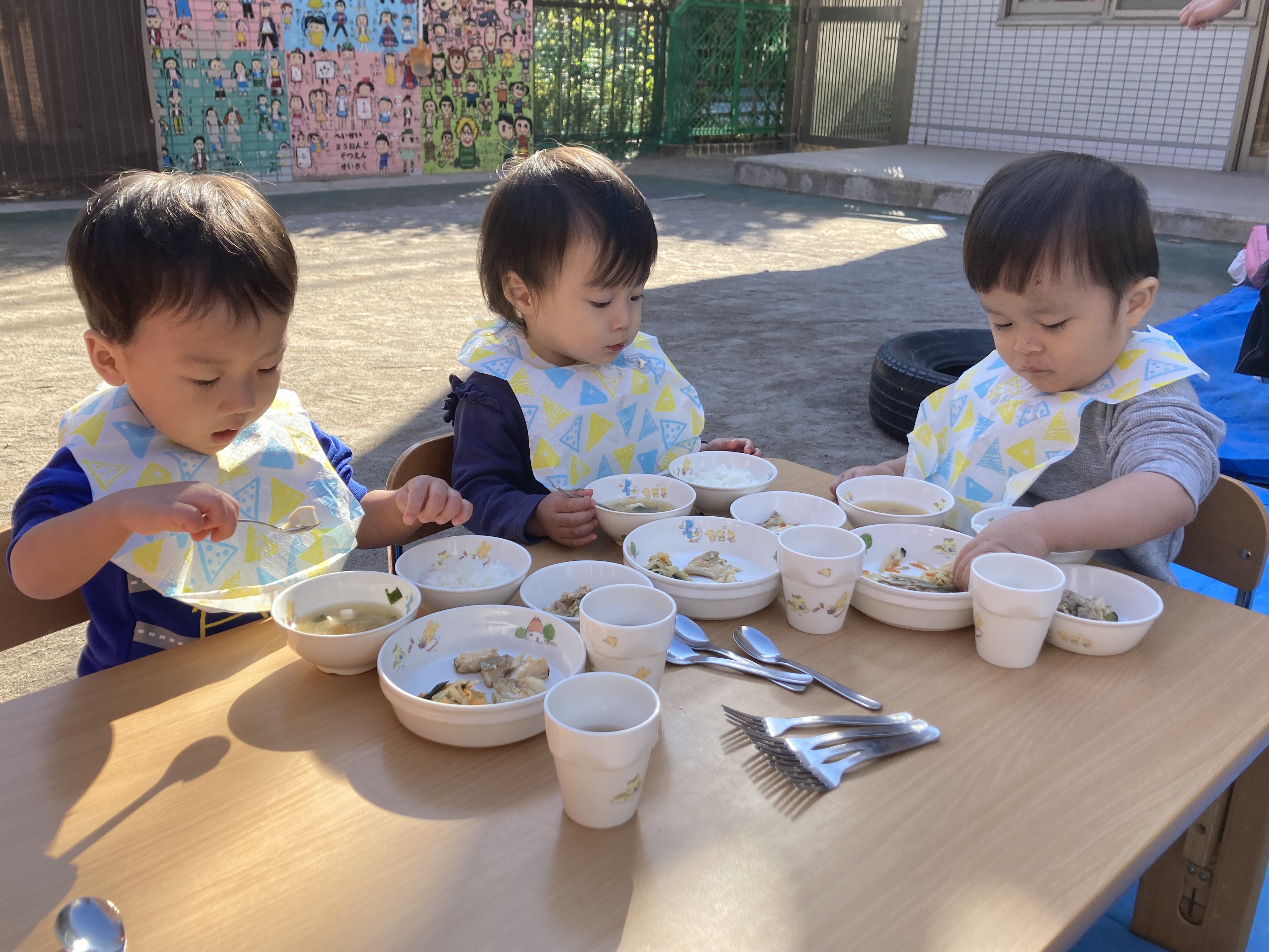 初めて園庭で食べたので、いつもと違う雰囲気に不思議そうにする姿もありましたが、暖かい日差しの中でみんなで食べる給食は楽しかったようで、ご機嫌で食べている子が多かったです。