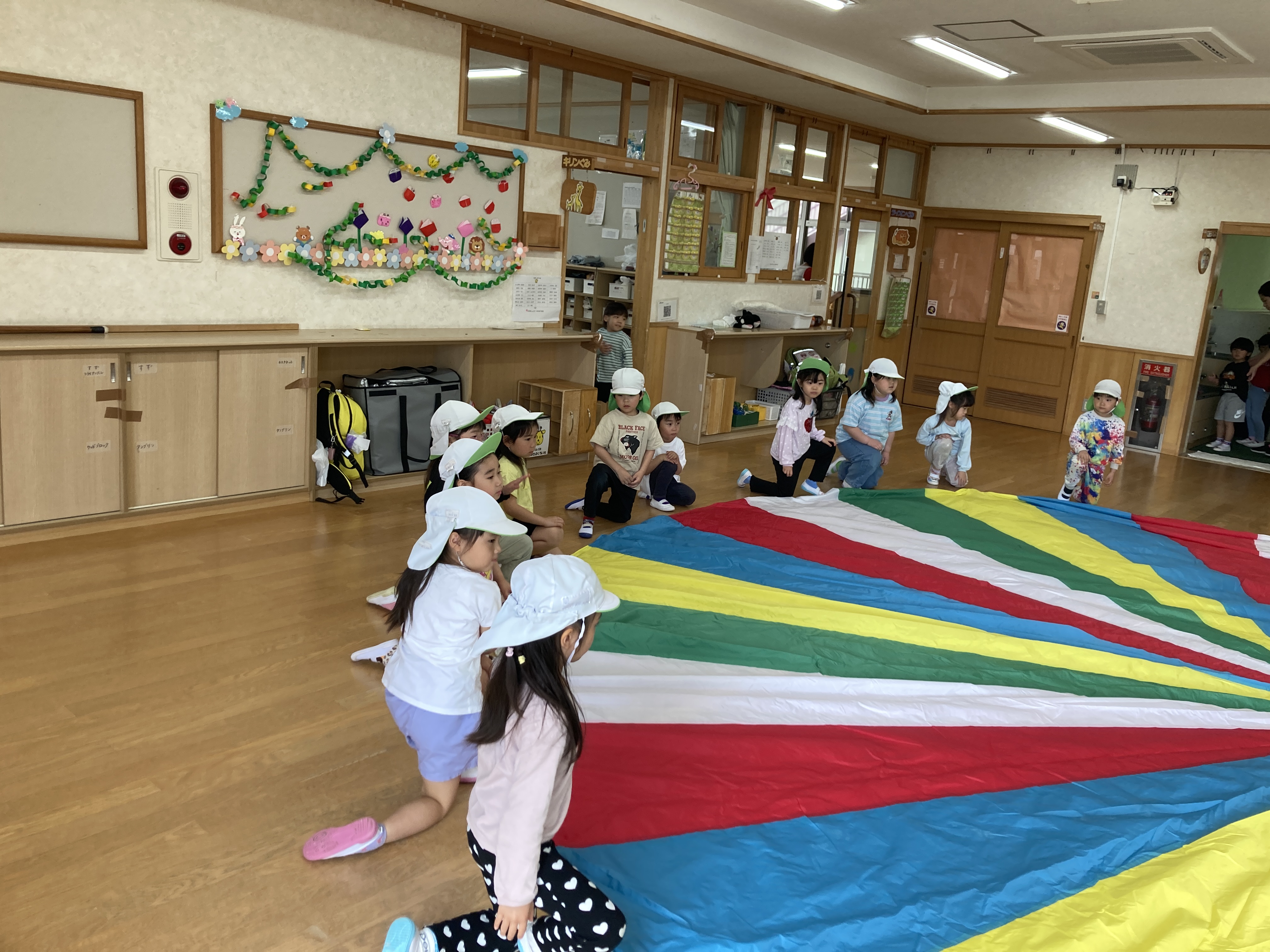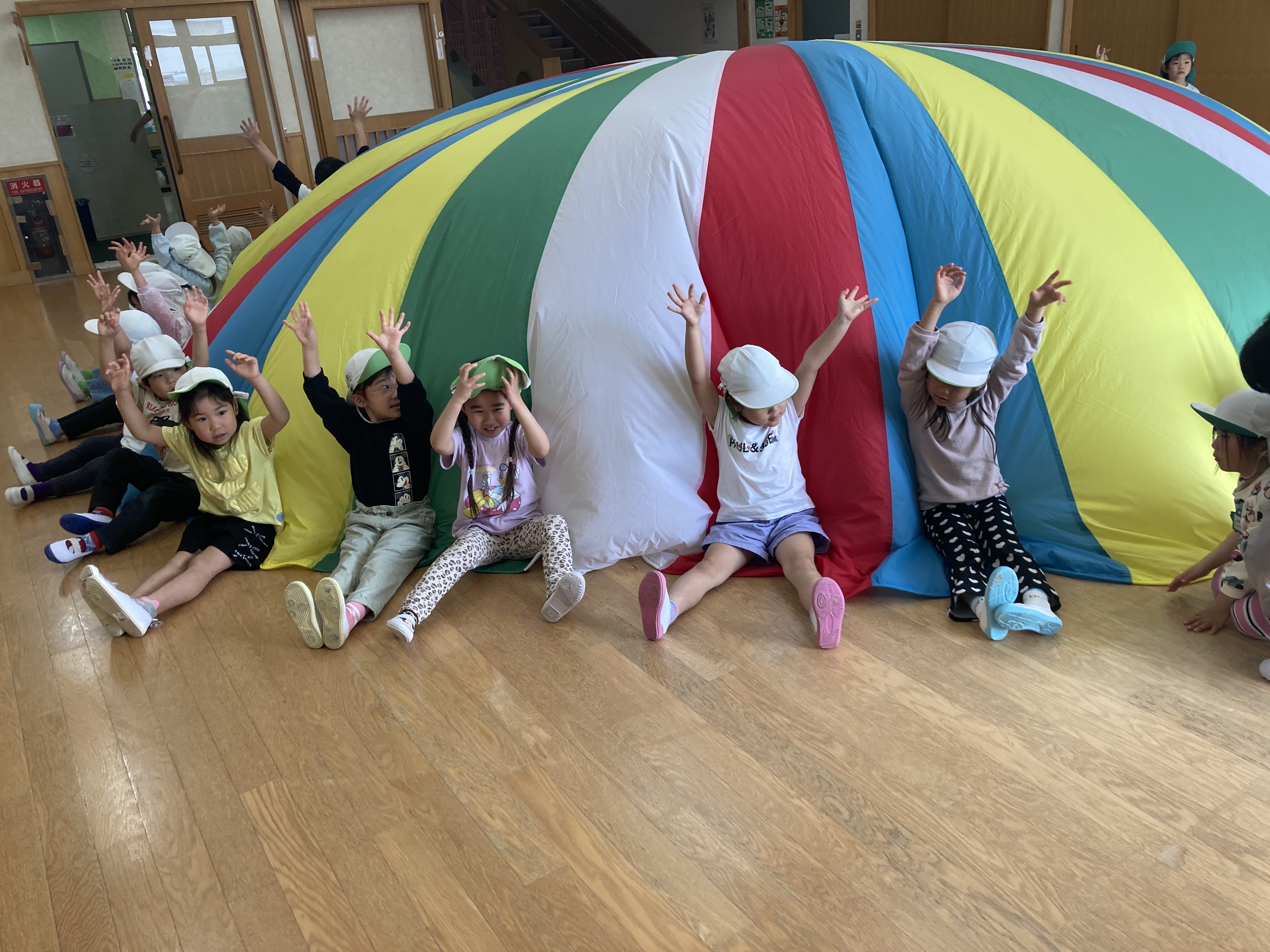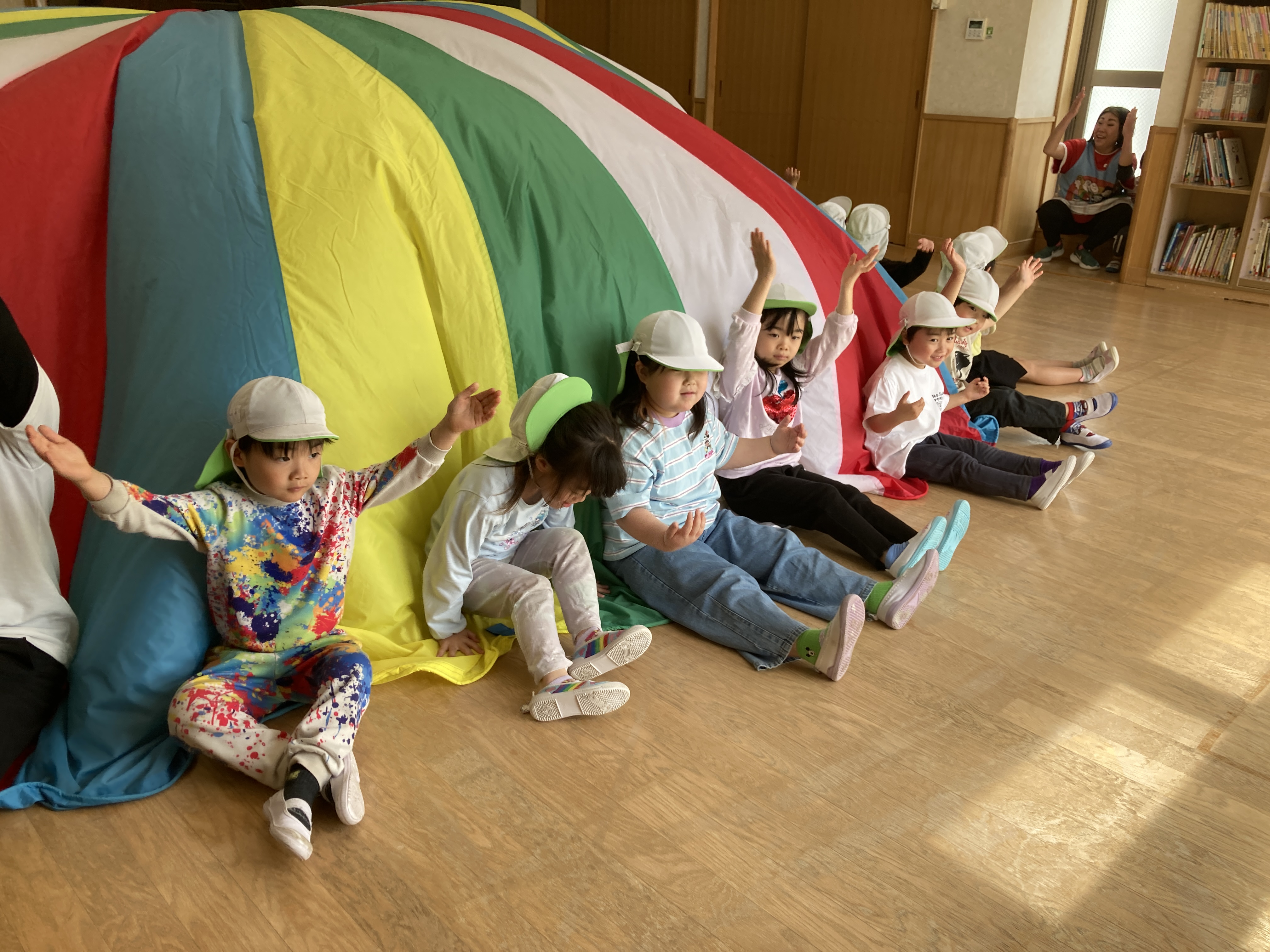 AチームとBチームに分かれてパラバルーンをしました。みんなで協力して波やお家、メリーゴーランドも上手に決まっていました。