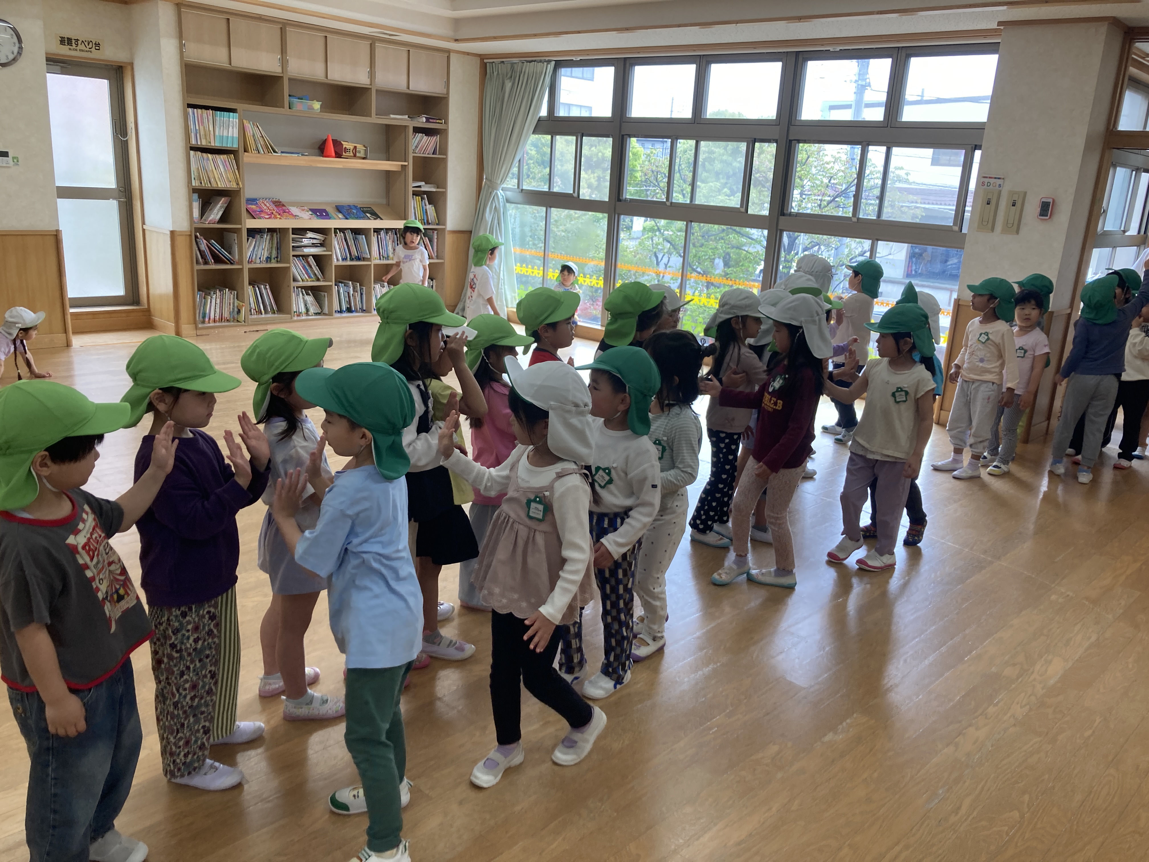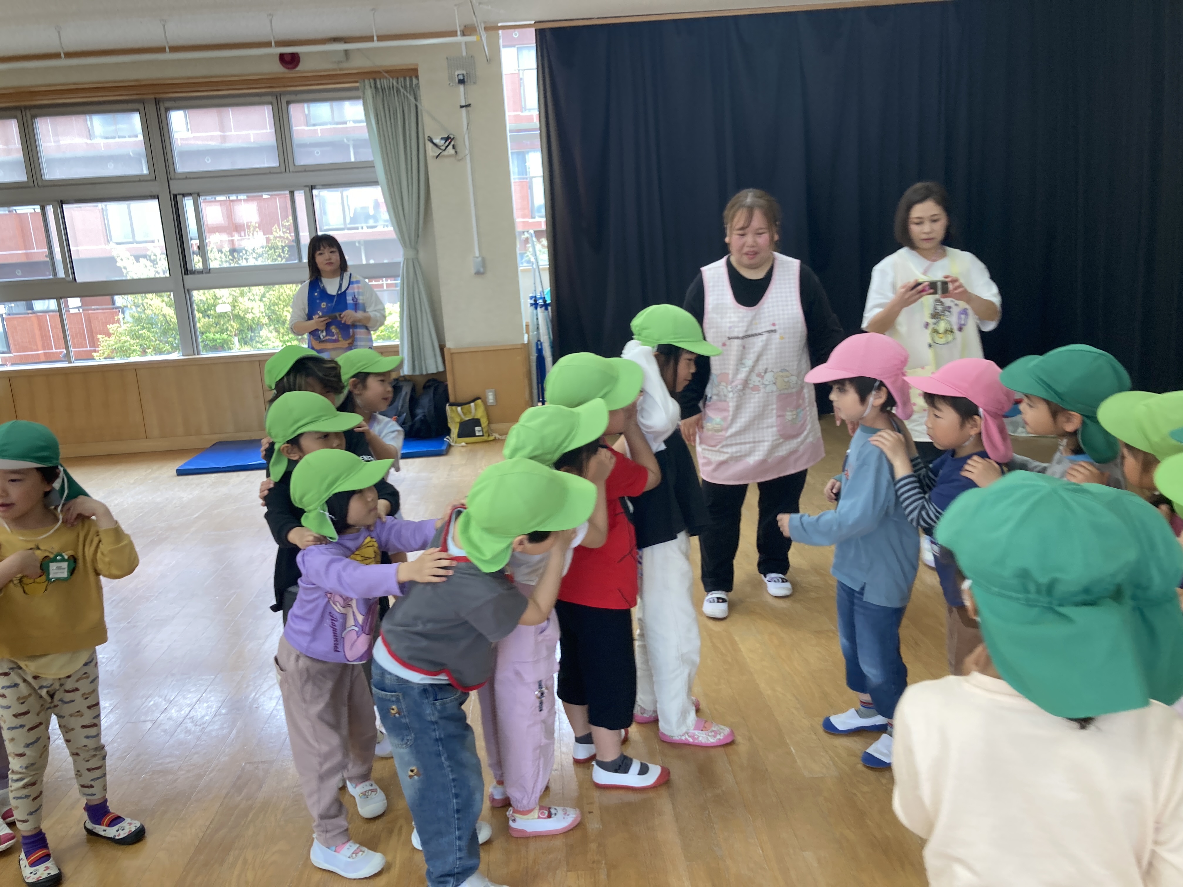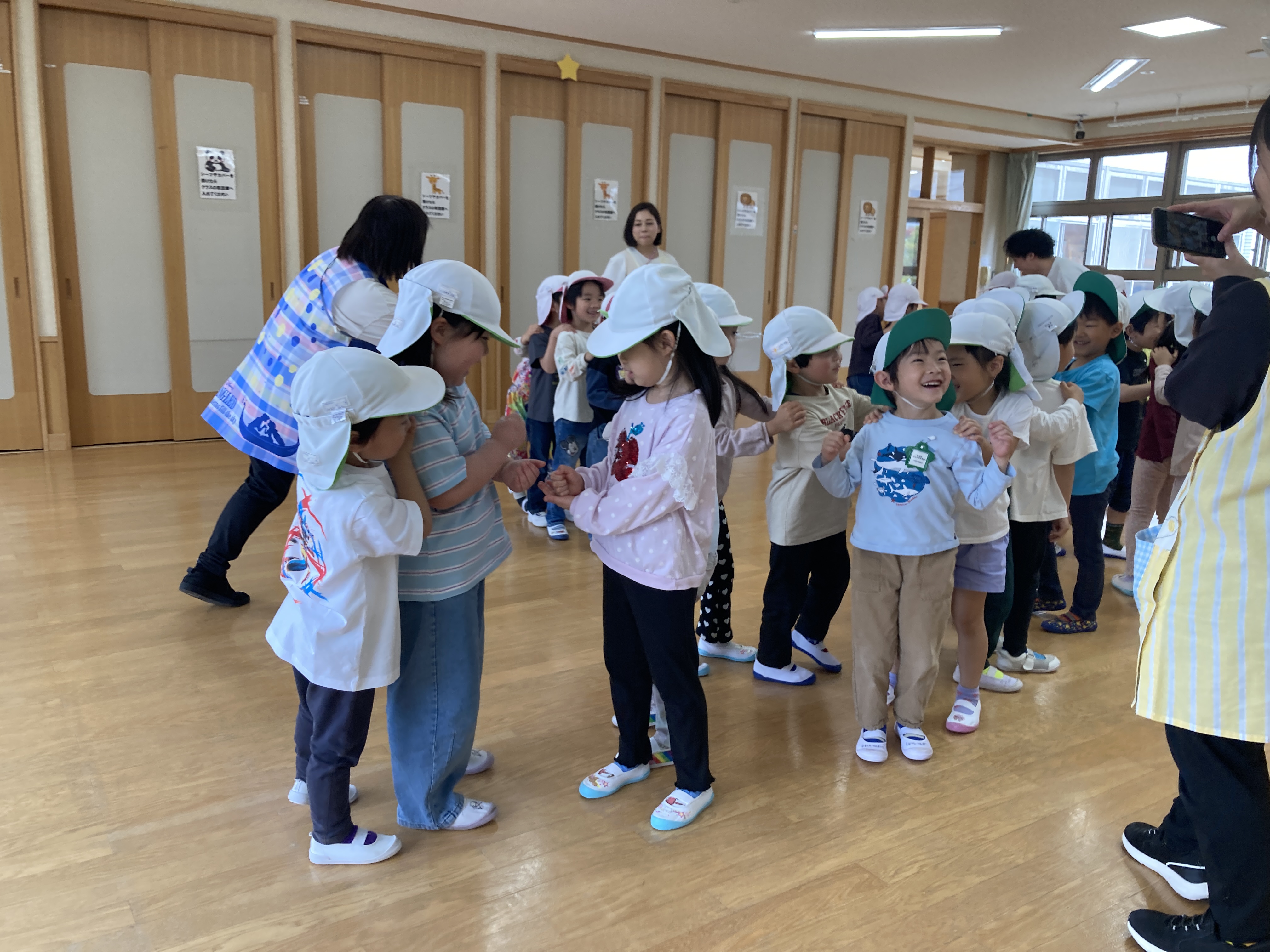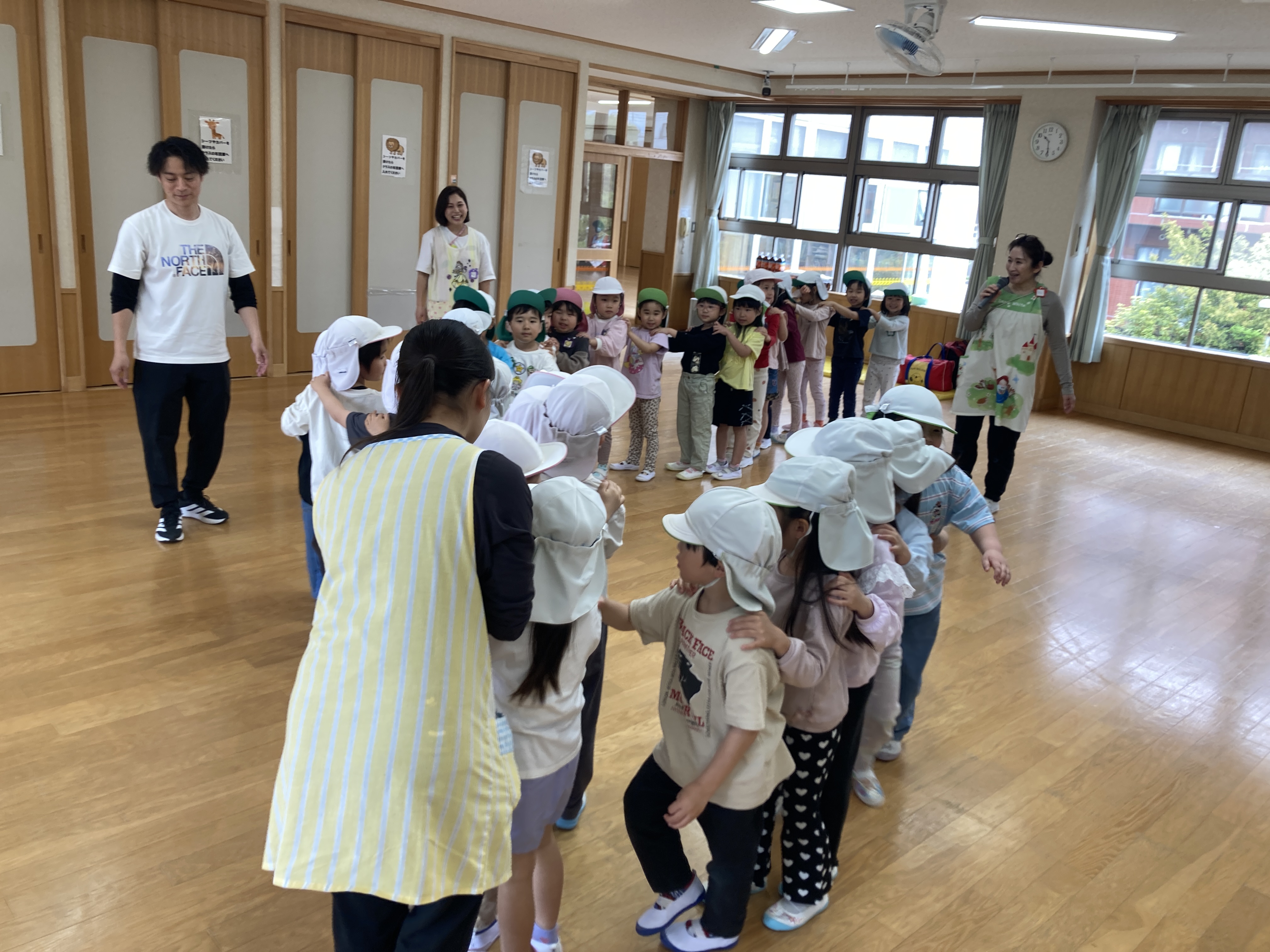 最後には長い列車になって1番前のお友達を発表すると自然と拍手が出ていました。