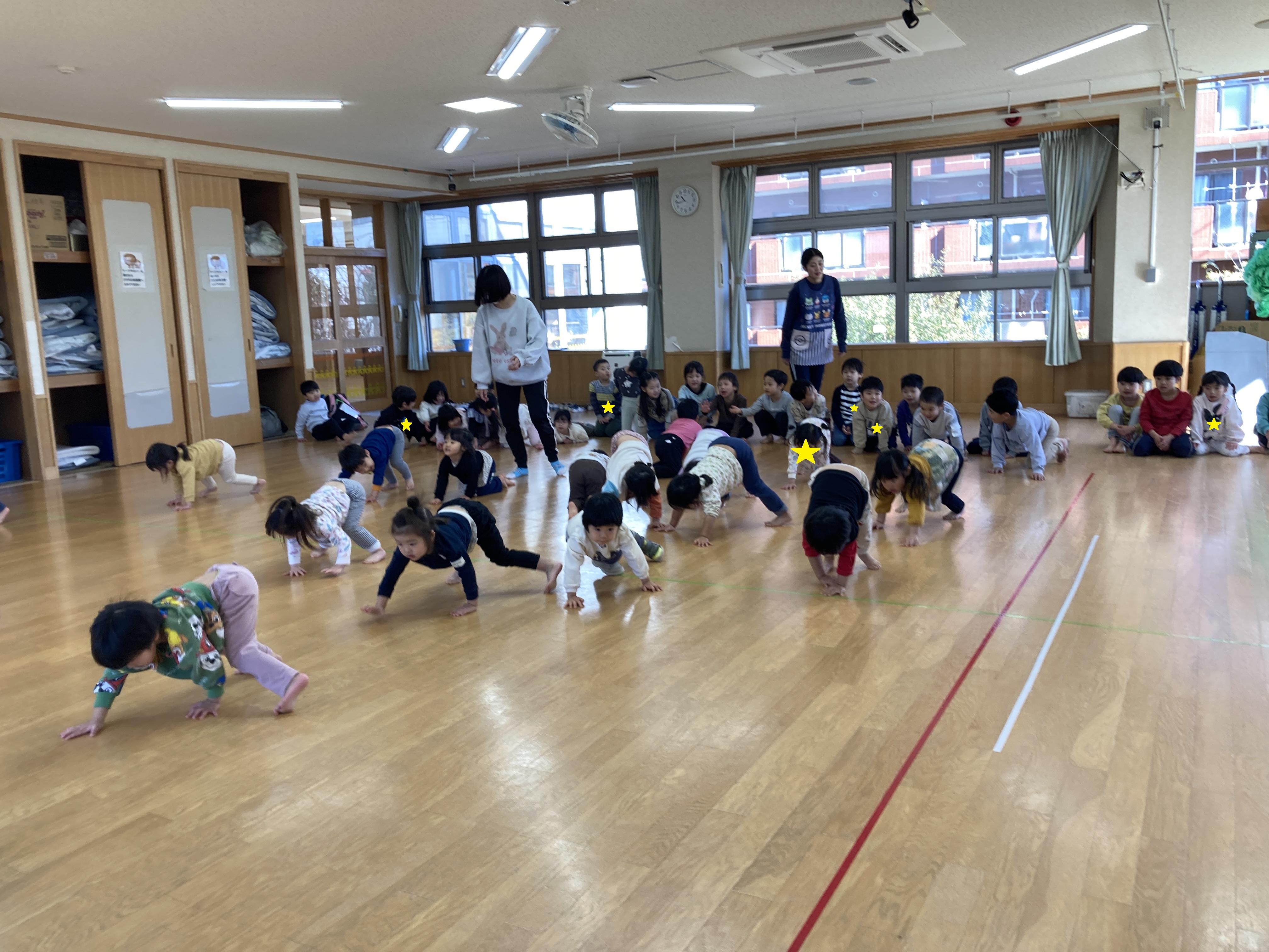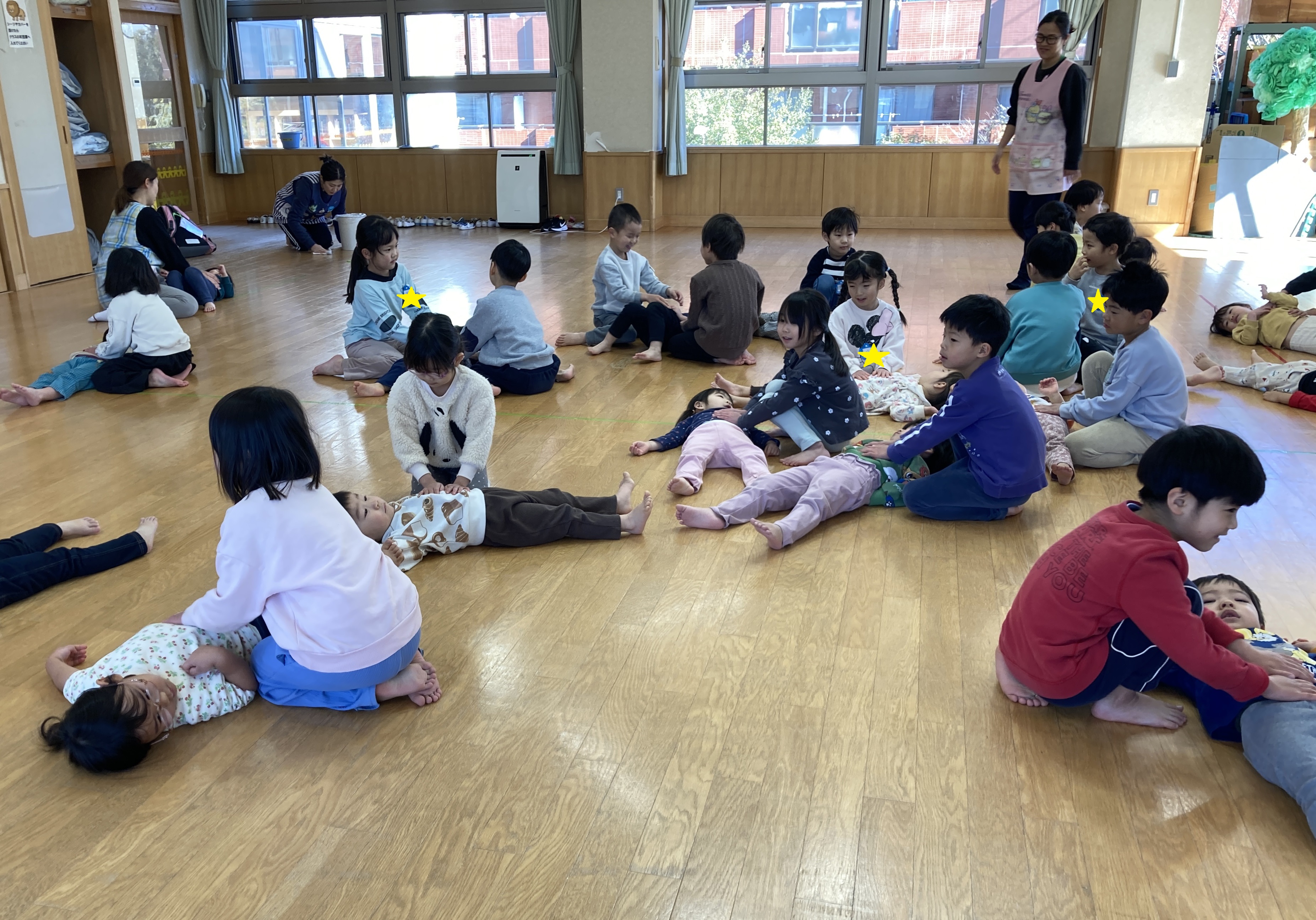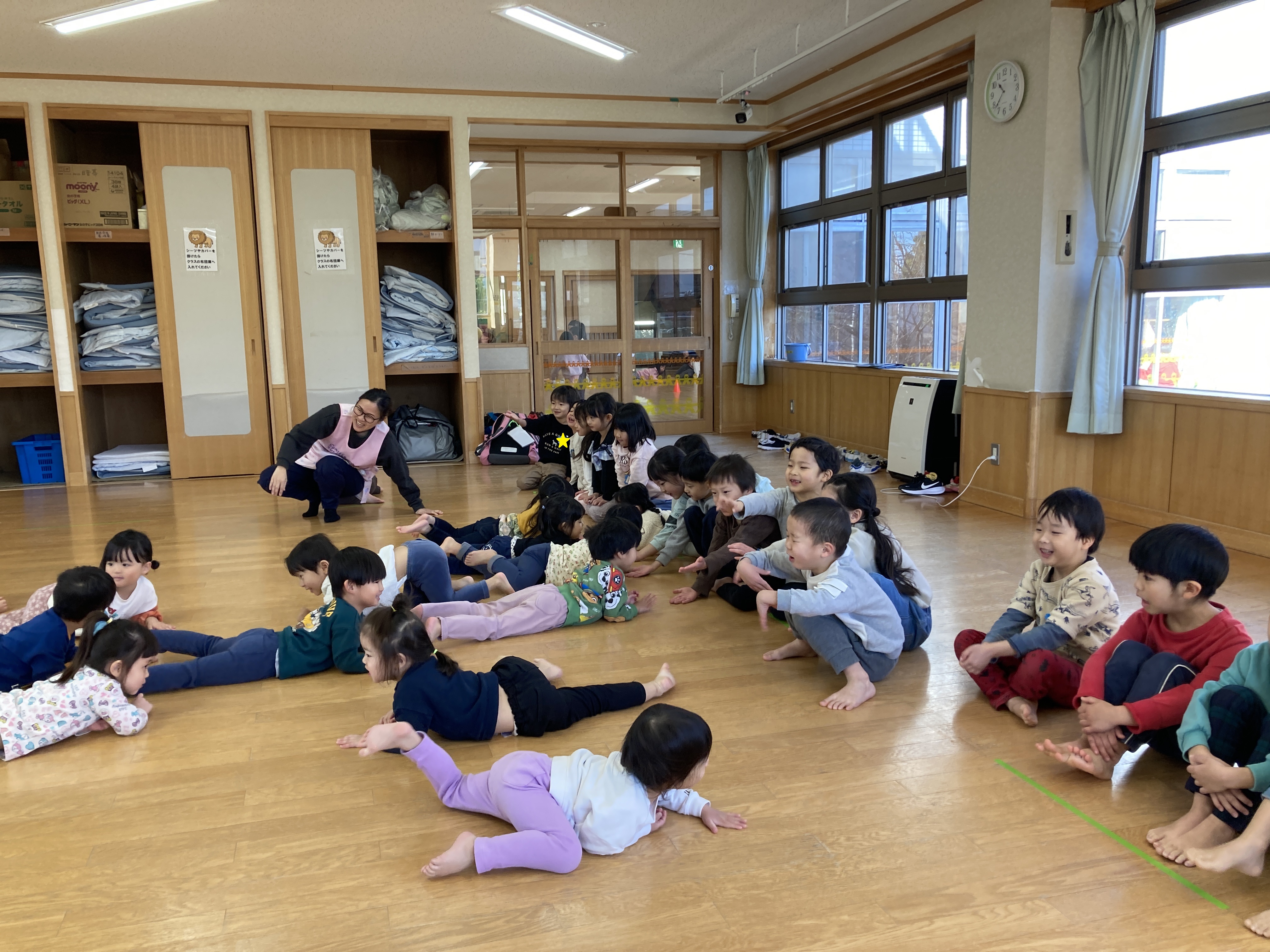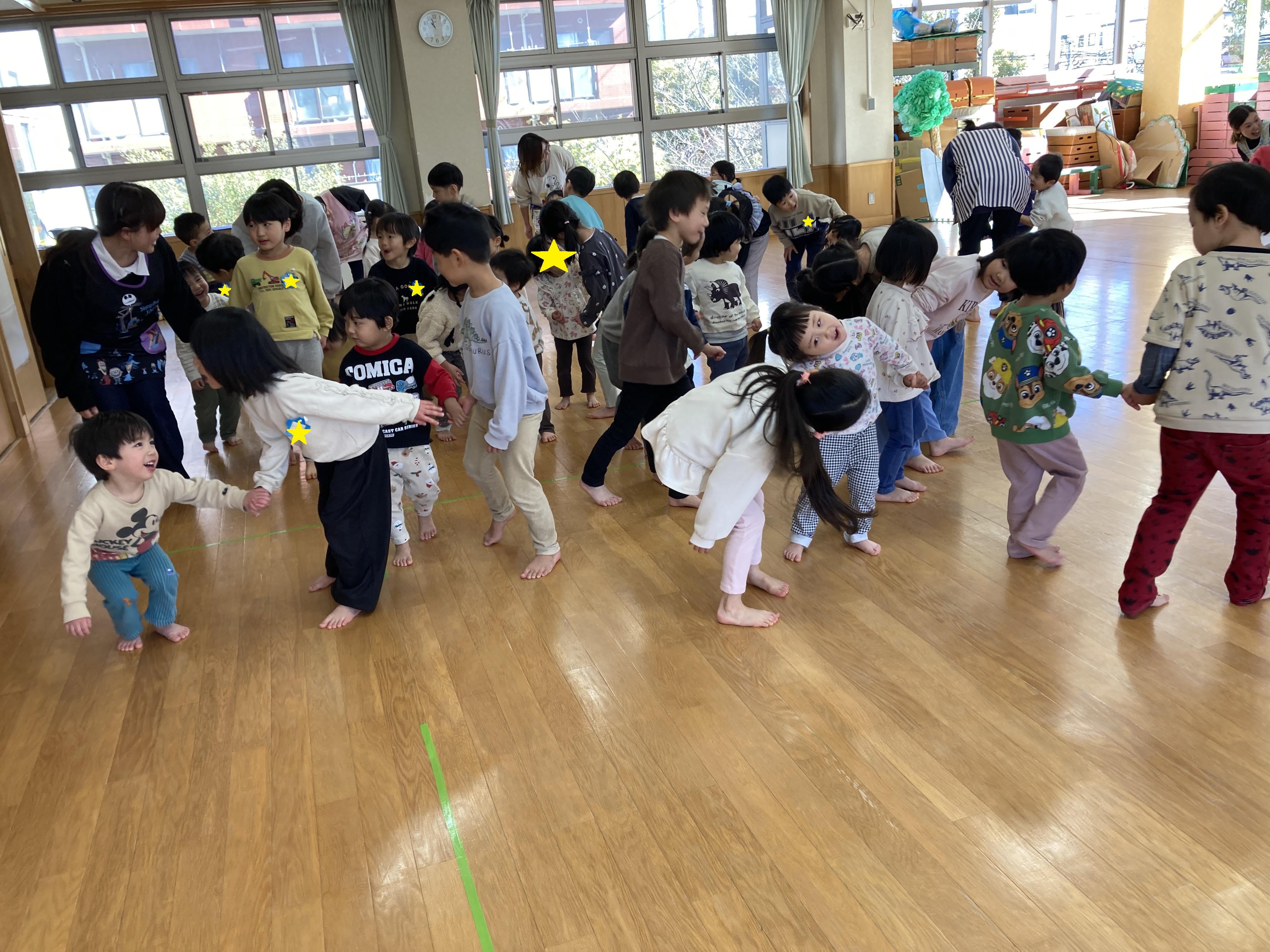 今日はホールでらいおん組とリズム遊びをしました。