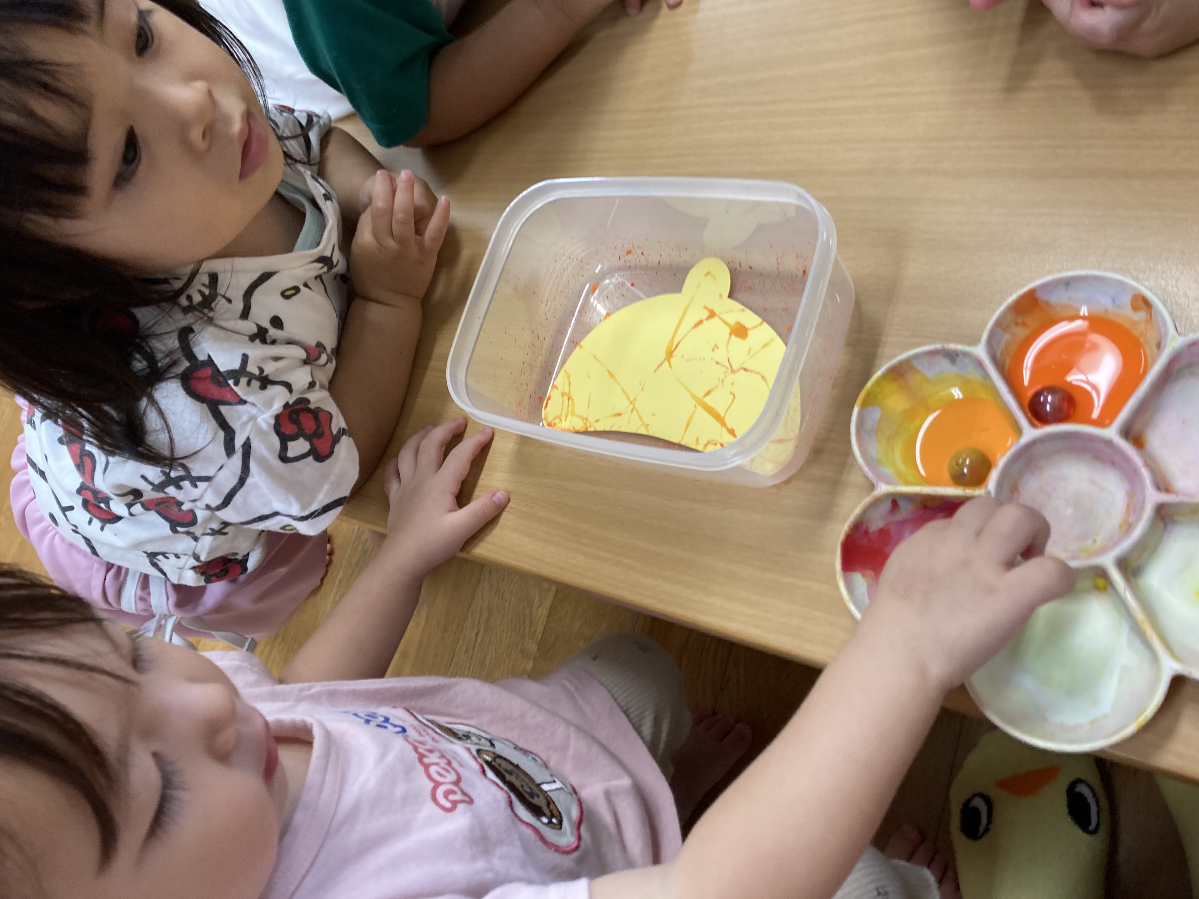そんなどんぐりが大好きな子どもたち。製作でもどんぐりを作ろうと、絵の具のついたビー玉を転がして、どんぐりの帽子に模様をつけて、世界に一つだけの可愛らしいどんぐりを作りました!