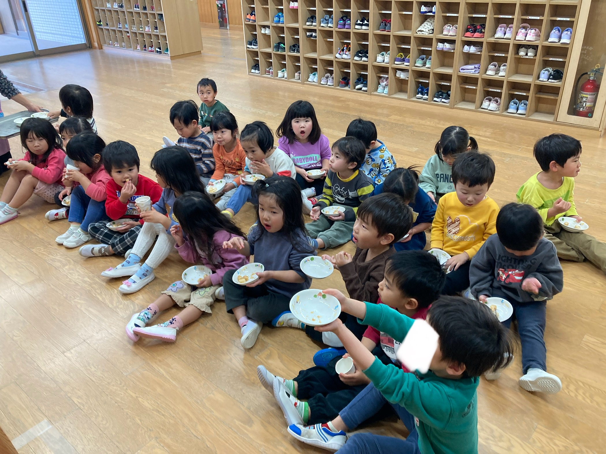↑災害時を想定し、ぱんだ組ではおやつを玄関ホールで食べました。
