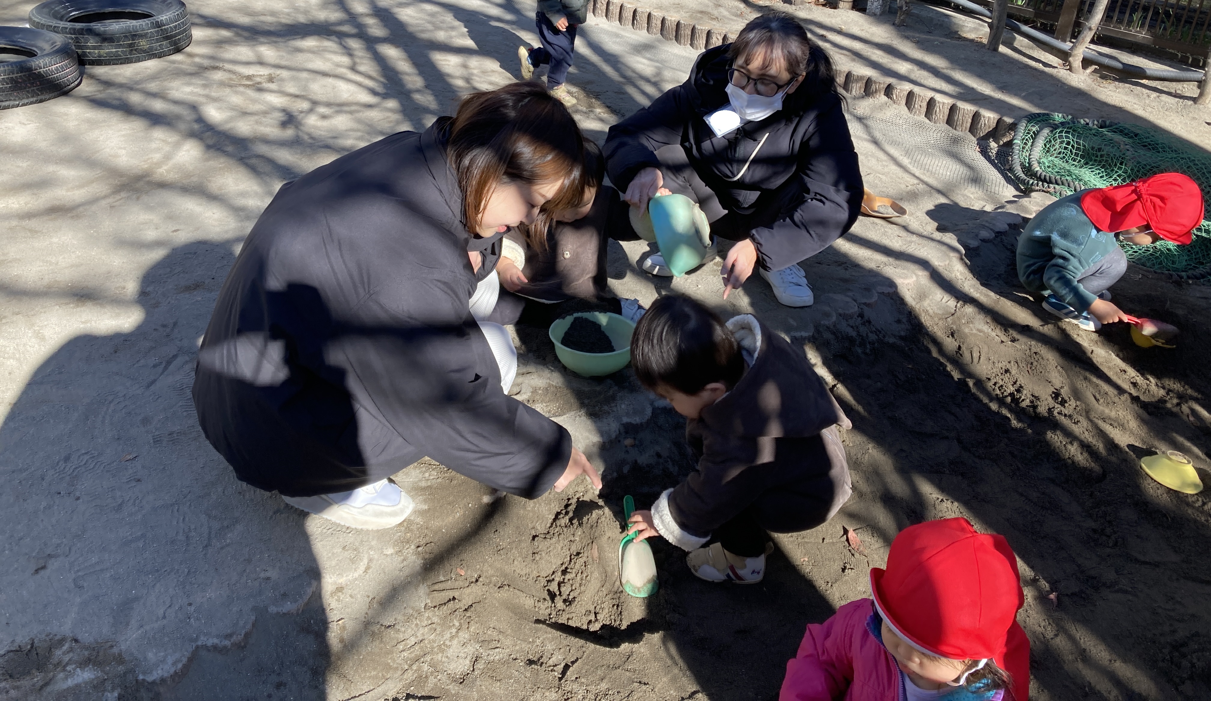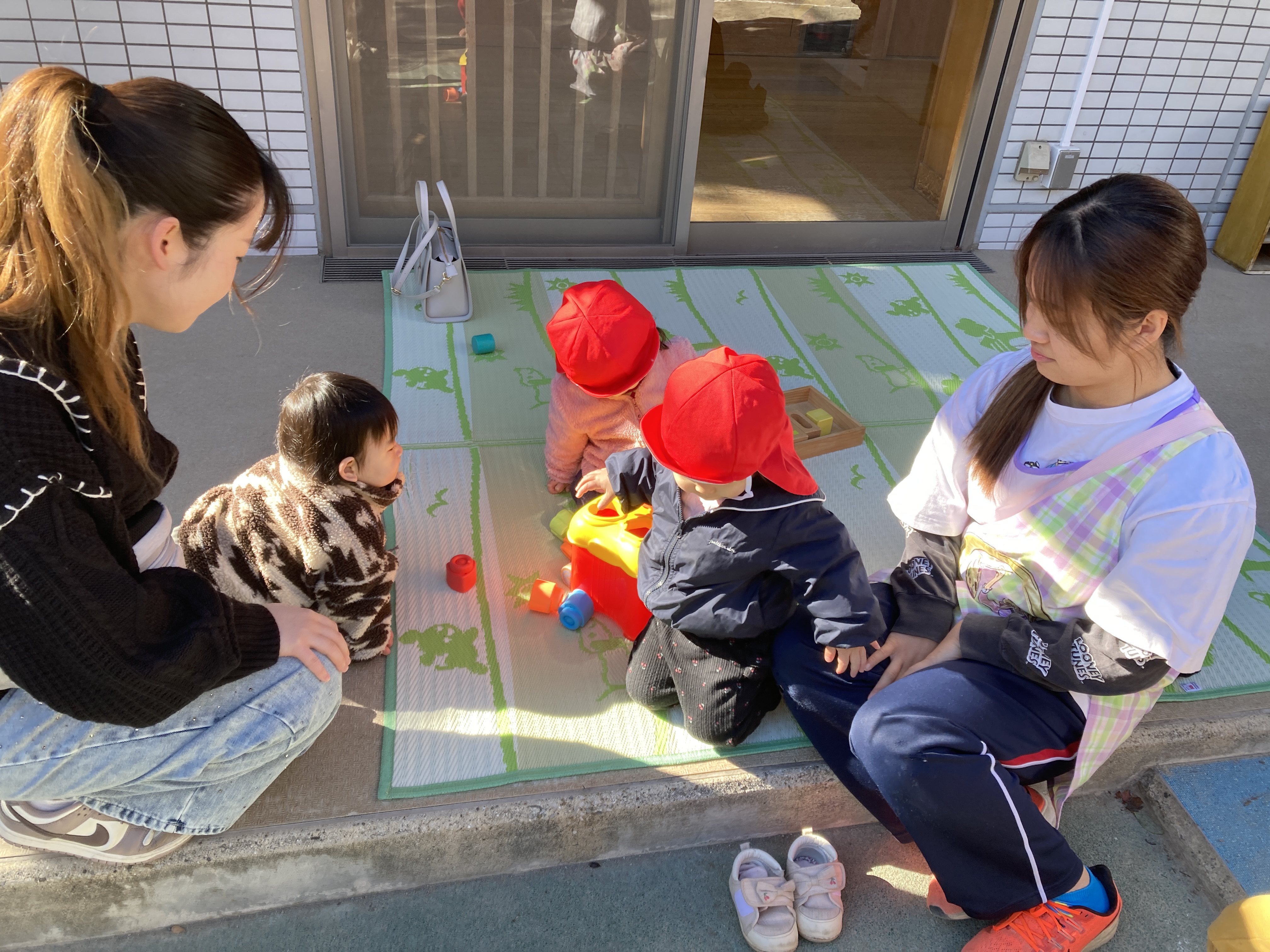 1月になり風が冷たく感じますが、1歳児ひよこ組と一緒に園庭遊びを体験していただきました。