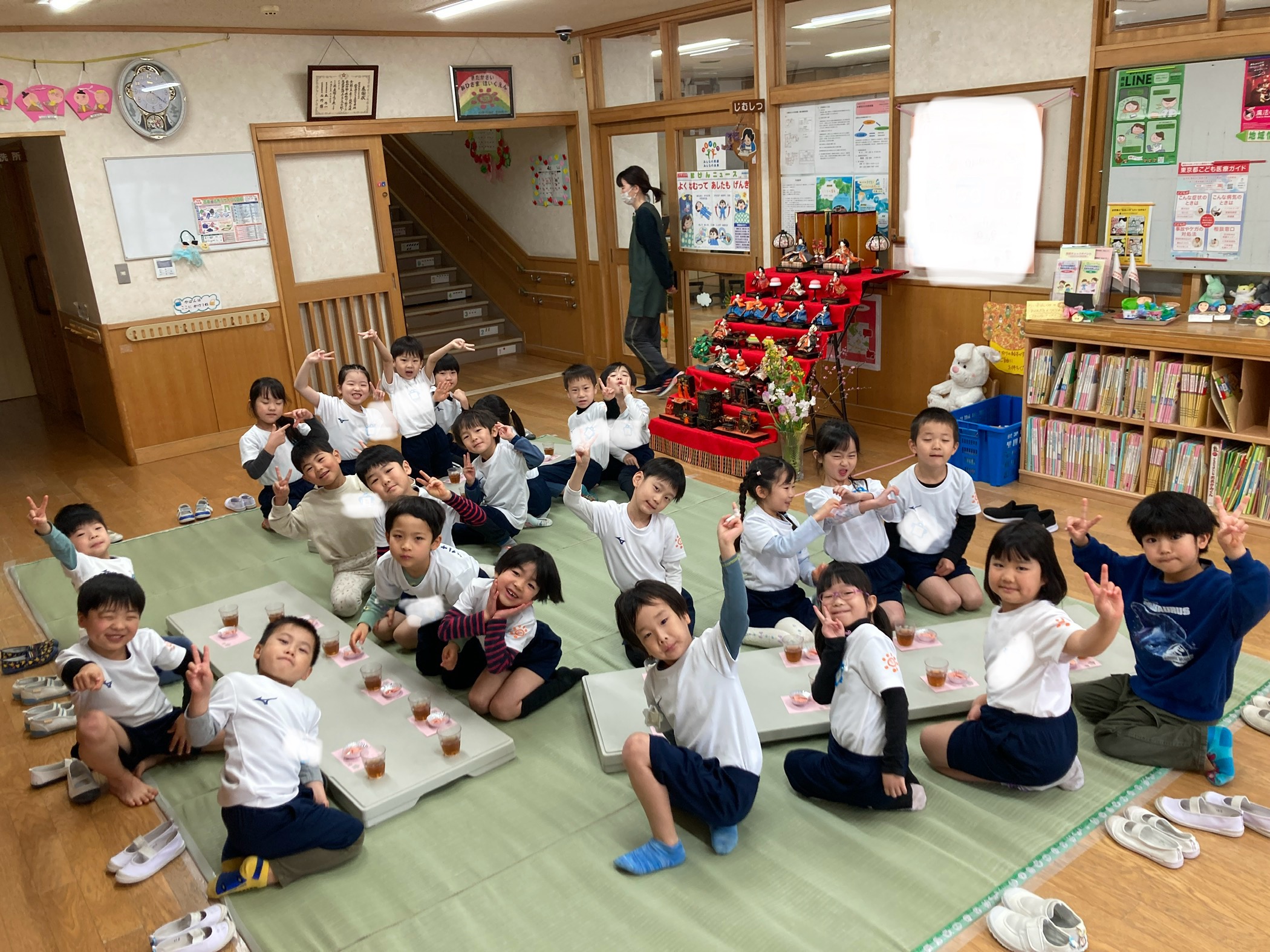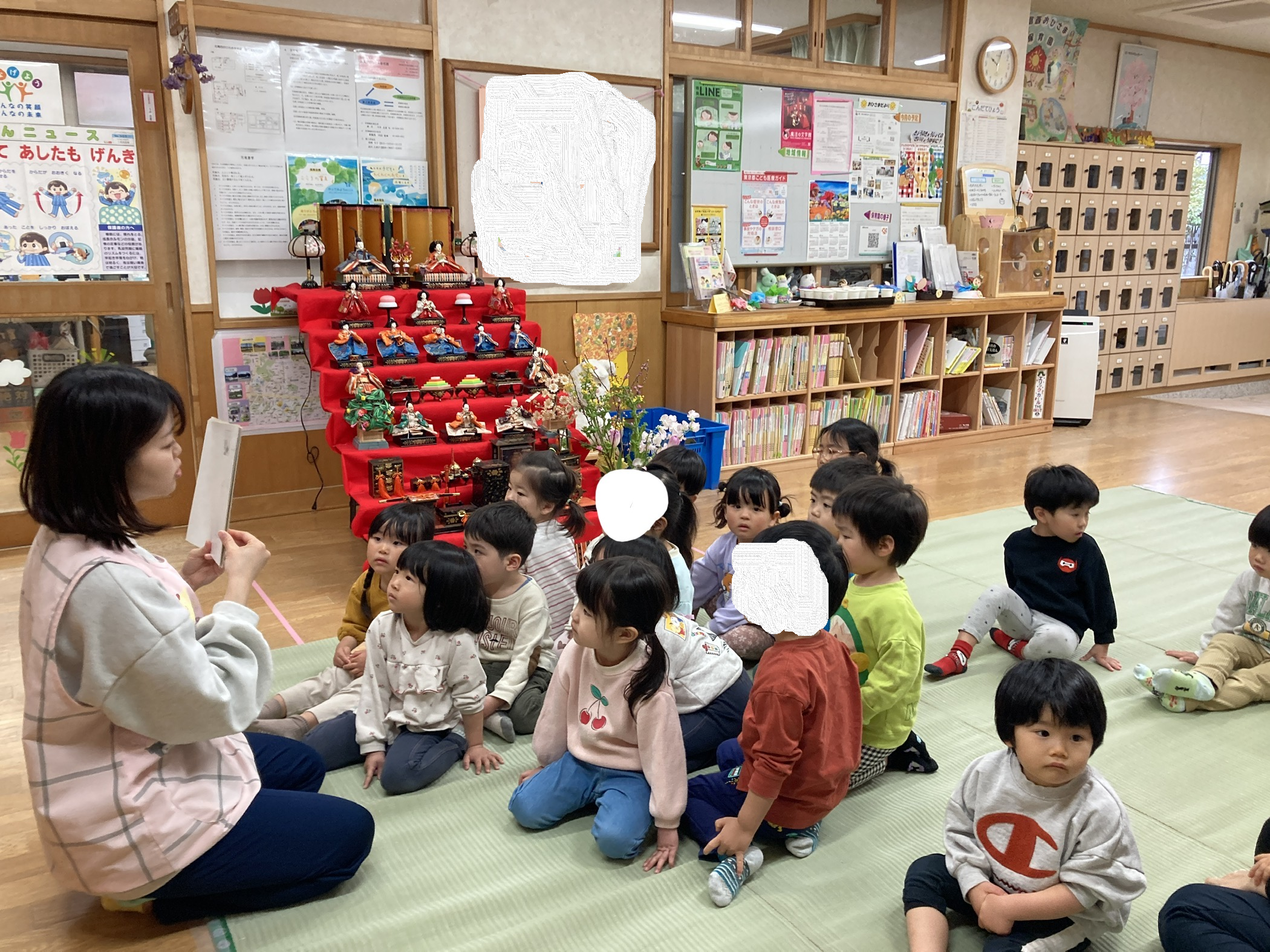 玄関ホールに飾っていた雛段飾りの前で、各クラスで、ひな祭りについて由来のお話を聞いたり、おひな菓子を食べたりしました。