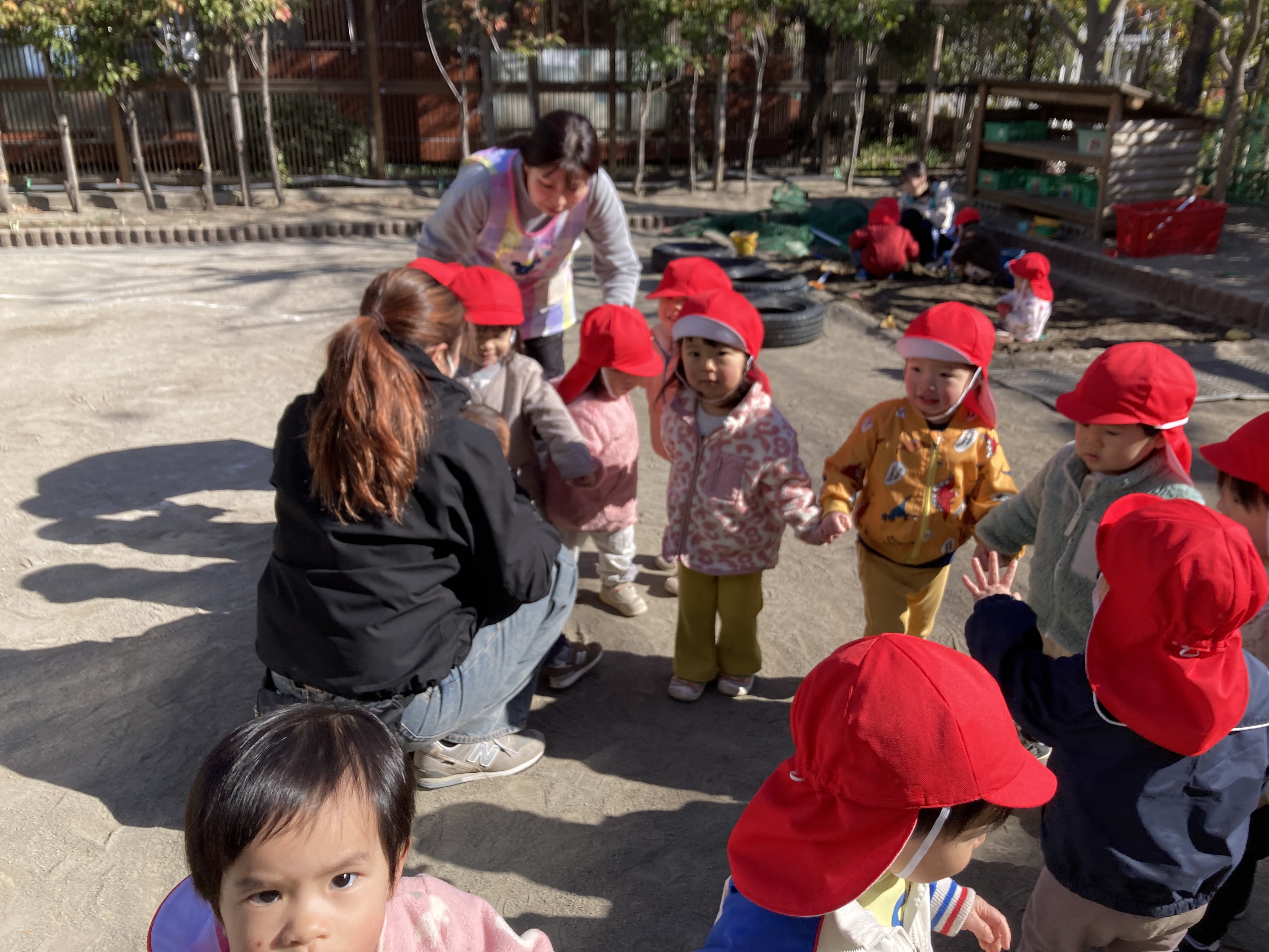 園庭でひよこ組のお友だちが「むっくりくまさん」をしていると、子どもたちの楽しそうな声に誘われ、お母さんとお子さんが同じ輪の中に入って遊んでくれました!