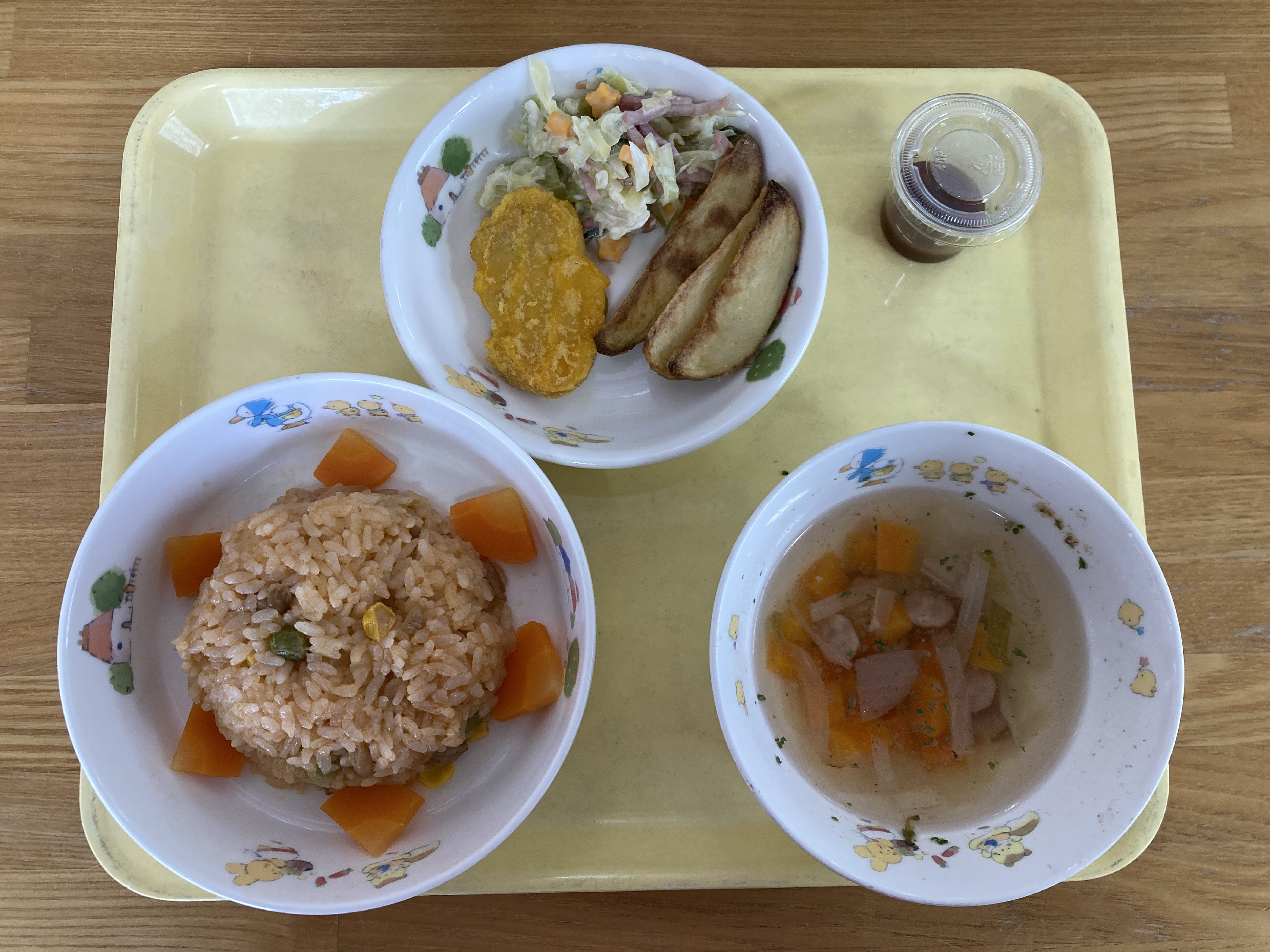 大好きなナゲットやフライドポテトがあり、大喜びの子ども達。おひさまライスを見ると「おひさま保育園のマークだ!」と友達同士、会話を楽しむ姿も見られました。