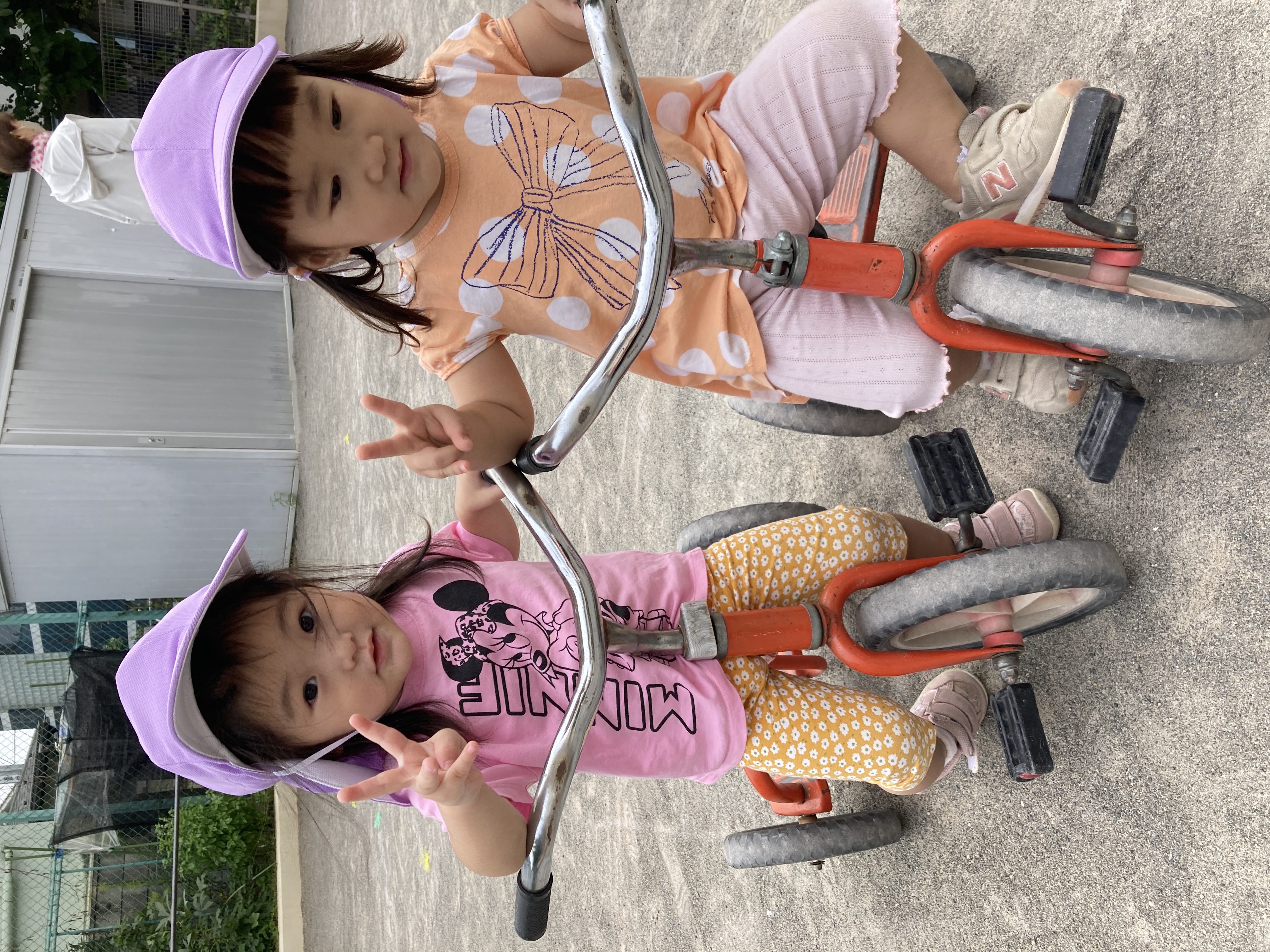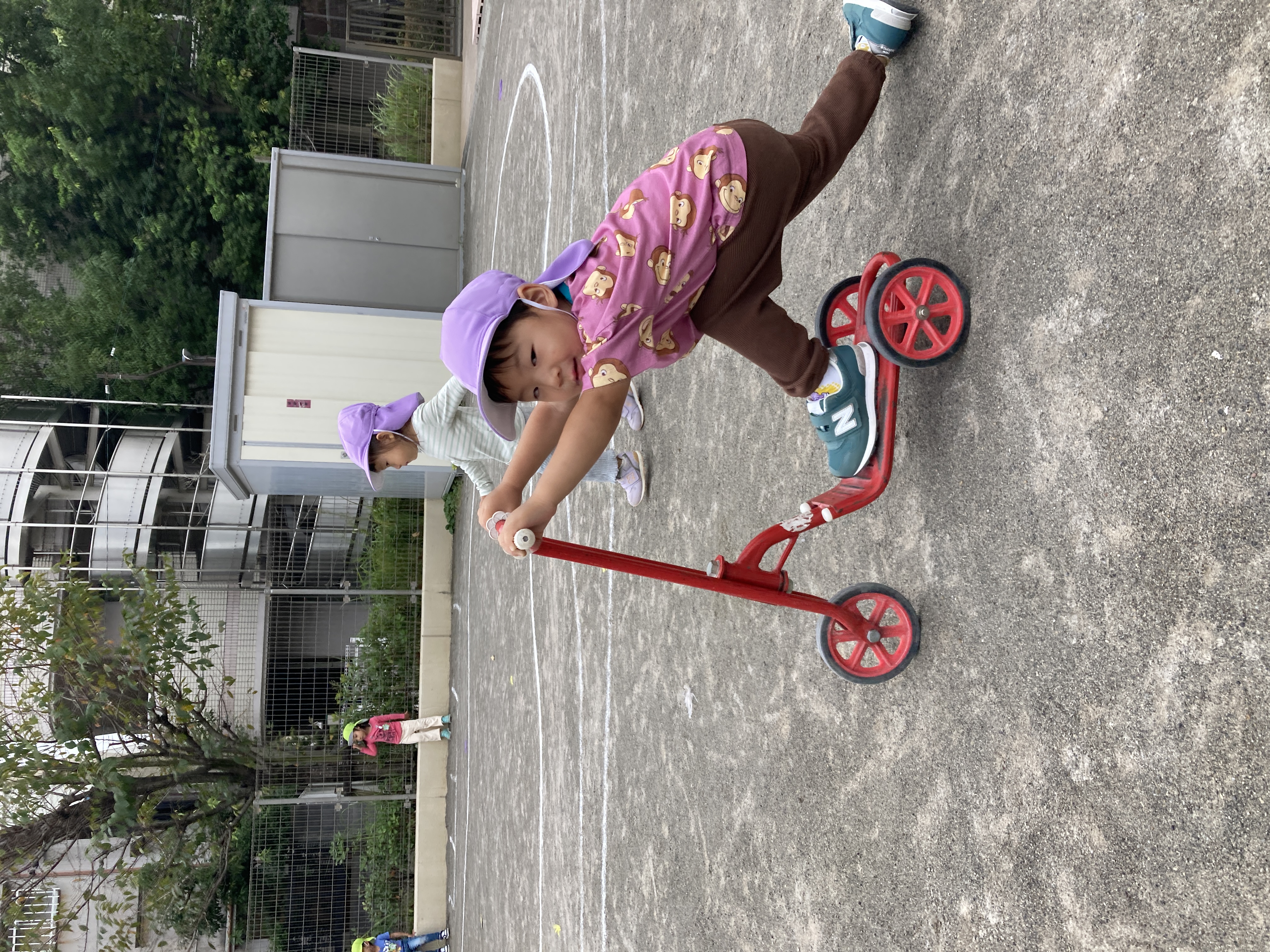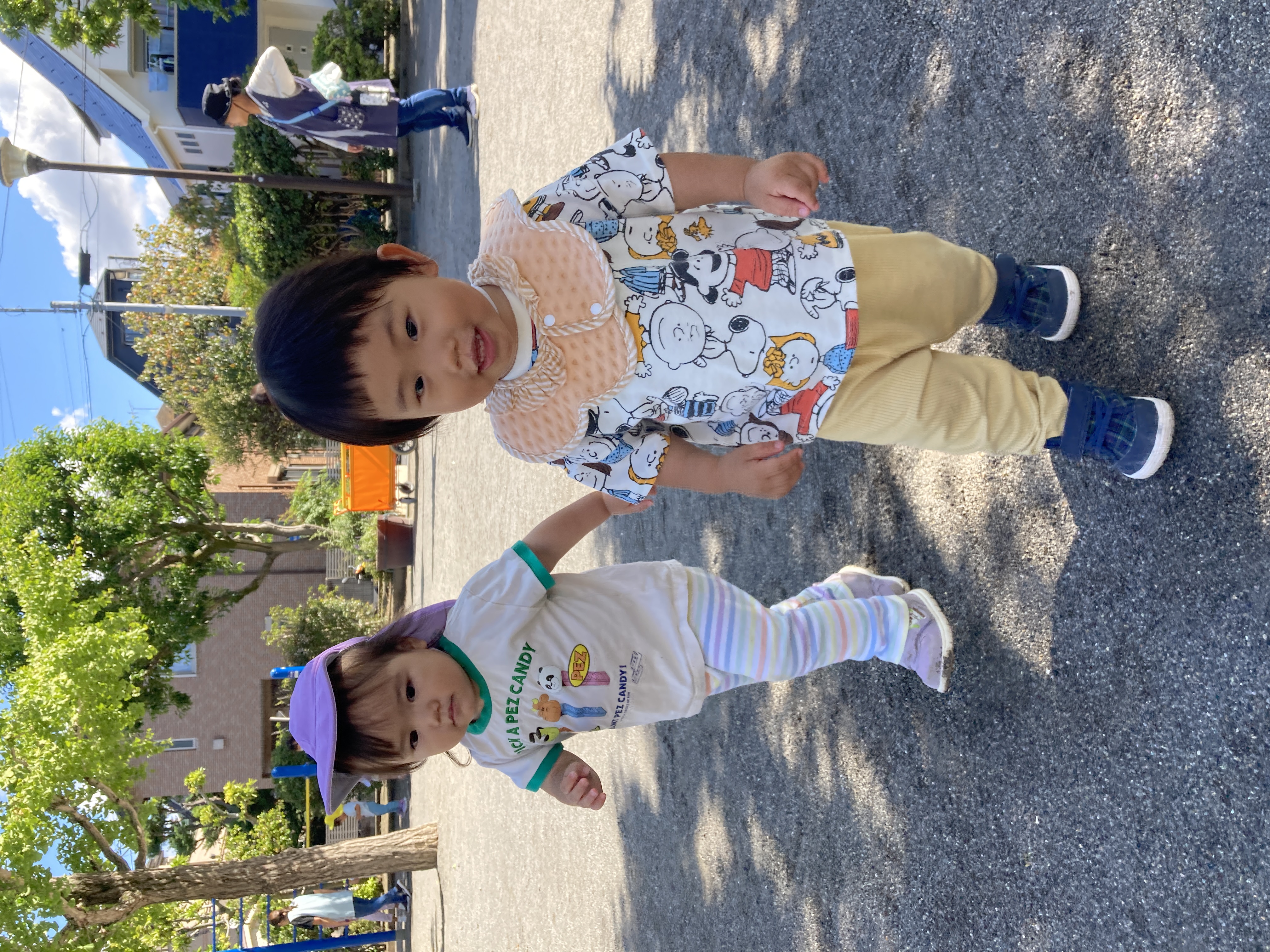 こんにちは、1歳児のほし組です。10月になり戸外で過ごすには気持ちの良い季節となってきました。ほし組の子ども達も園庭に出て元気に遊んでいます。色々な事に挑戦し、三輪車やスクーターなどでも遊んでいます。ポックリや鉄棒などにも挑戦しています。ハイポーズと声を掛けるとピースサインをする事も出来るようになりました。砂場ではアイスを作ったり、ご飯を作って保育士の所に持って来てくれます。「美味しいね」と伝えると嬉しそうな笑顔を見せてくれます。天気の良い日には太陽の日差しにきらきら光るシャボン玉を追いかける可愛い姿も見られます。