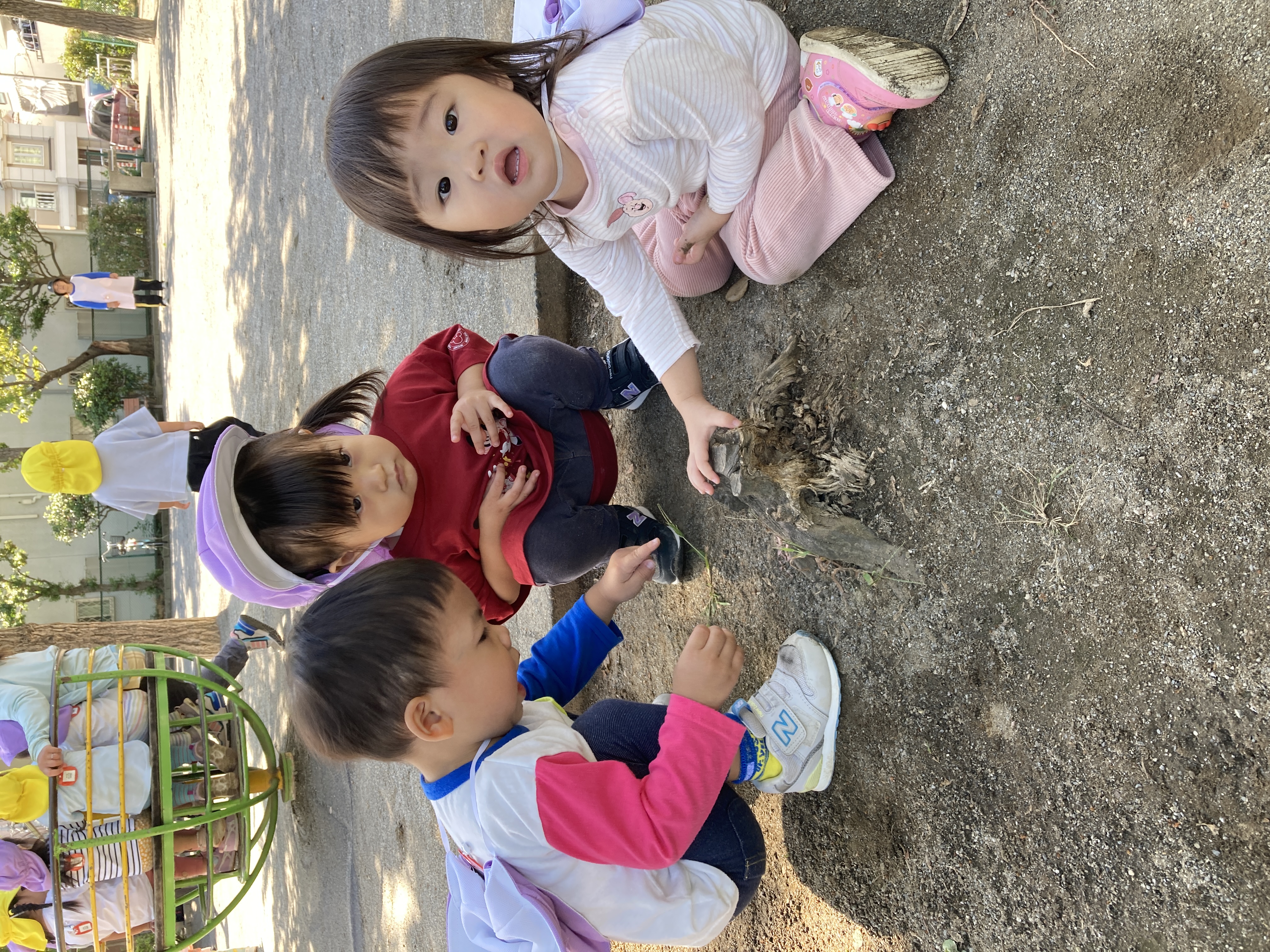 先日は2歳児のつき組さんと一緒に公園に散歩に行って来ました。初めての公園遊びで子ども達も嬉しそうに追いかけっこをしたり、遊具で遊んでいました。秋になり落ち葉を拾って見せに来てくれたり、切り株がカエルに見えたようで「カエル!」と観察する可愛い様子もありました。園庭とは違う雰囲気の中でも秋の季節を感じられる様に散歩にも出かけて子ども達と楽しんでいきたいと思います。
