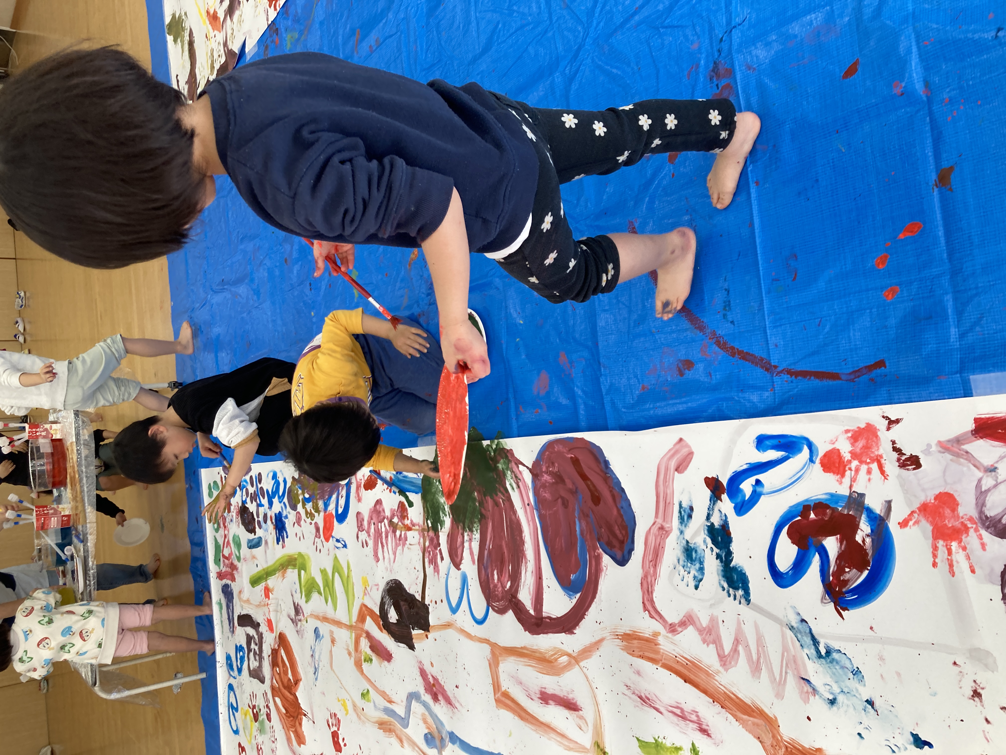 「絵の具などの塗料」に触れる活動は、場所をホールに移し、大きな画用紙、ケント紙、和紙といった様々な紙にポスターカラーや蛍光塗料を使って、絵をかきました。直前の色水活動を受けて色を混ぜると新しい色が出来るという経験から、意欲的に塗料を混ぜて新しい色を作る姿が見られていました。また、蛍光塗料と水を混ぜた時に光って見える発見がありました。