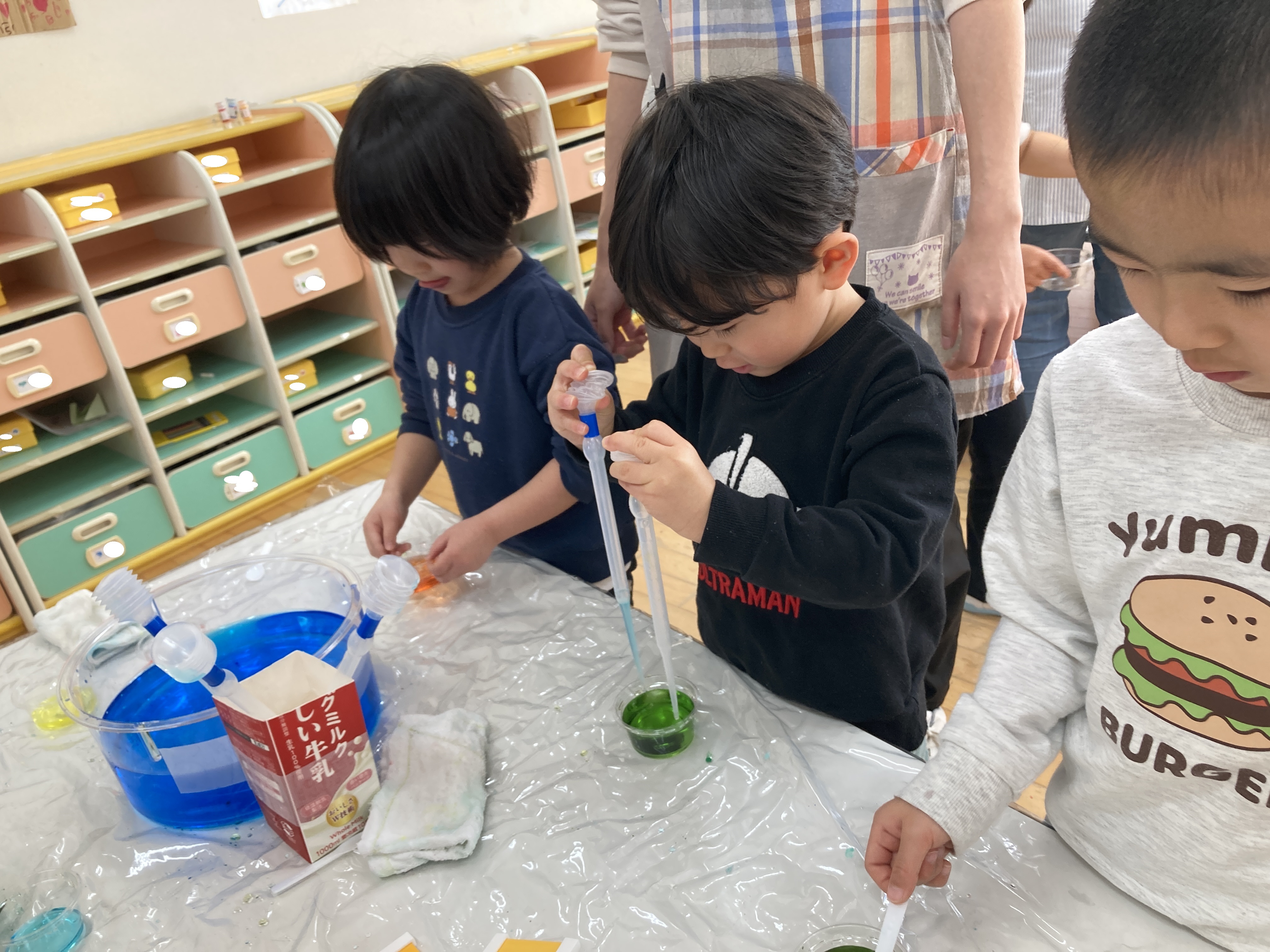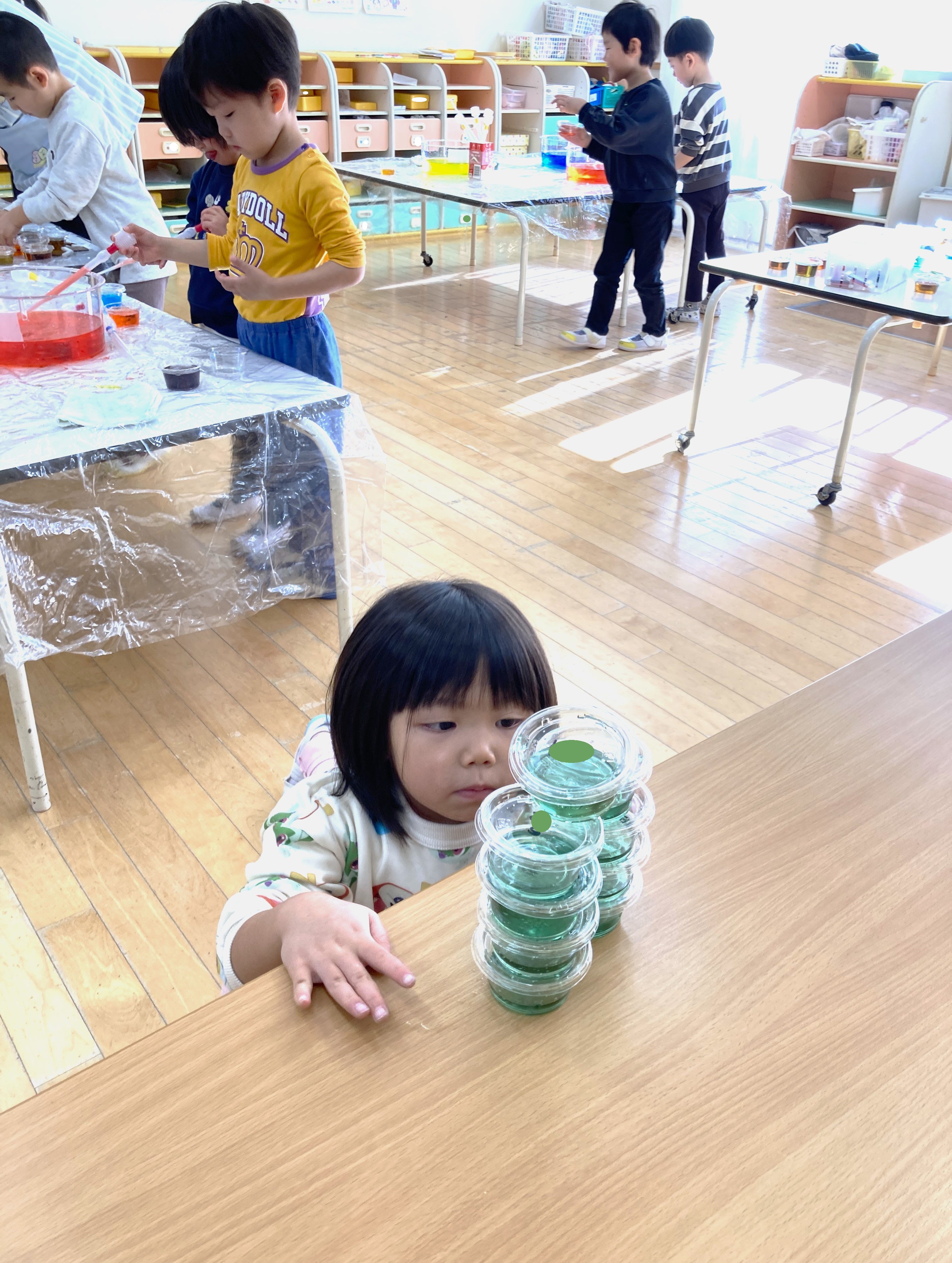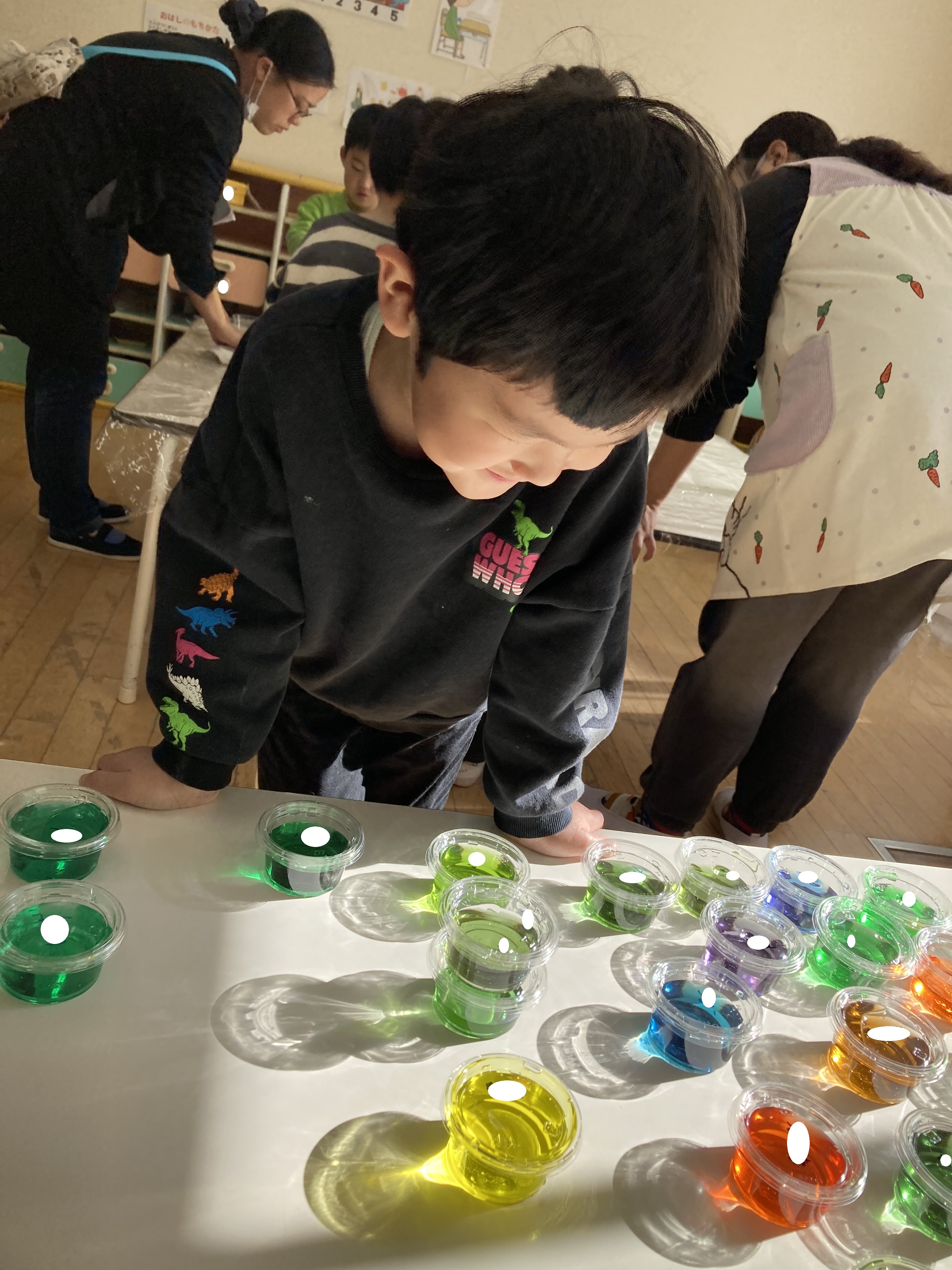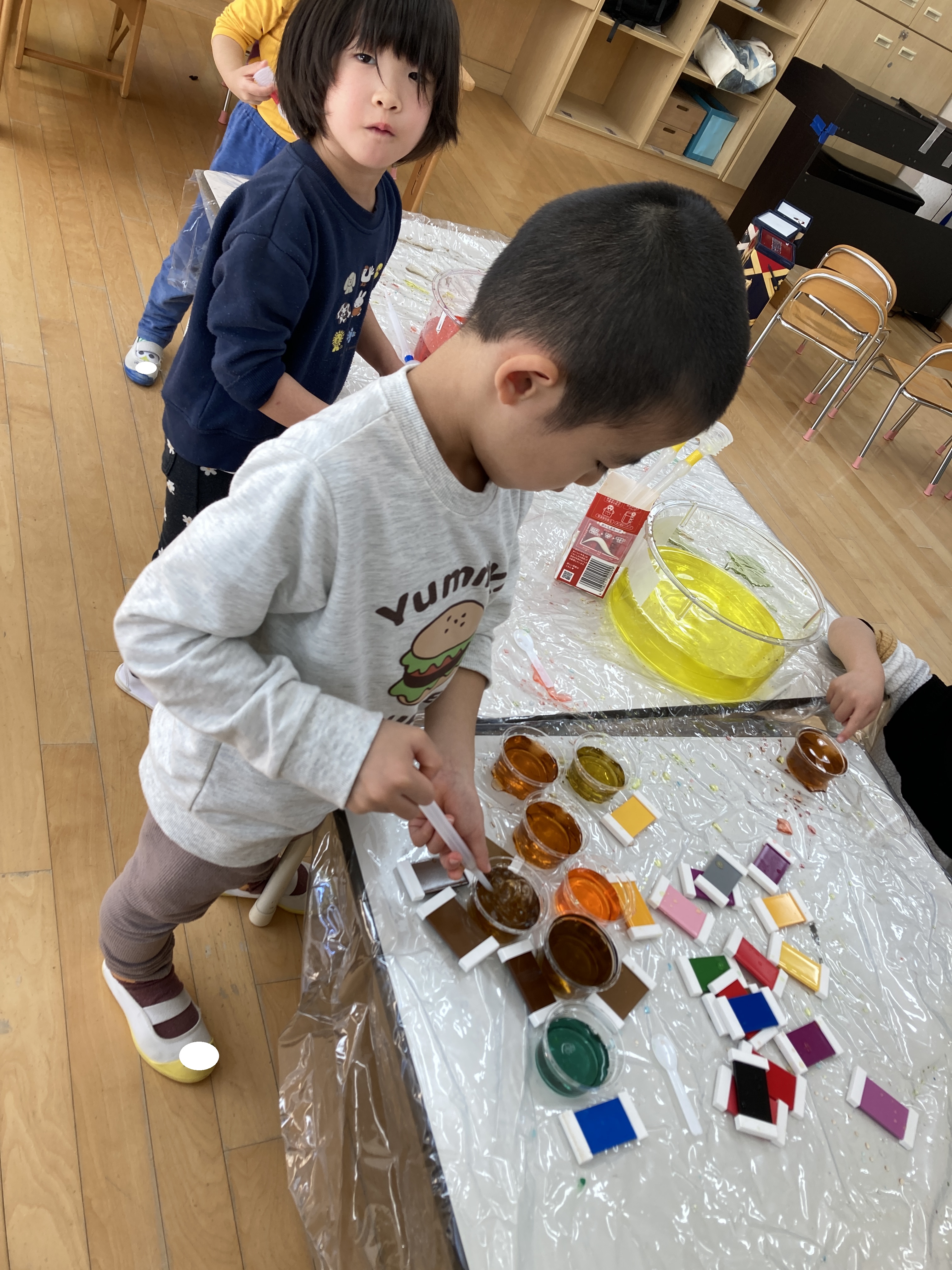 活動を通して、子ども達は色の違いや変化を楽しみながら、自分の感じた事を言葉にし、保育士や友だちと共有する姿がたくさん見られました。これからも、子ども達の「なぜ?」「やりたい」という気持ちを大切にしながら、色の世界を一緒に広げていきたいと思います。
