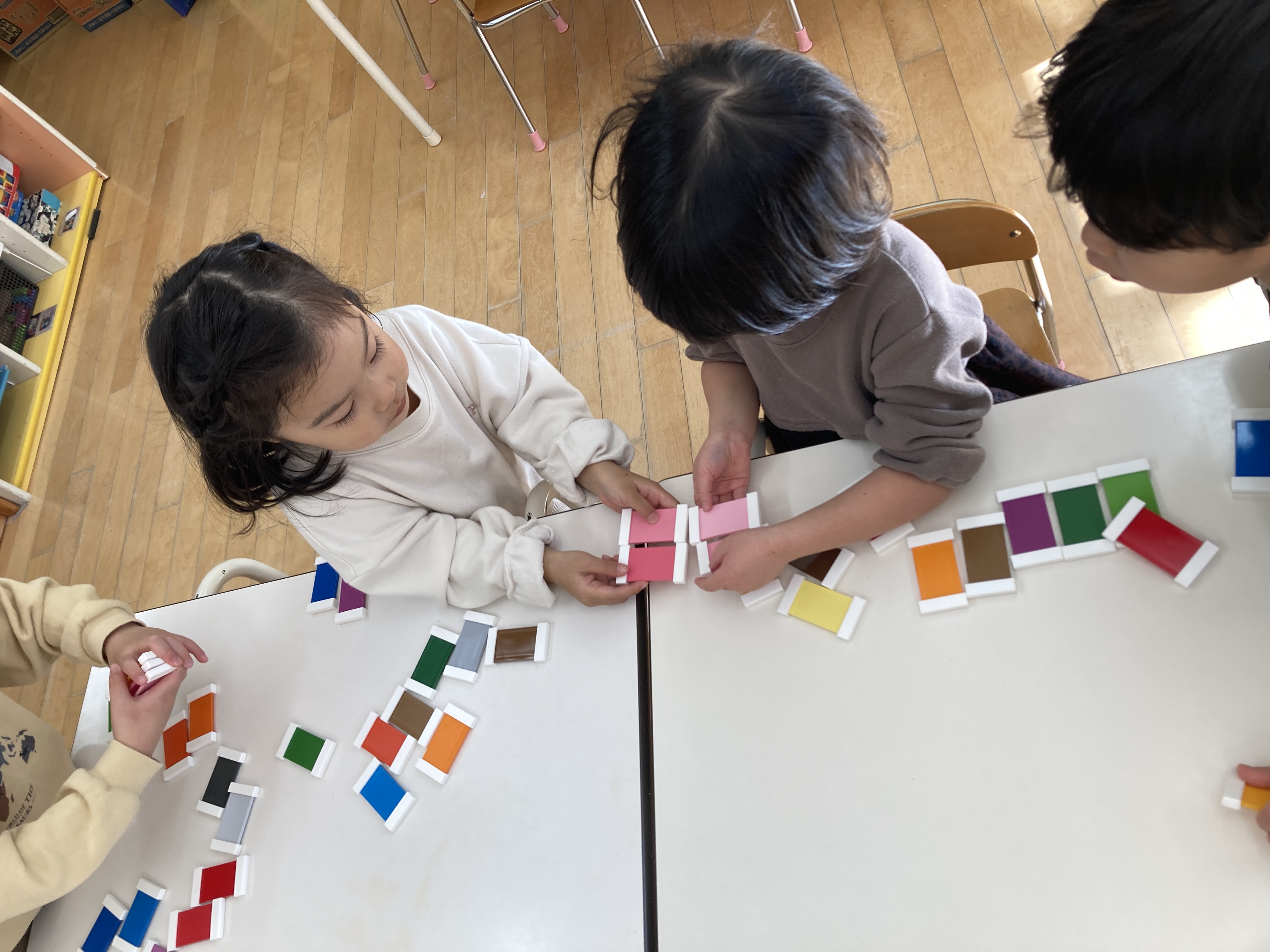 色板を使用した「色さがし」がスタートすると、室内から、園舎内、園庭まで広がり、色板と同じ色を見つけると、まるで宝物でも見つけたかのように嬉しそうに保育士に報告する姿や、身近な場所に沢山の色があることに気付き、友だち同士で発見を伝えあう様子が印象的でした。