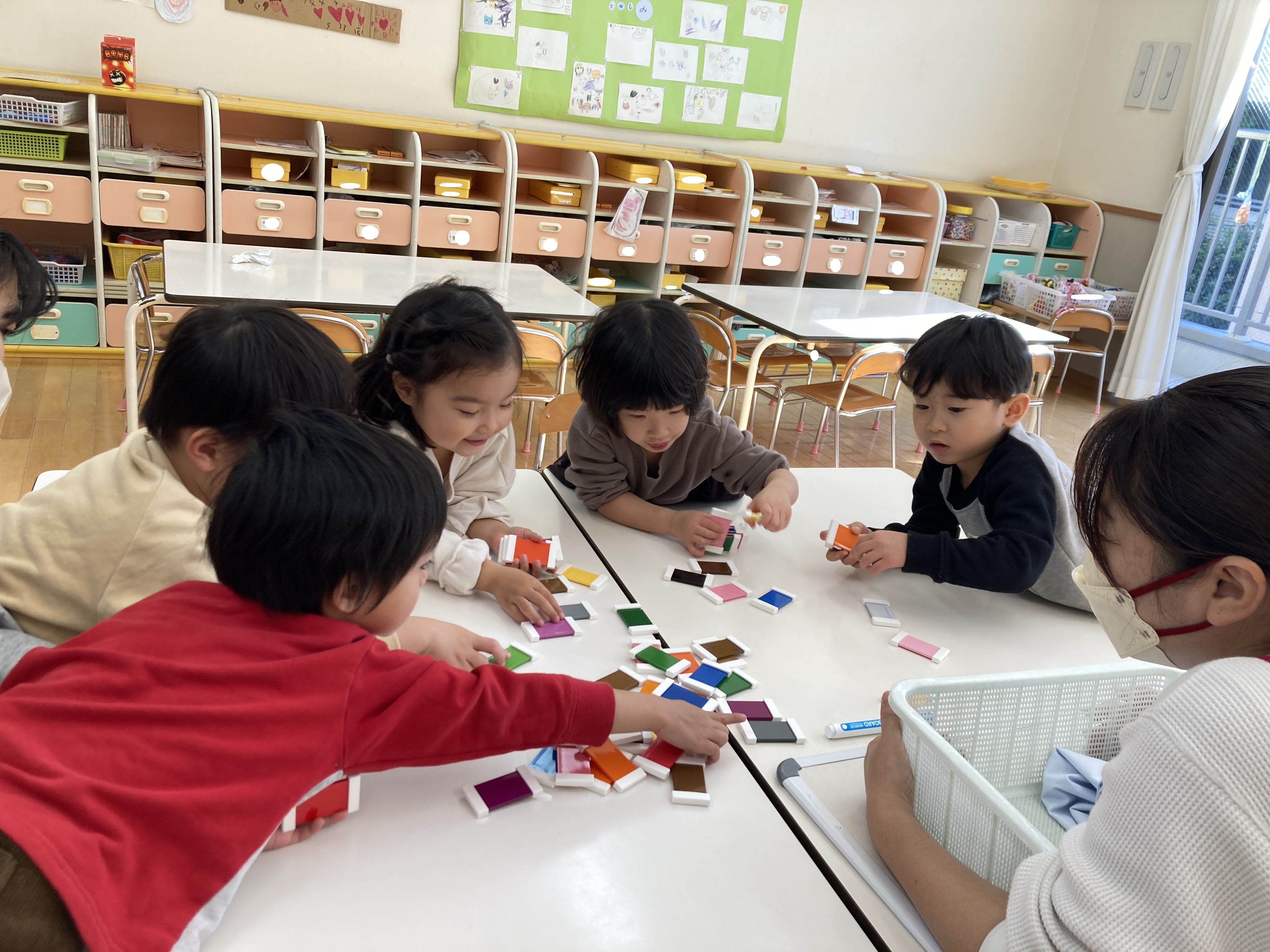 同じ色でも「何か違う」「ちょっと濃いね」と、色の濃淡の違いに気付いたり、「海の色だから冷たい」「おいしそうな色」という色のイメージを伝えあう姿もありました。また、「壁の白と蛍光灯の白が違う」等、光が当たると違う色になるという気づきもありました。