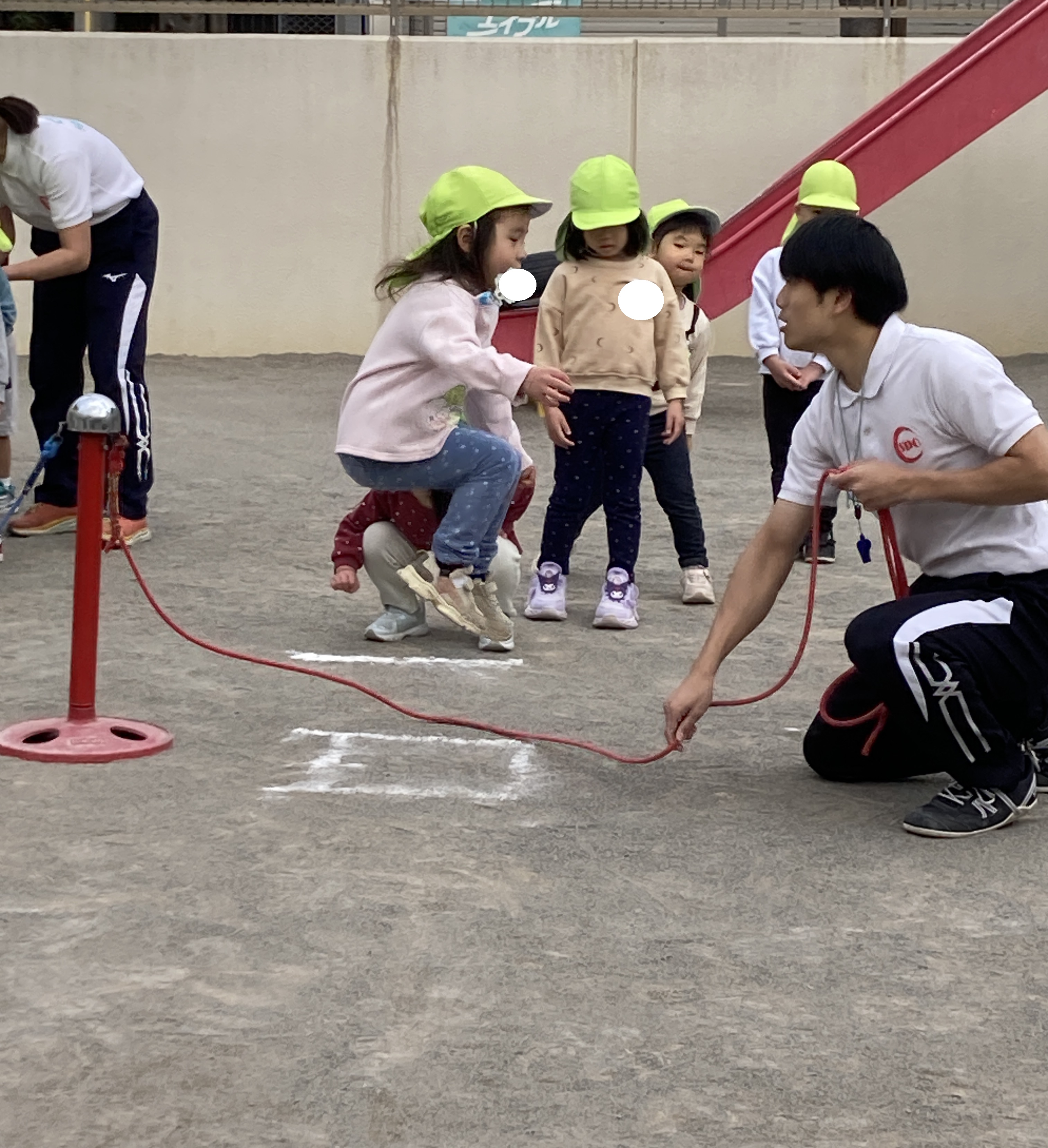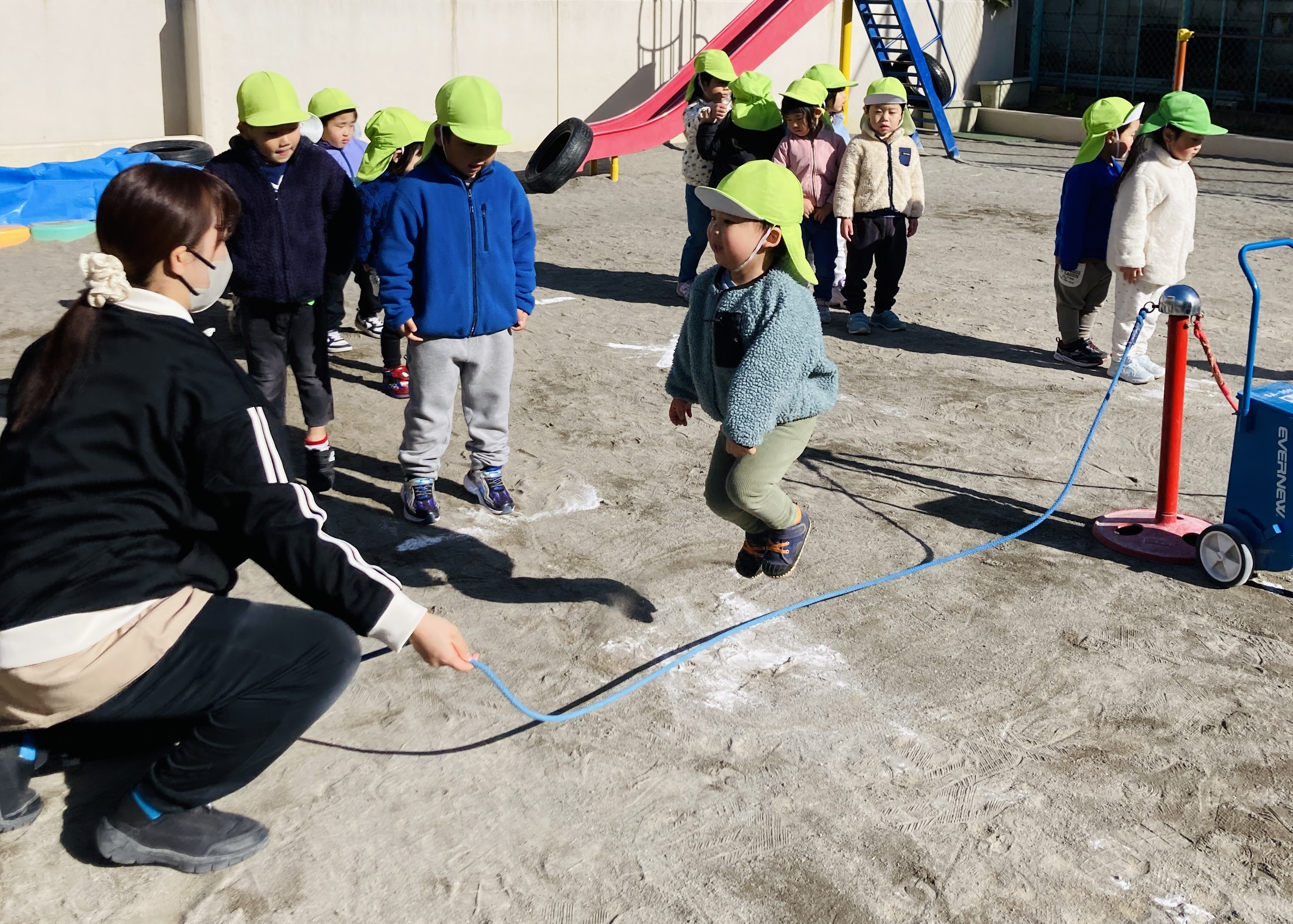 縄に慣れてきたら次はお待ちかねの1回跳び!講師や保育士の合図、縄が足元に来たタイミングを見て縄を跳びます。タイミングよく跳べると子ども達も嬉しいようで「とべた!?」「やったー!!」と大喜びでした。講師の先生にもたくさん褒めてもらい、また一つ素敵な成長を見せてくれる子ども達でした!