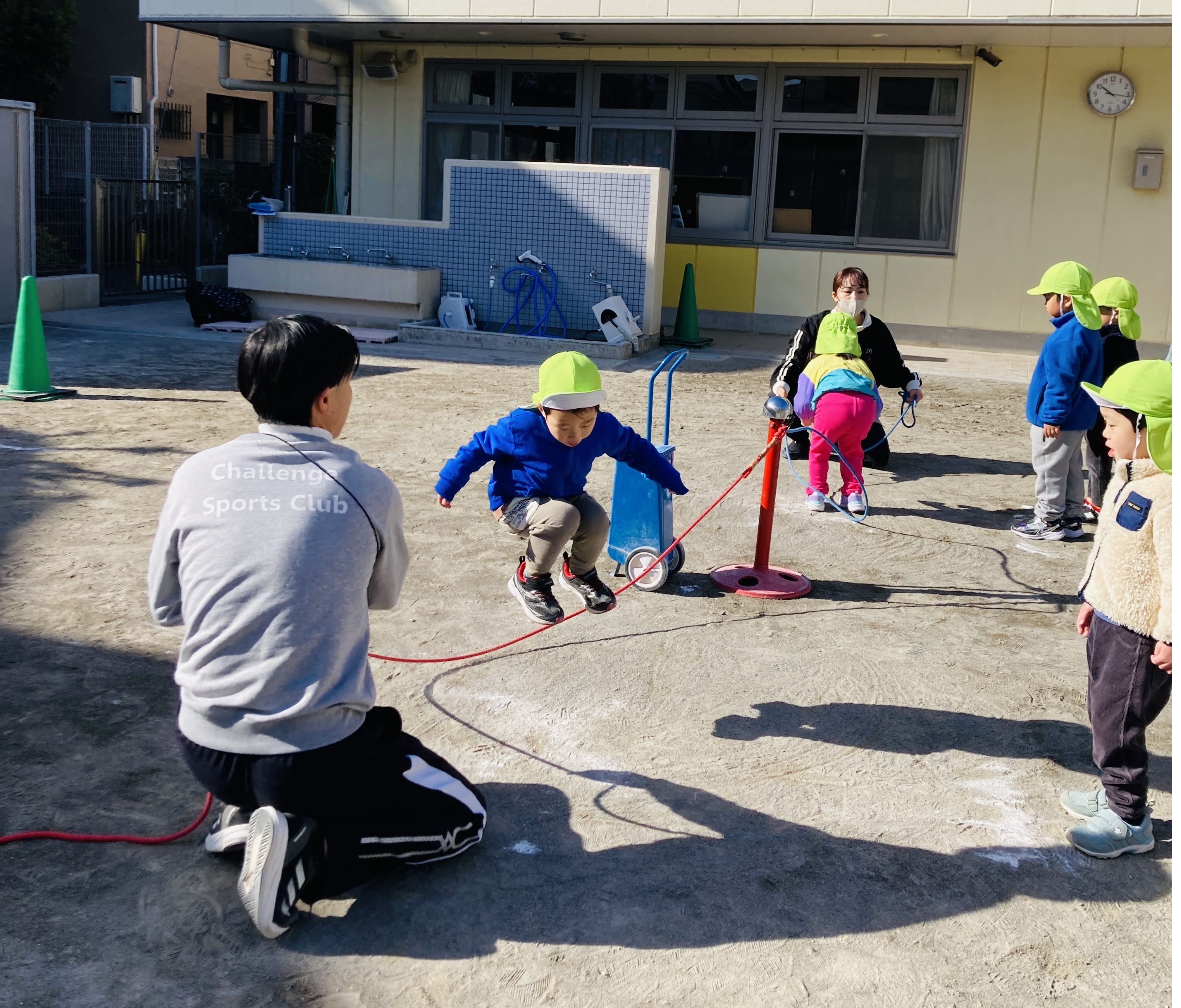 1月にそよかぜ組の体育あそびが2回ありました。1月に入ってすぐの体育あそびでは初めて「長縄跳び」。講師の先生たちと新年のご挨拶をして気持ちのいいスタートとなりました!