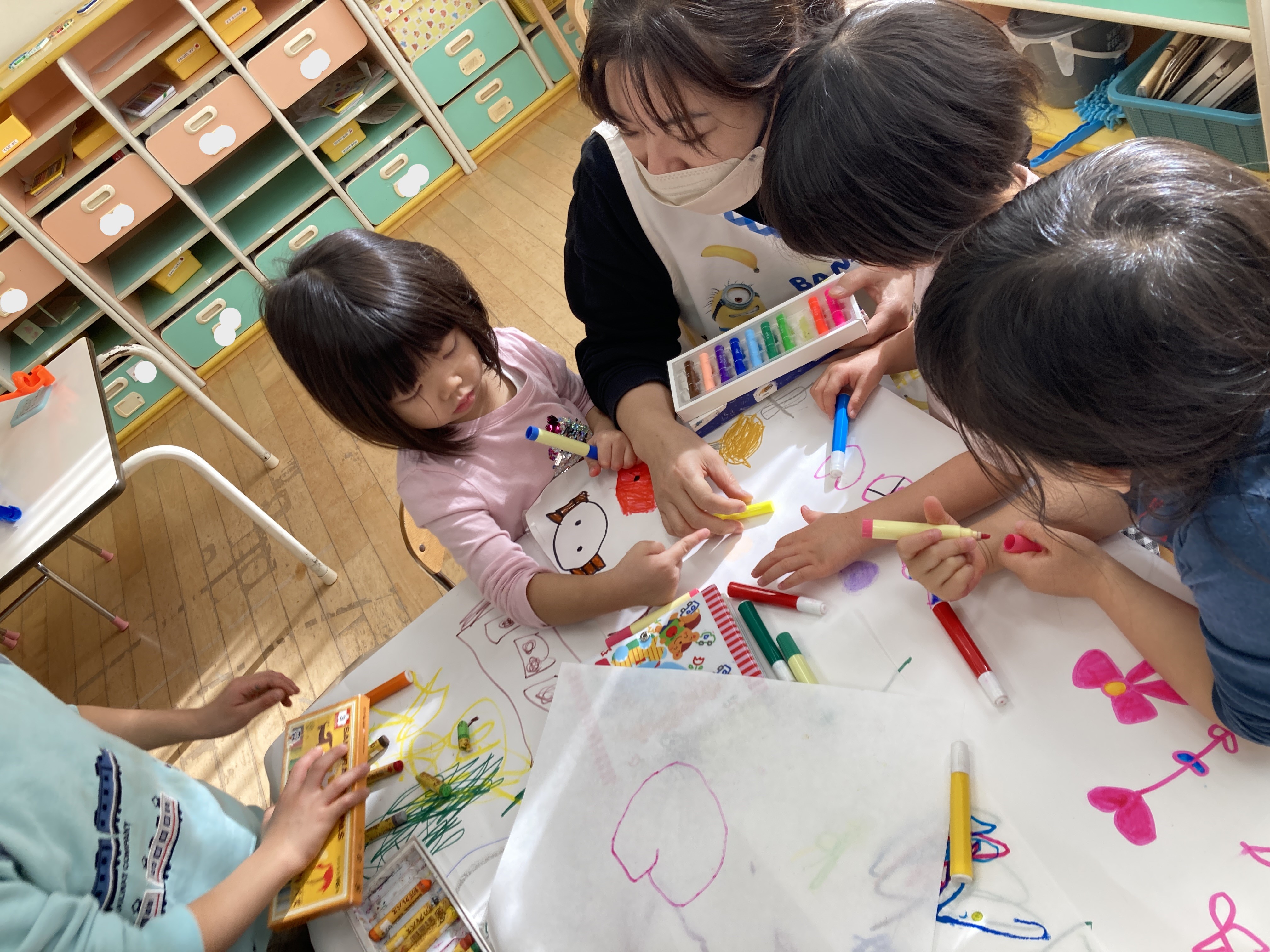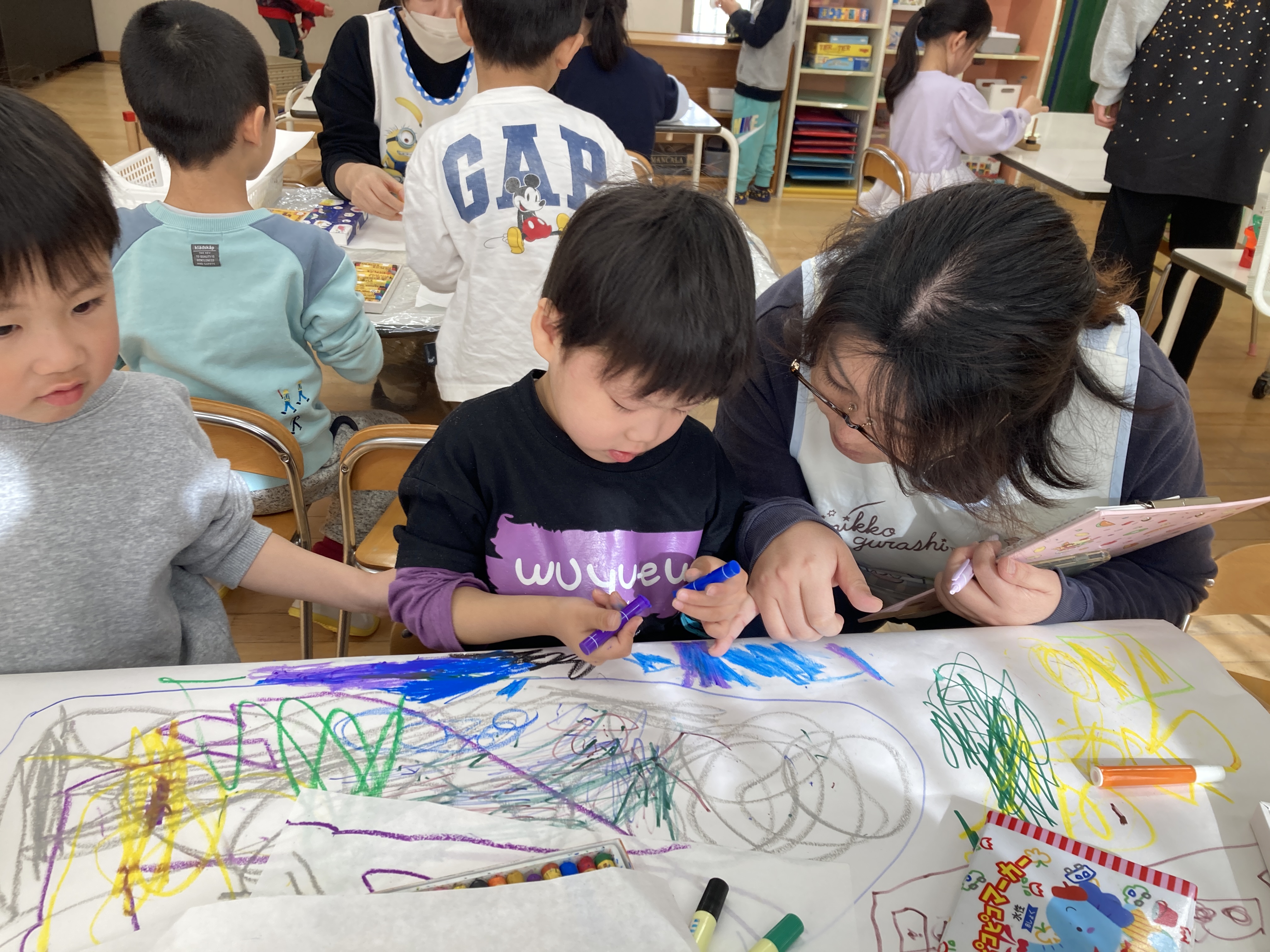 今回は、ケント紙・和紙・画用紙など、さまざまな材質の紙を用意し、マーカー、普通のクレヨン、蛍光クレヨンを使って自由に絵を描くことから活動を始めました。同じ色でも、紙の質感や画材の違いによって発色が異なることに、子どもたちは描き比べながら少しずつ気づいていく様子が見られました。「こっちは濃いね」「紙が違うと色も変わる」と、感じたことを言葉にする姿もありました。