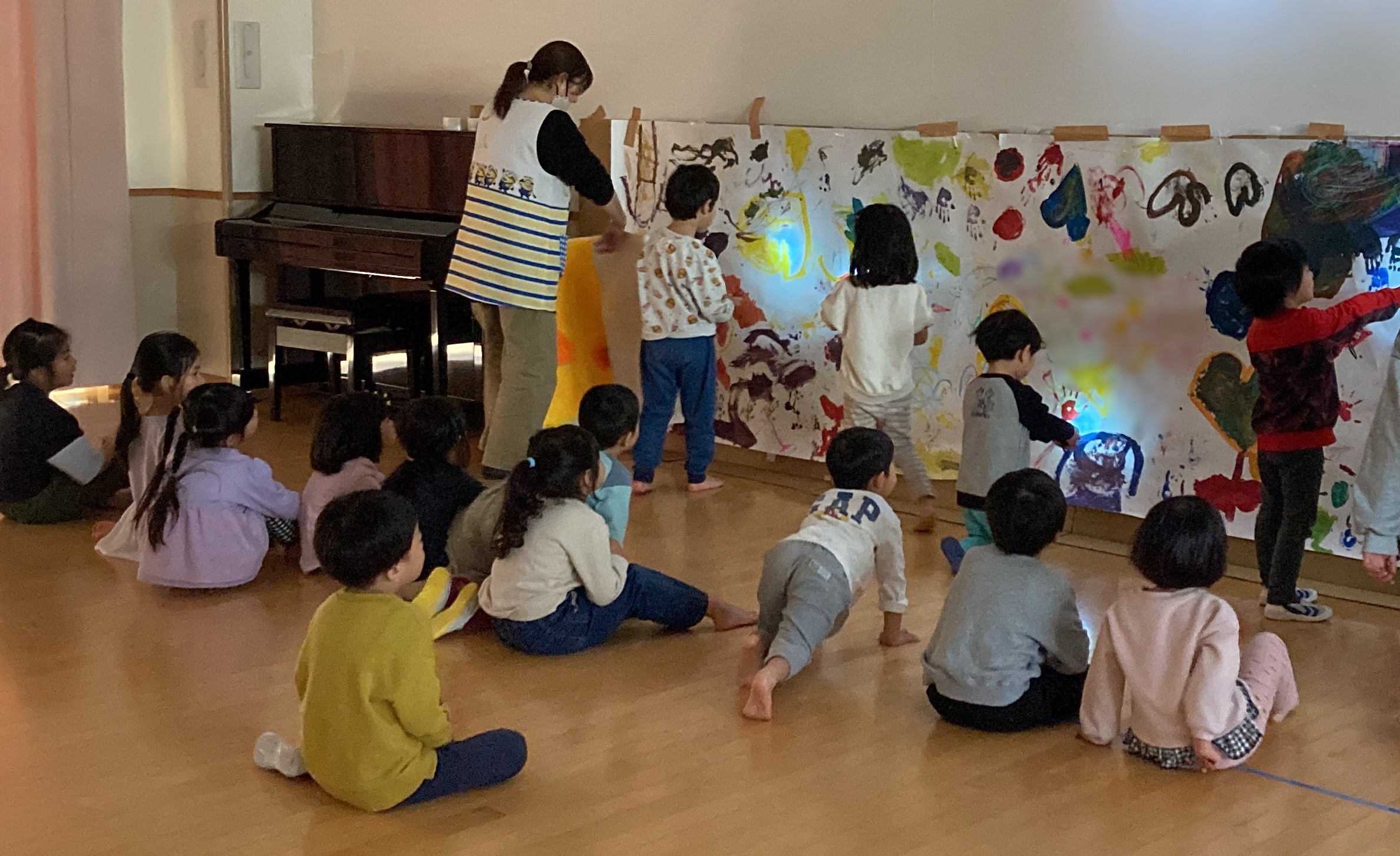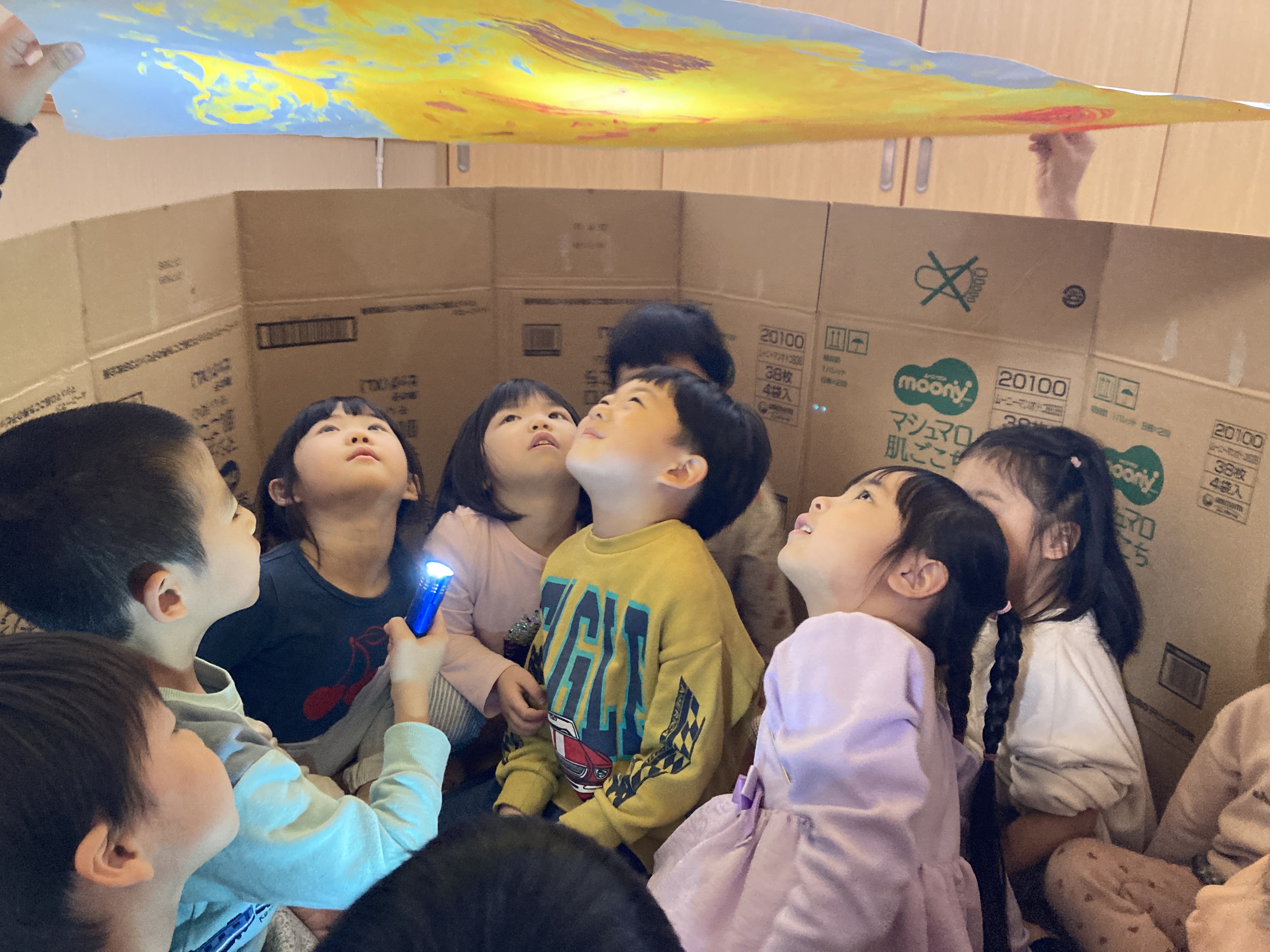 この活動を通して、子どもたちは色そのものだけでなく、光が加わることで見え方が変化することや、素材や道具による違いに気づき、試し、確かめる経験を重ねることができました。また、自分たちのアイデアから活動が発展し、表現の場が広がっていくことで、主体的に関わる姿や友だちと感じたことを伝えあう姿が多く見られました。
