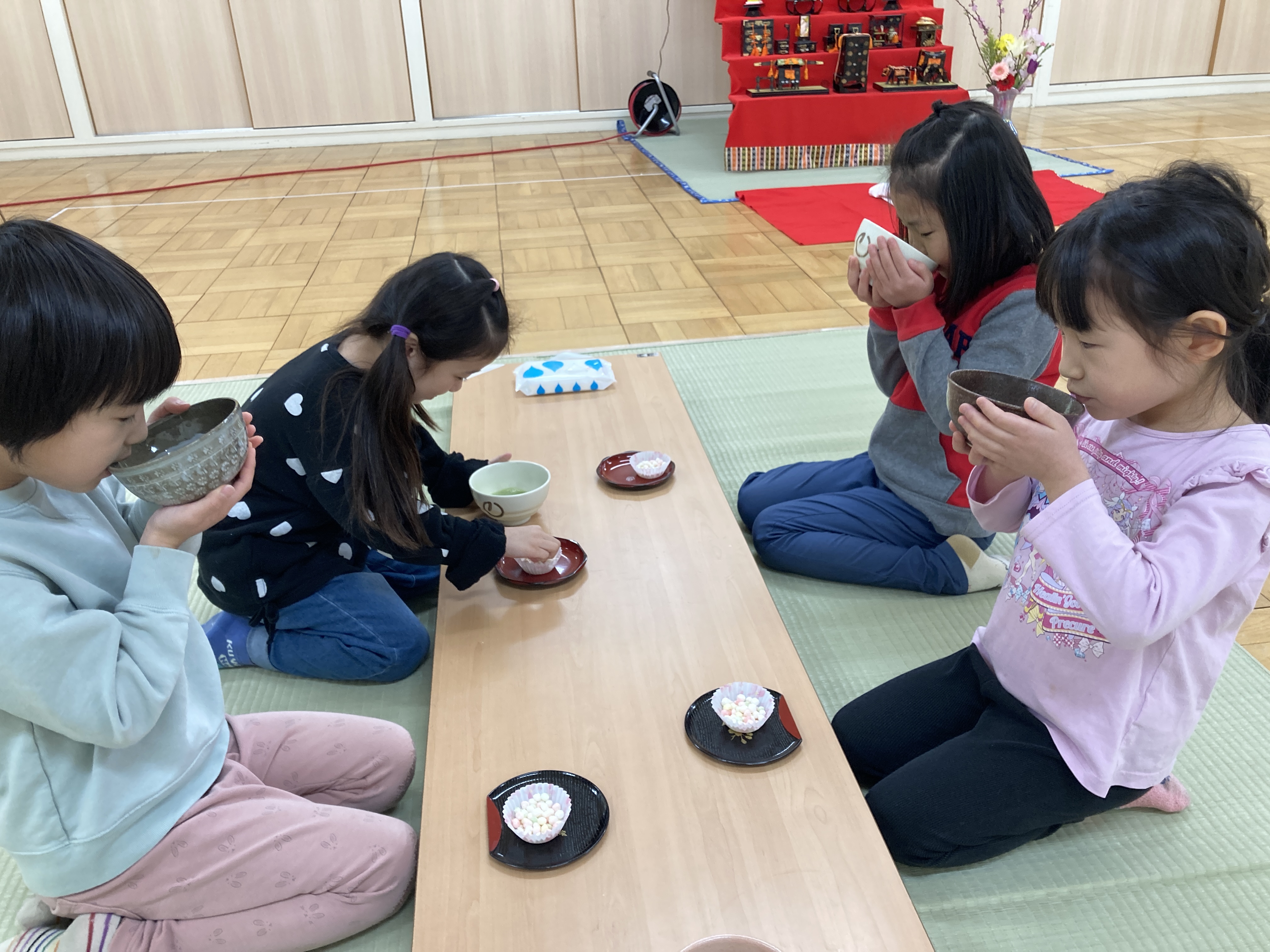 今日はひなまつりだったので、ホールにある雛人形を囲ってお茶会をしました。
