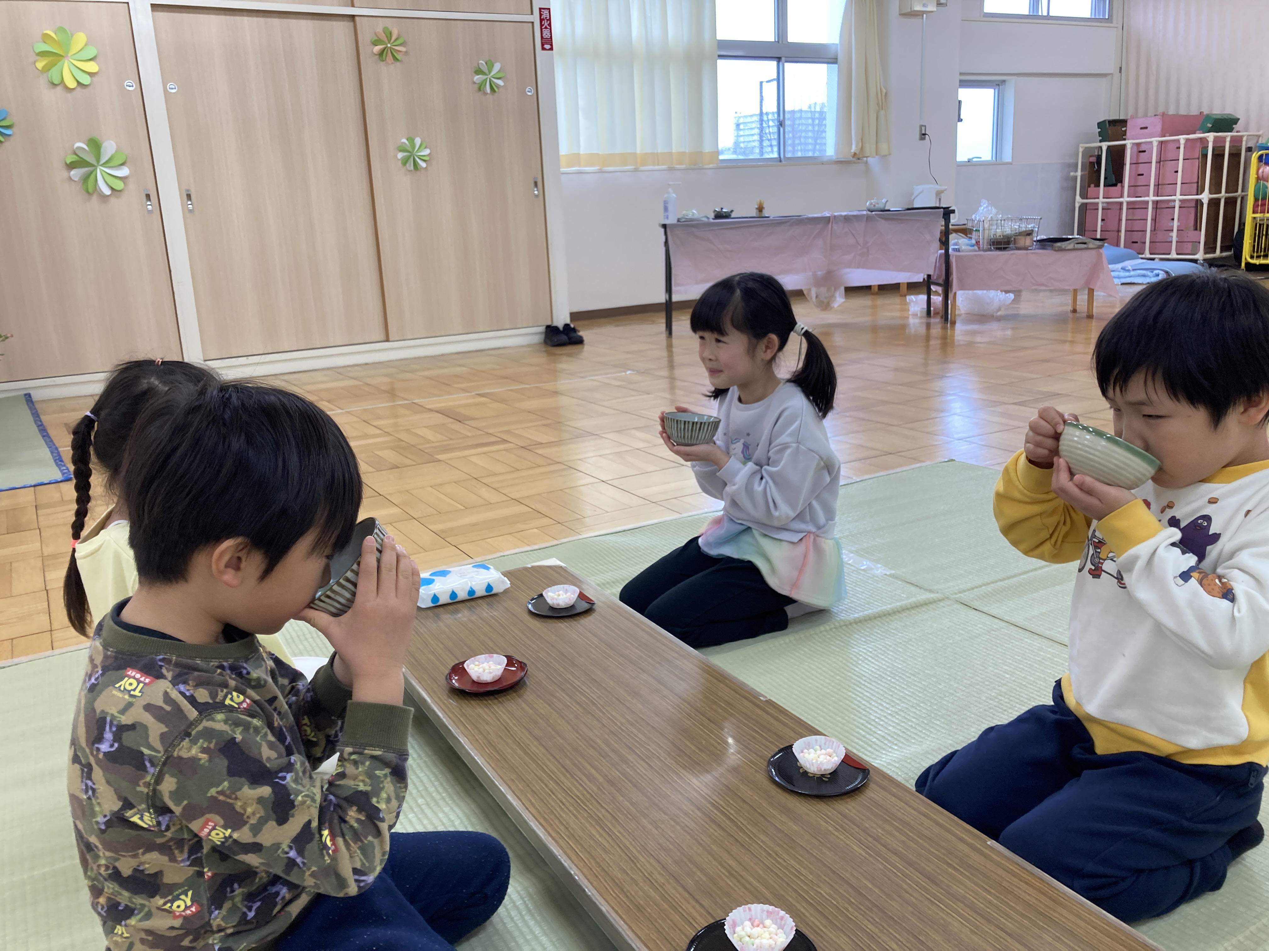 5歳はお抹茶を頂きました。園長先生に作法を教わり上手に飲んでいました。