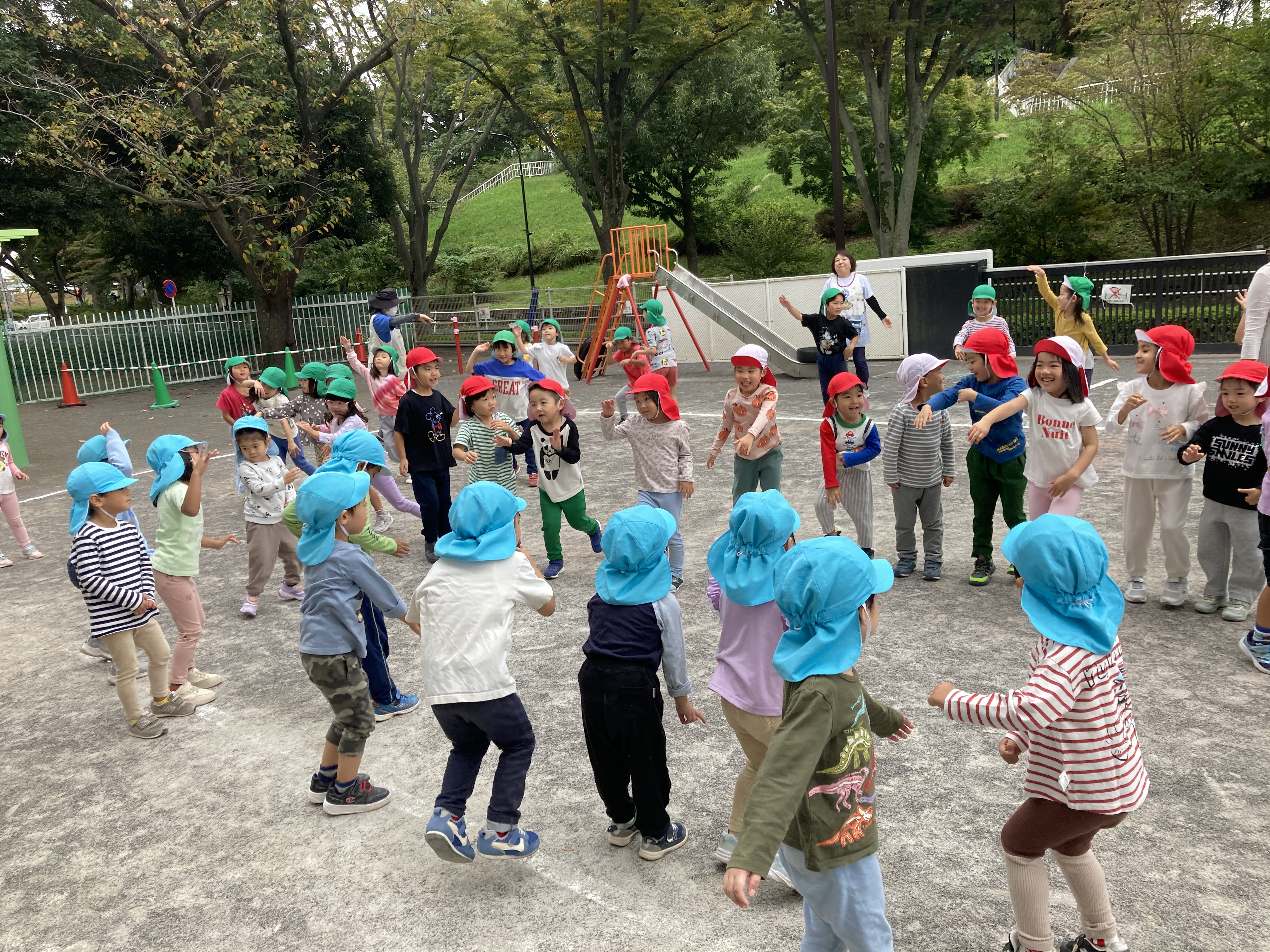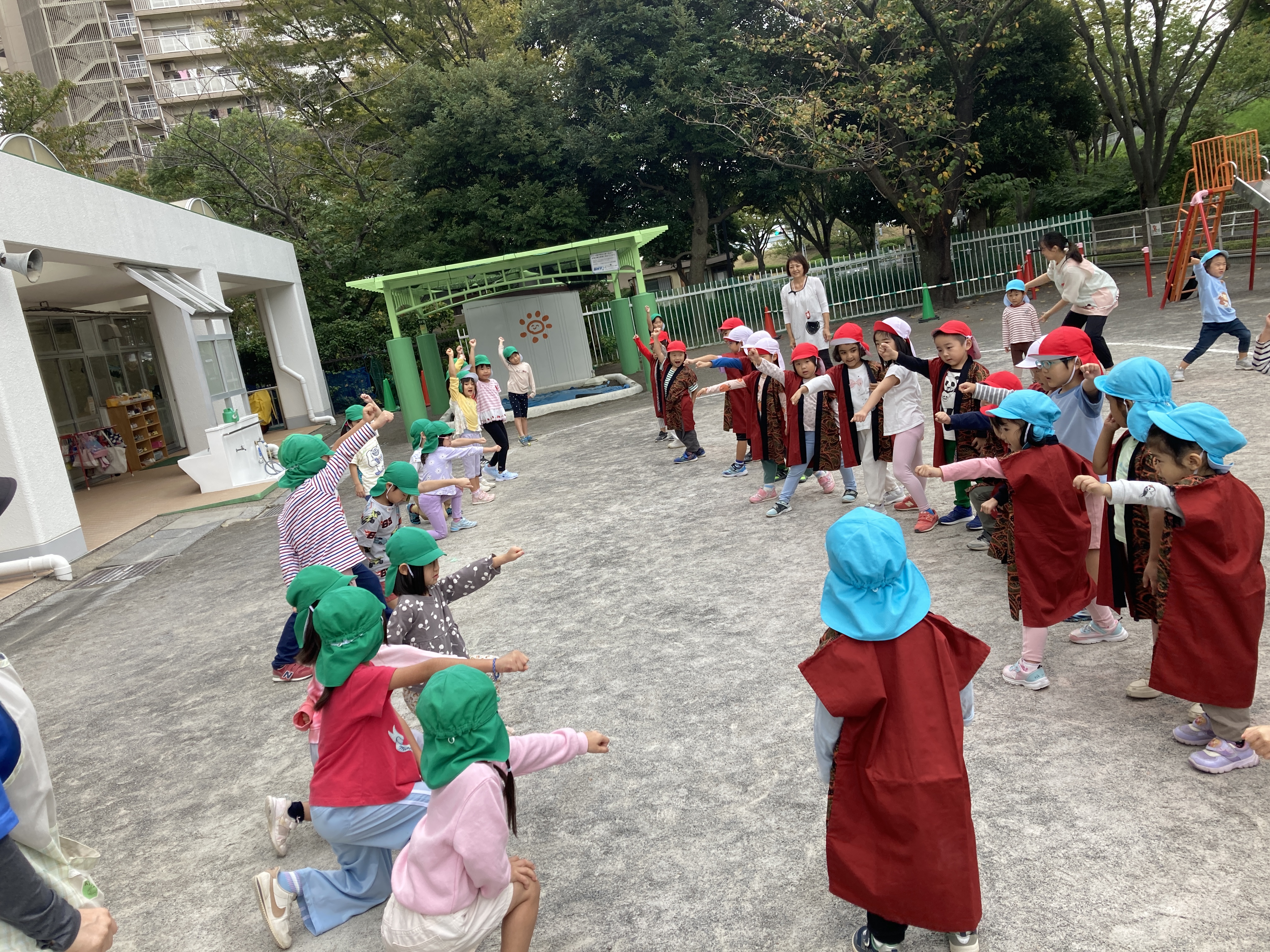 運動会練習の際に見せ合いの機会を多く持っていた事もあり、他クラスの表現で使われていた歌を口ずさんでみたり、ダンスを踊ってみたりしていた子ども達。
