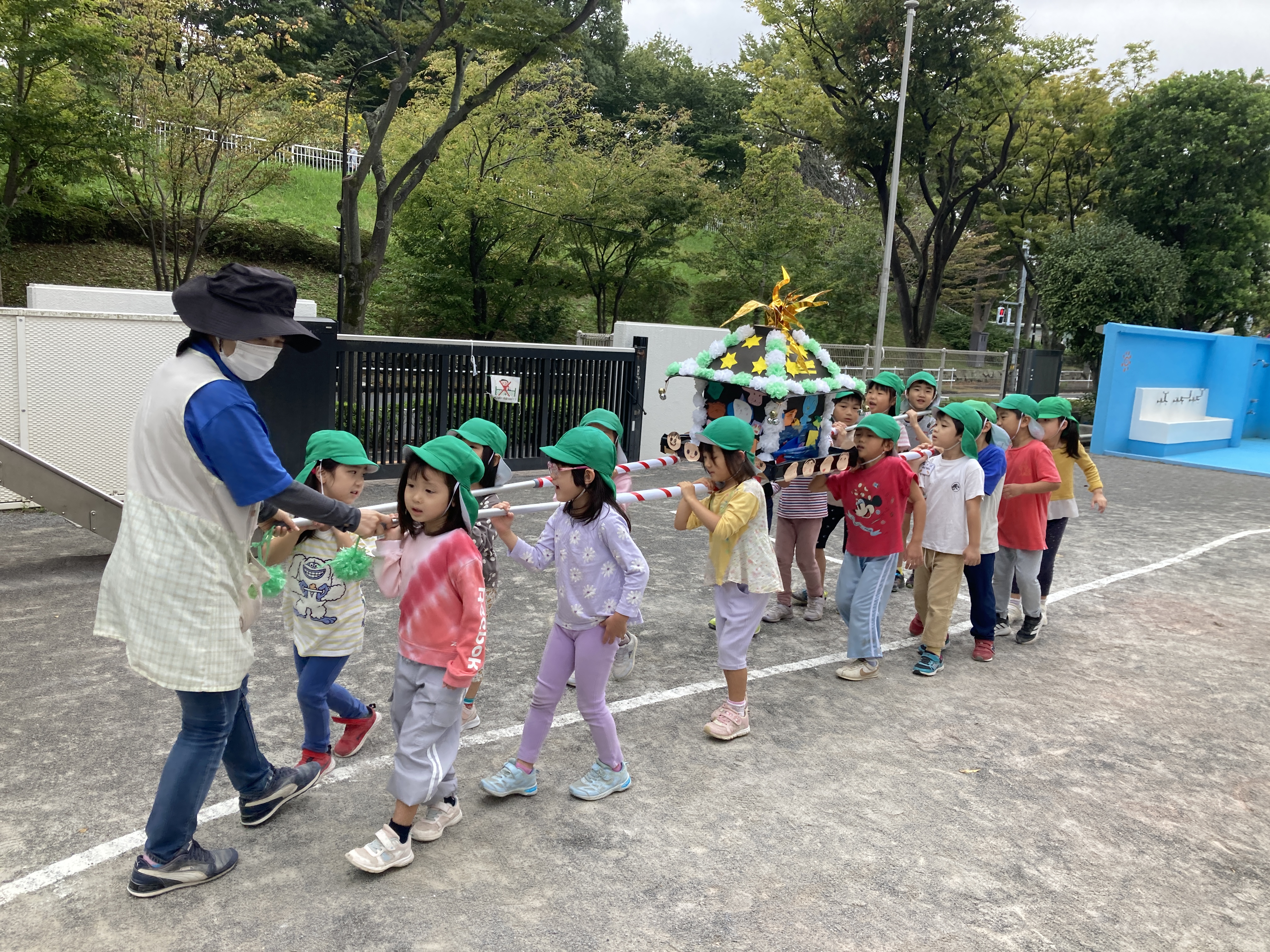最後は、19日に行われるふるさと祭りでお神輿を担ぐひまわり組がその様子を披露してくれてみんなで「わっしょい!」と盛り上がっていました。