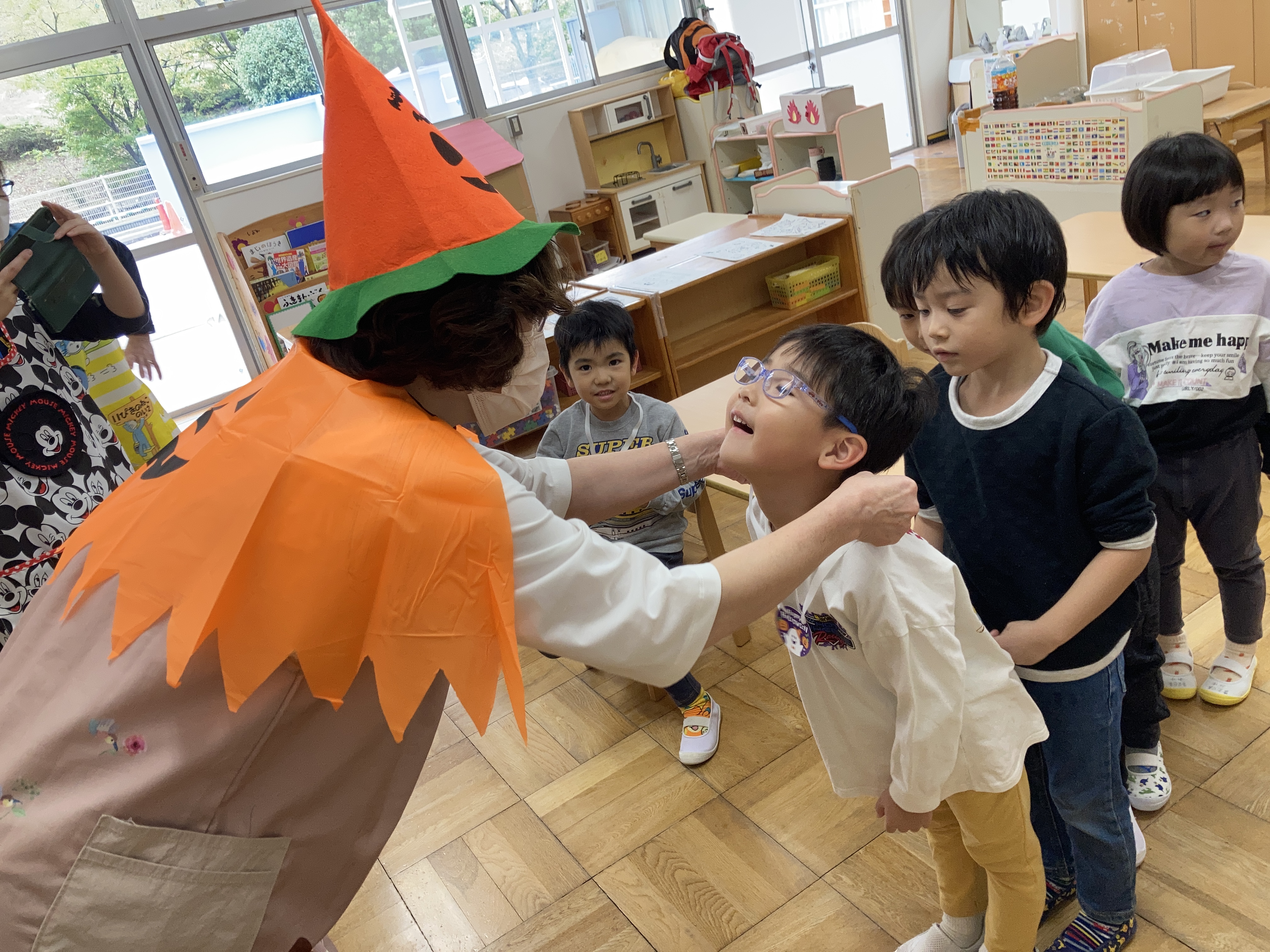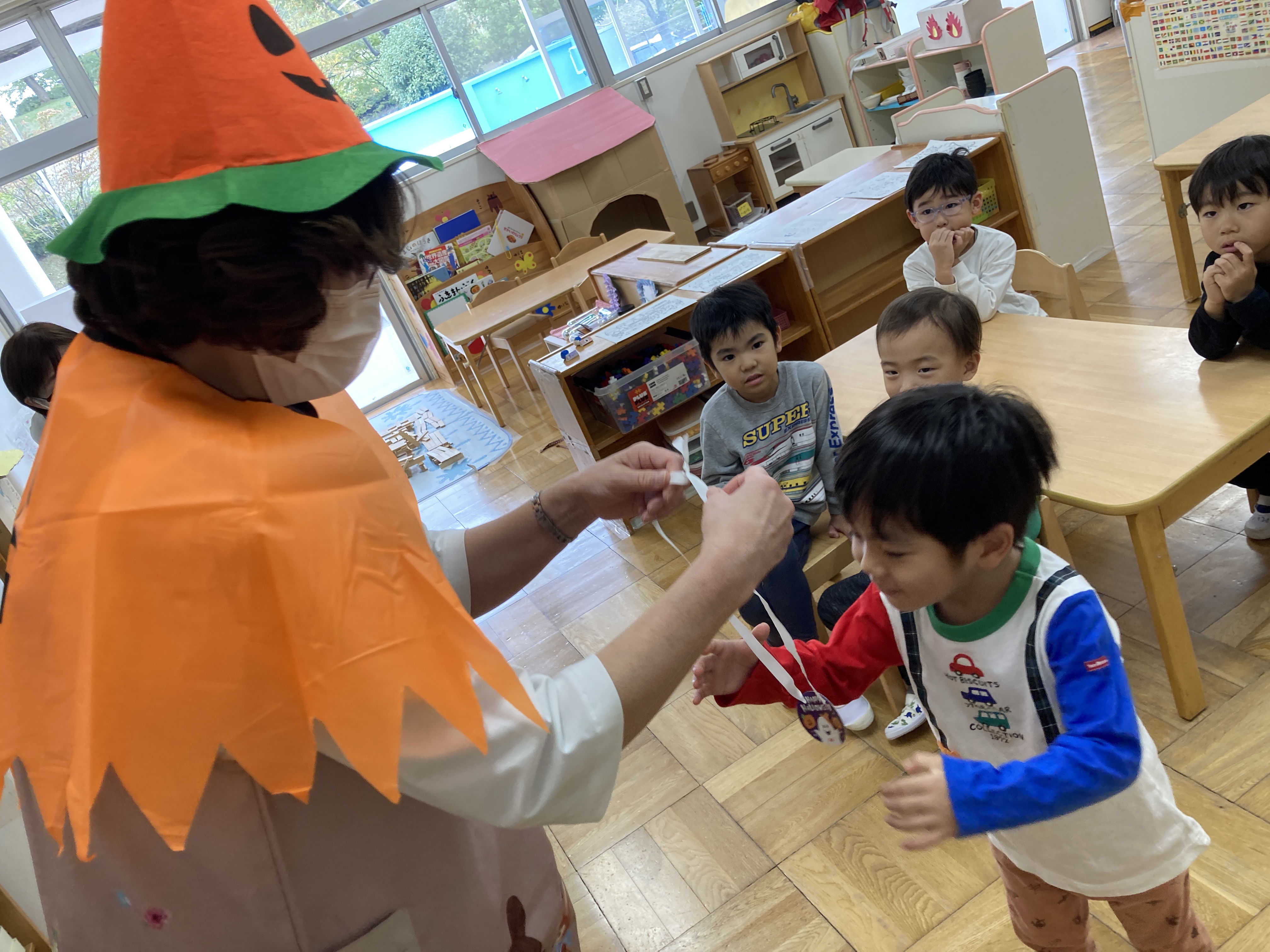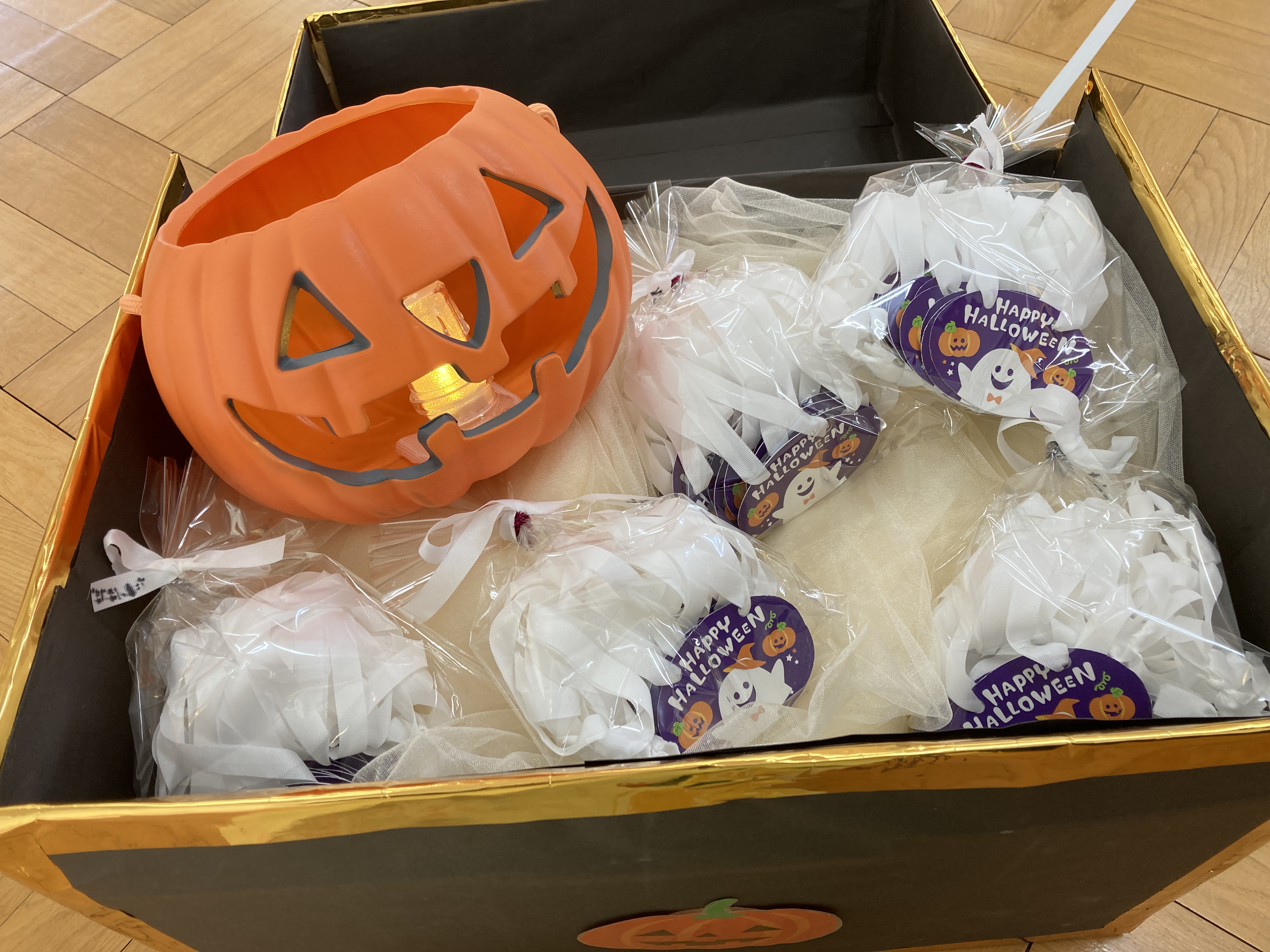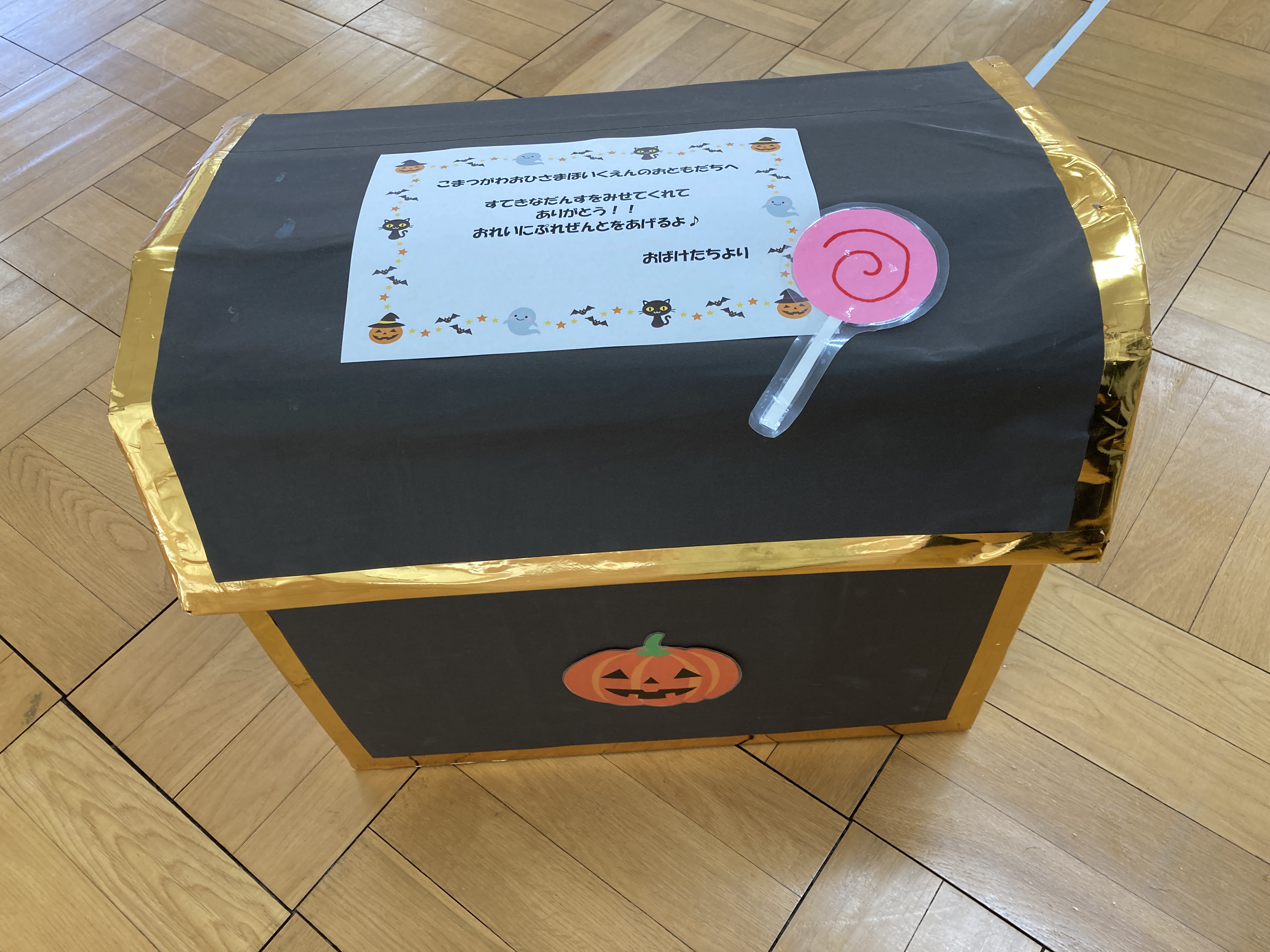 みんなで「トリックオアトリート!」と言って開けてみると中にはおばけからのプレゼントでメダルが入っていました!