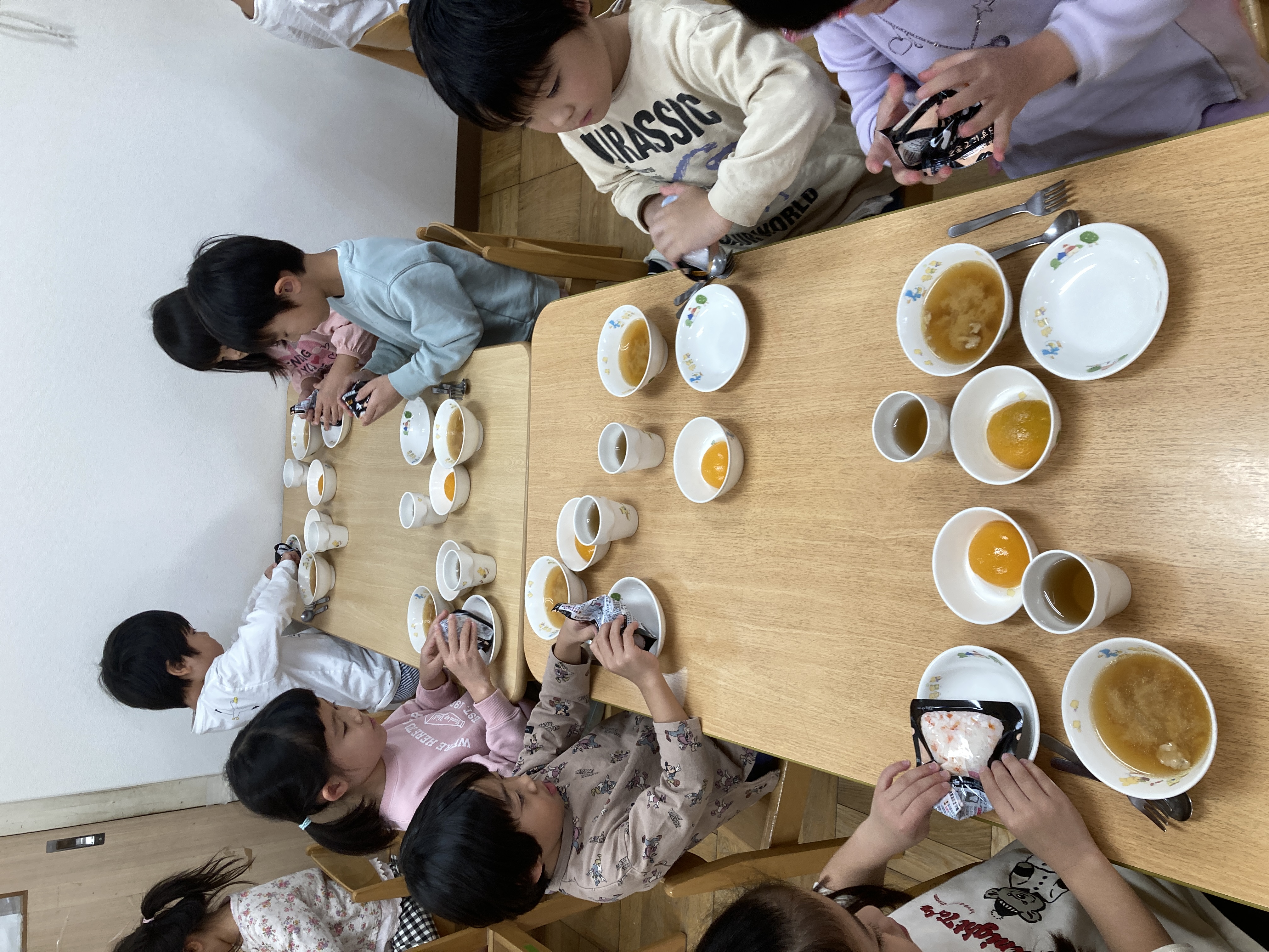 この日の給食は、保育園で非常時の備蓄品として置いてある「鮭のおにぎり」を食べました。