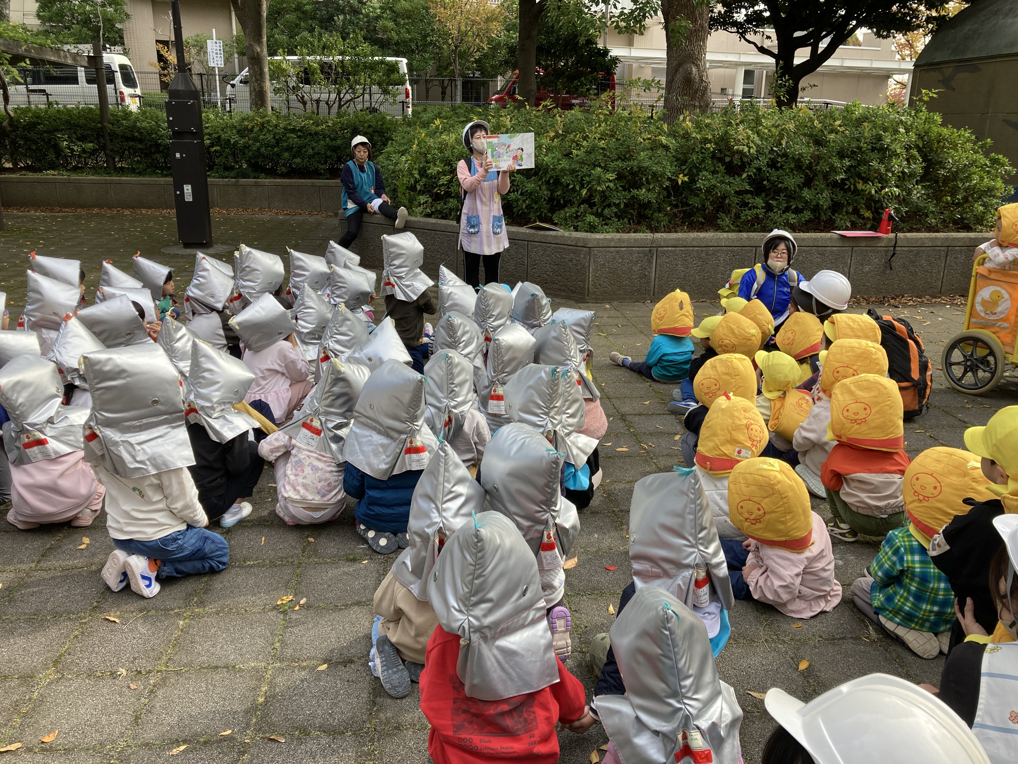 11月12日(水)に全おひさま保育園23園で、震度6の地震を想定し、園外へ避難・保護者と法人に連絡確認の訓練をする鍵『法人えどがわ総合防災訓練』を行いました。
