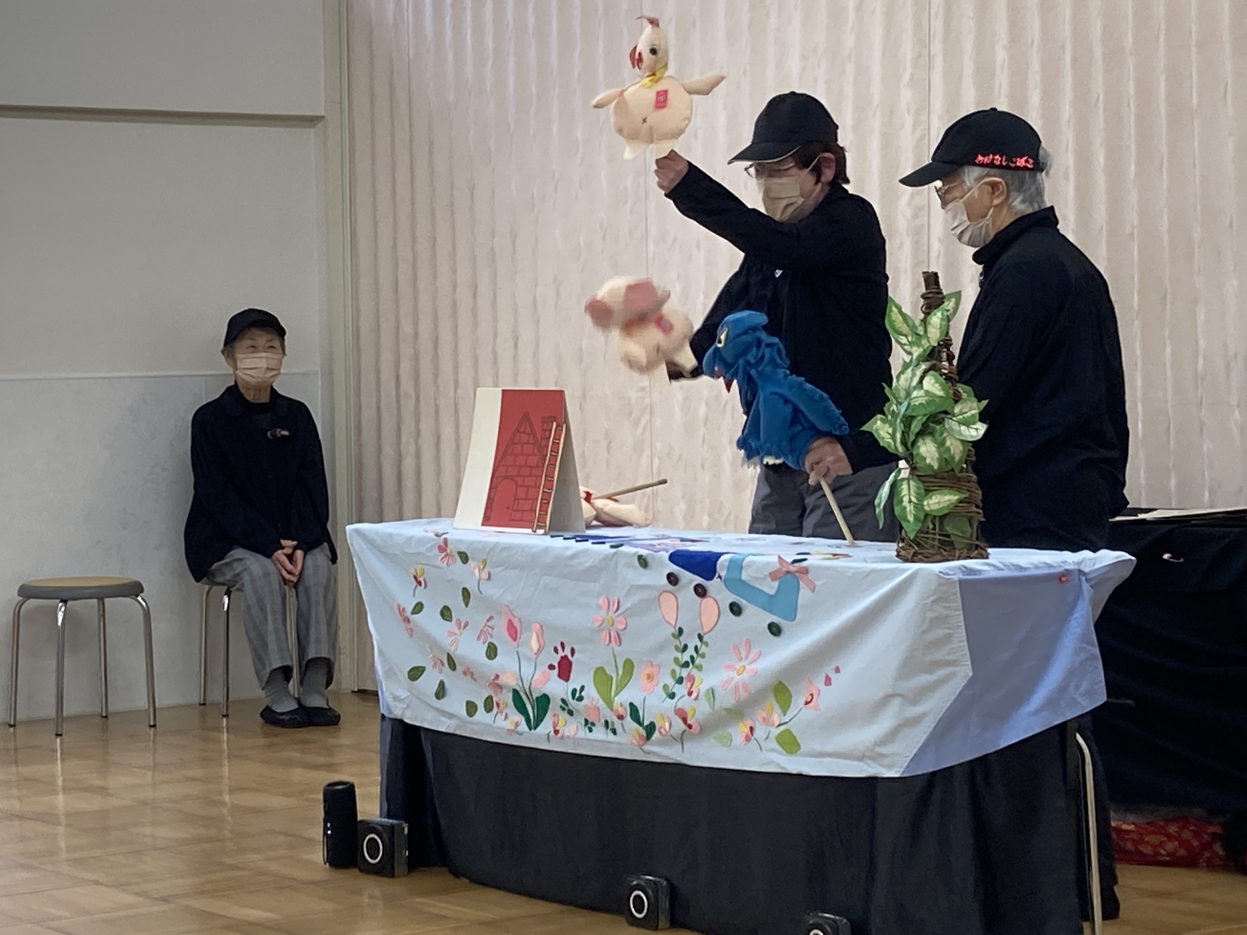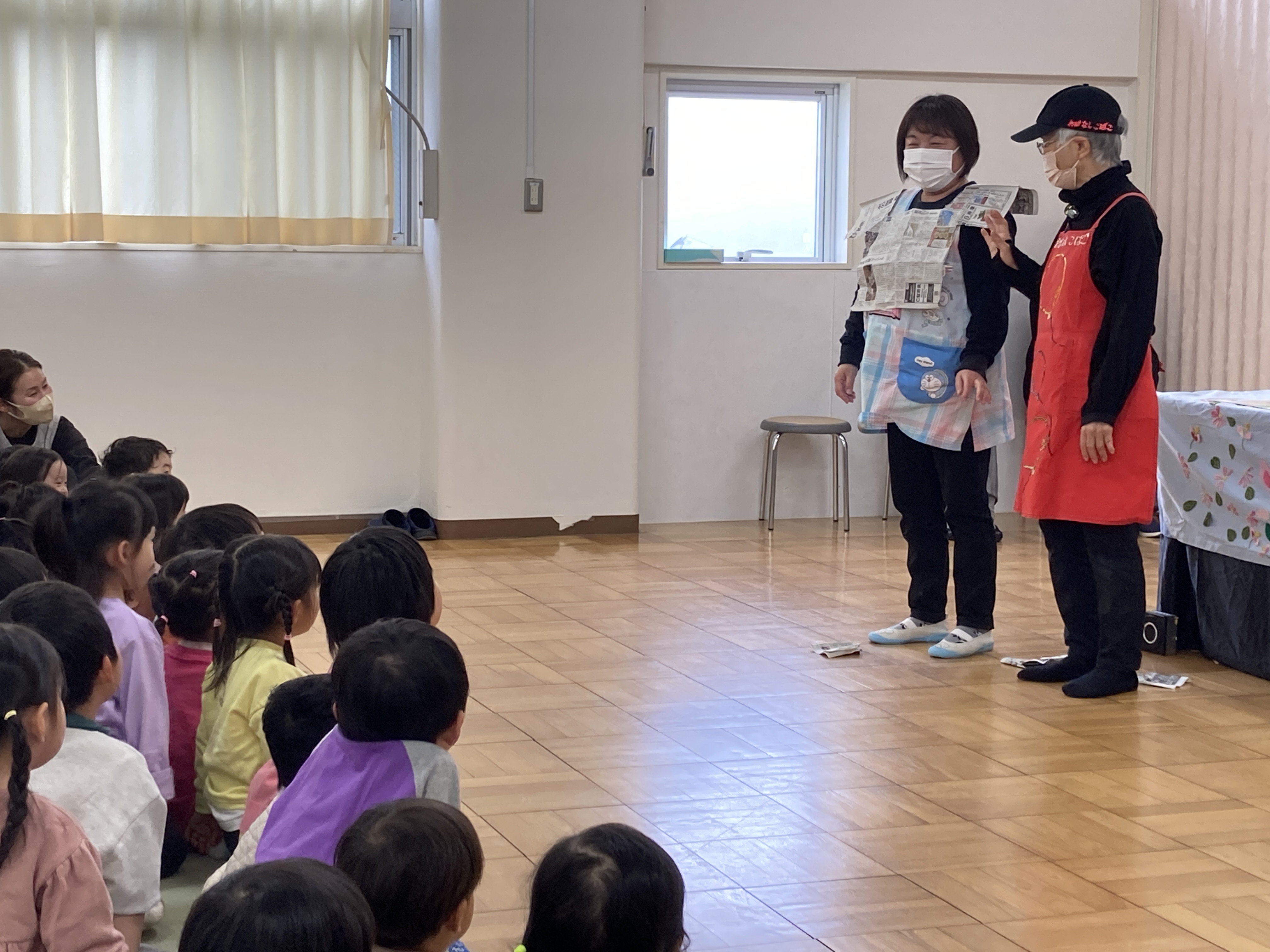 新聞を使った遊びや、『三匹のこぶた』の人形劇を披露していただきました。