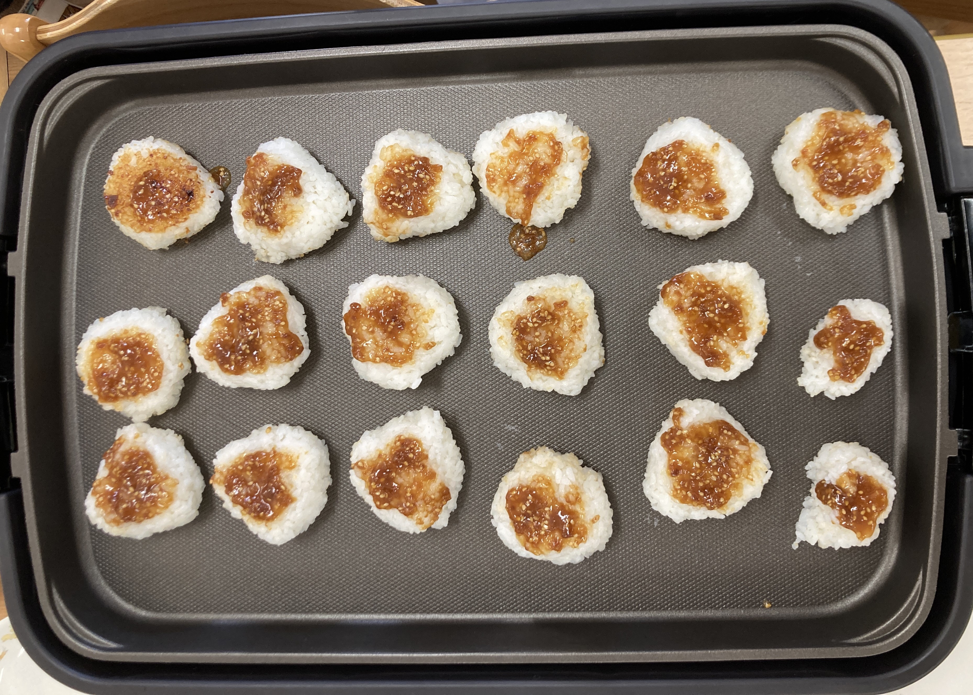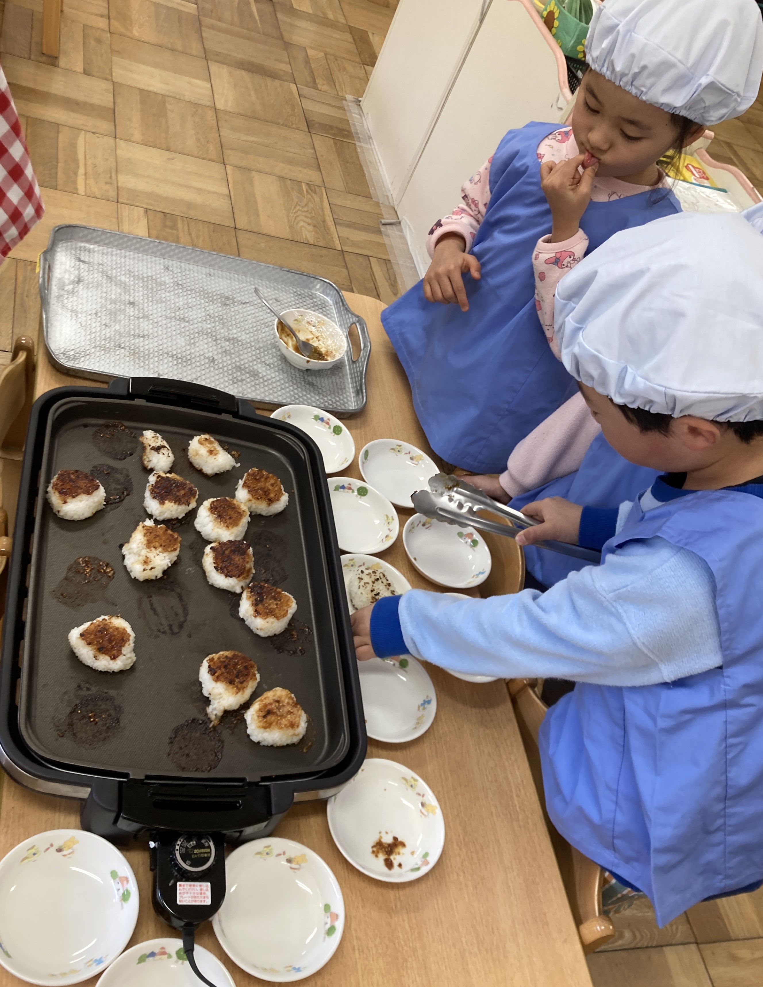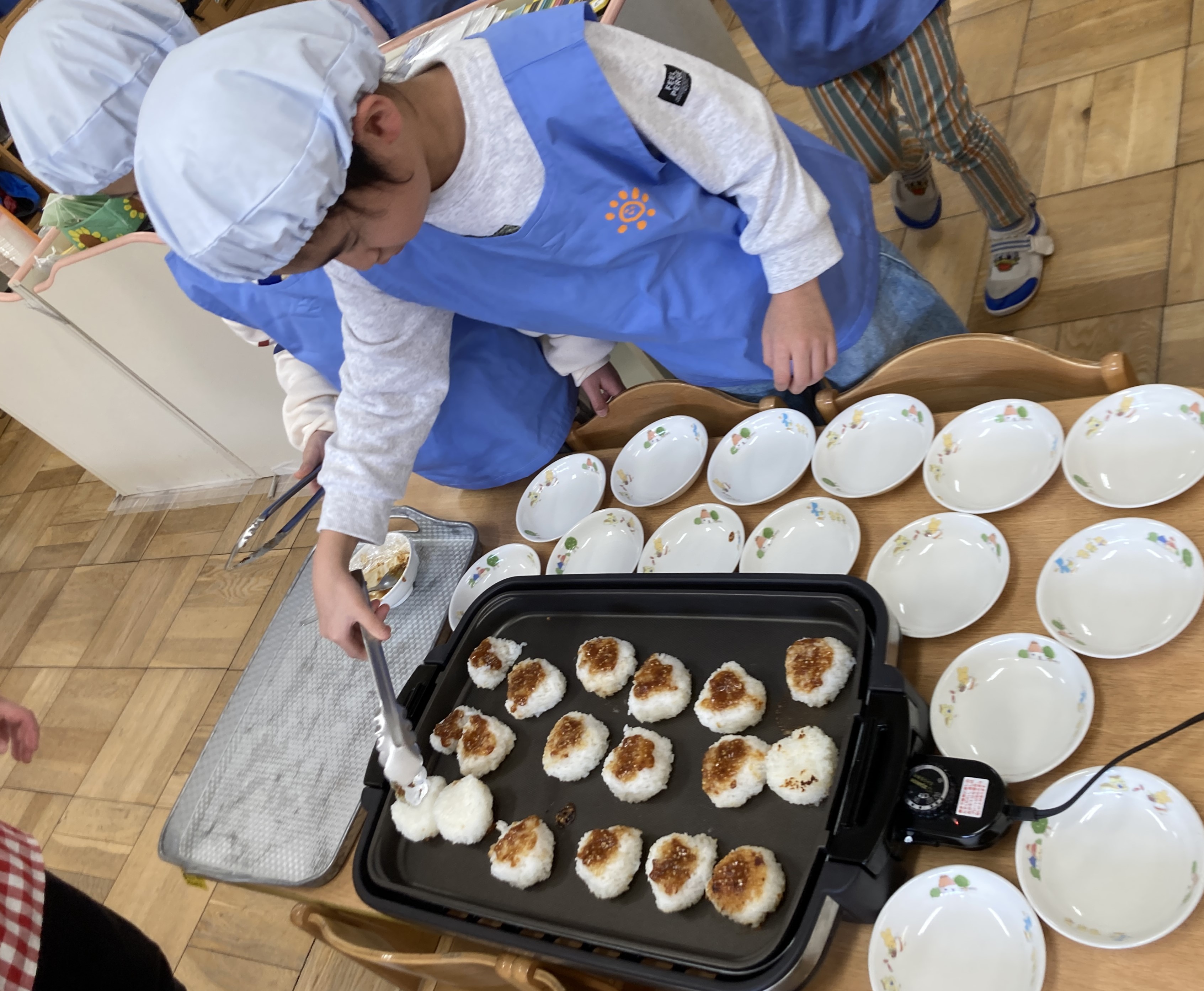 4歳児クラスの時に作った特製の手作り味噌を使ったみそだれをおにぎりに塗って、ホットプレートで焼きました。