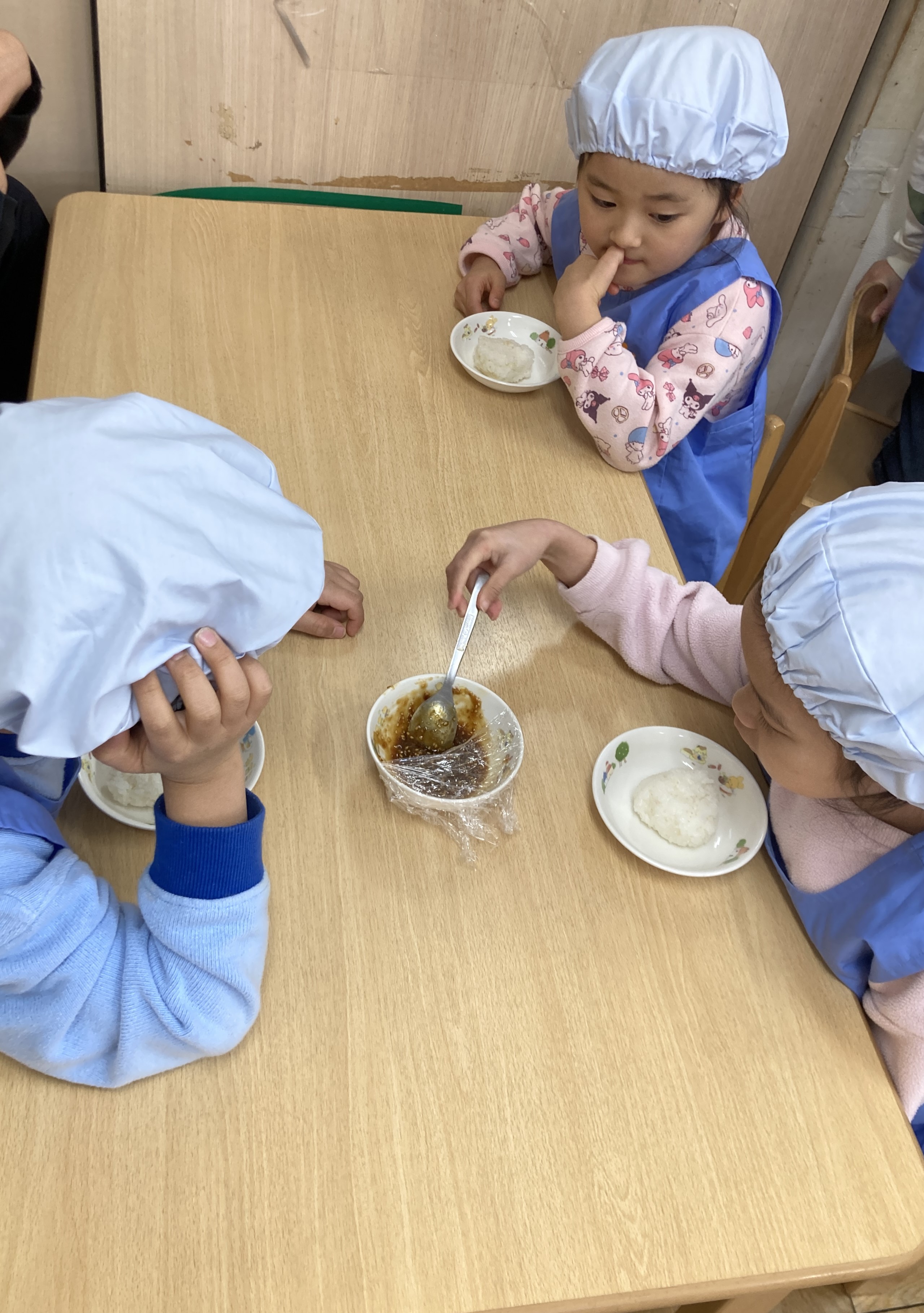 5歳児ひまわり組が、おやつの「焼き味噌おにぎり」を手作りして食べました!