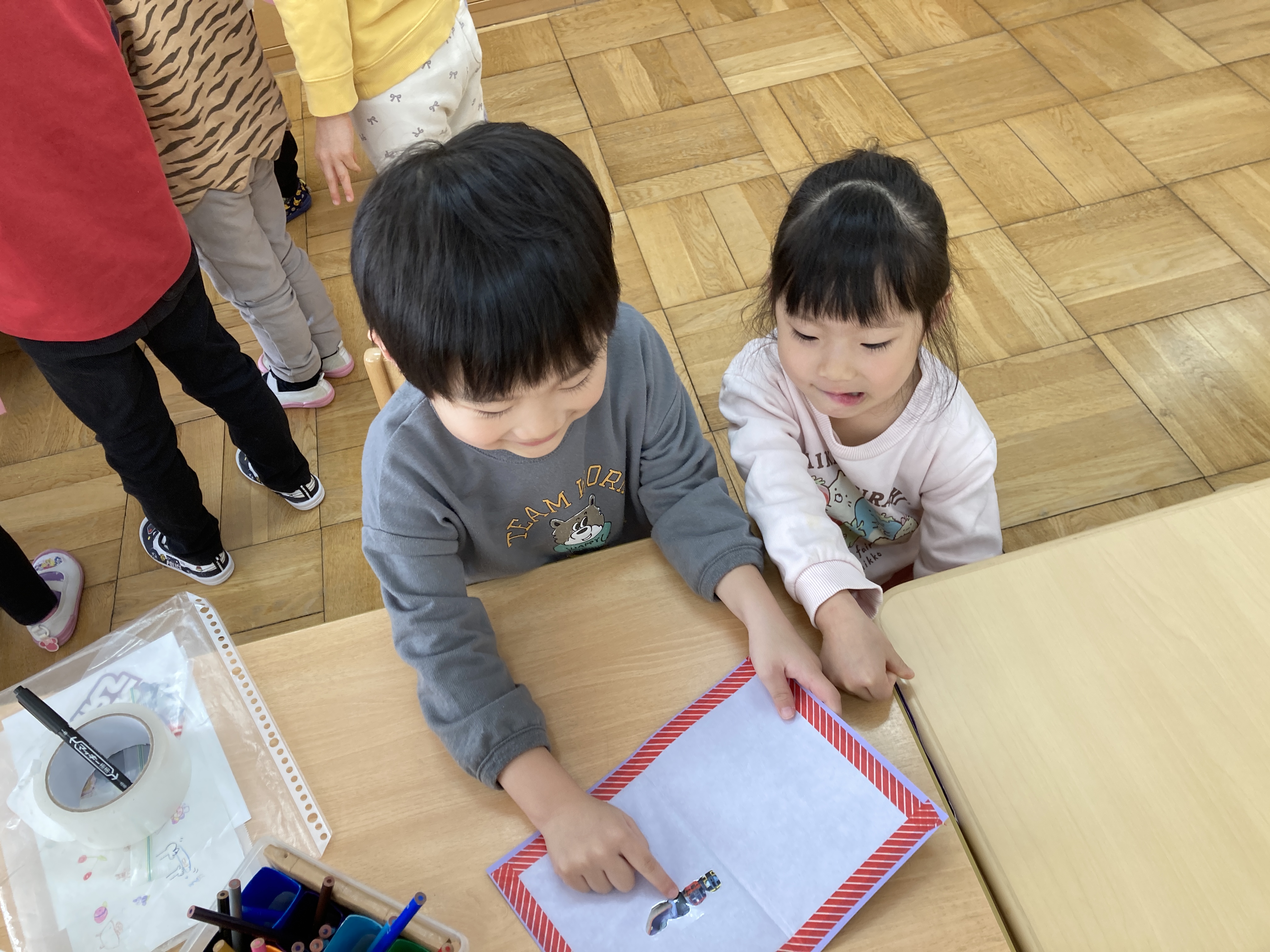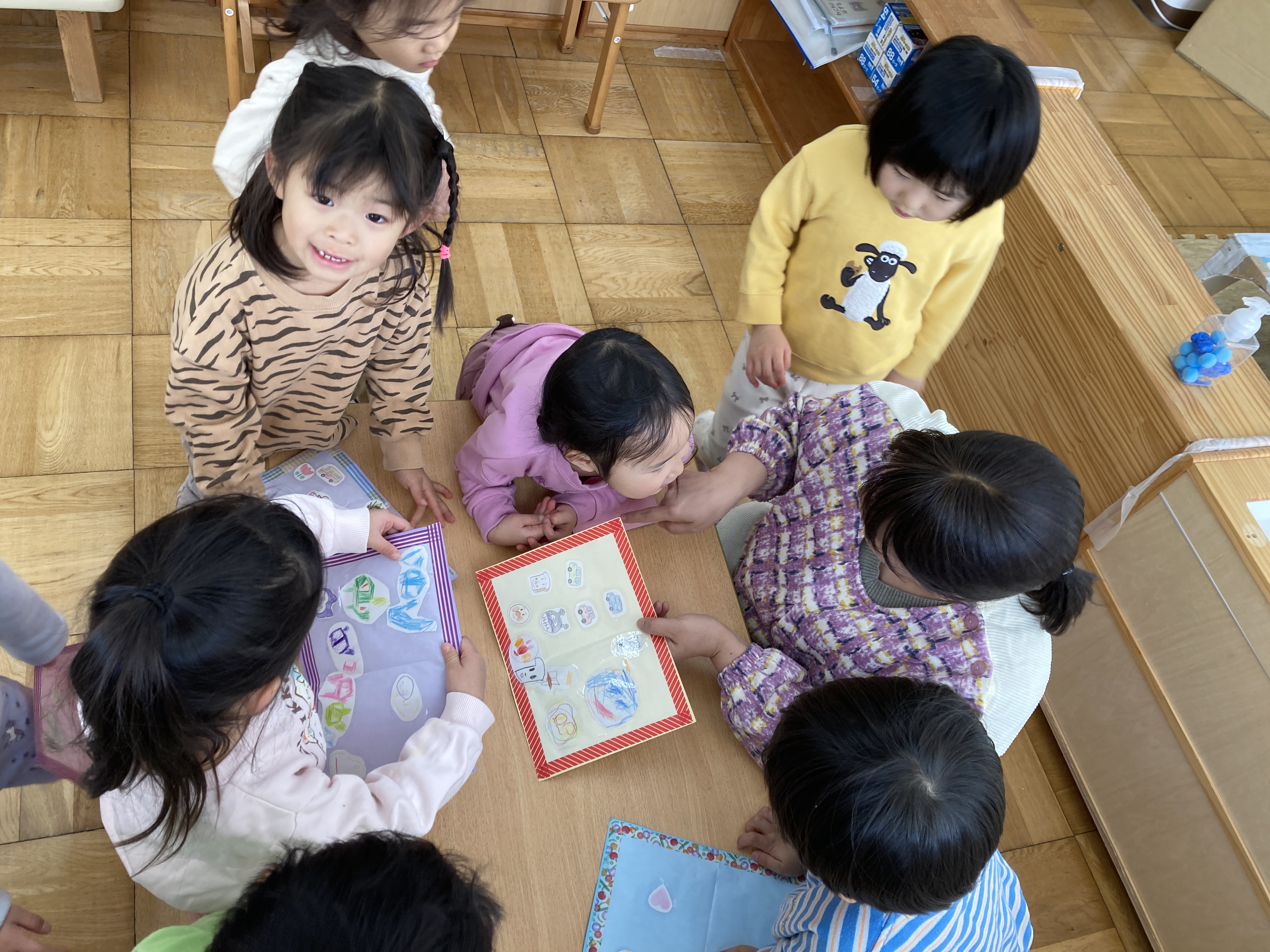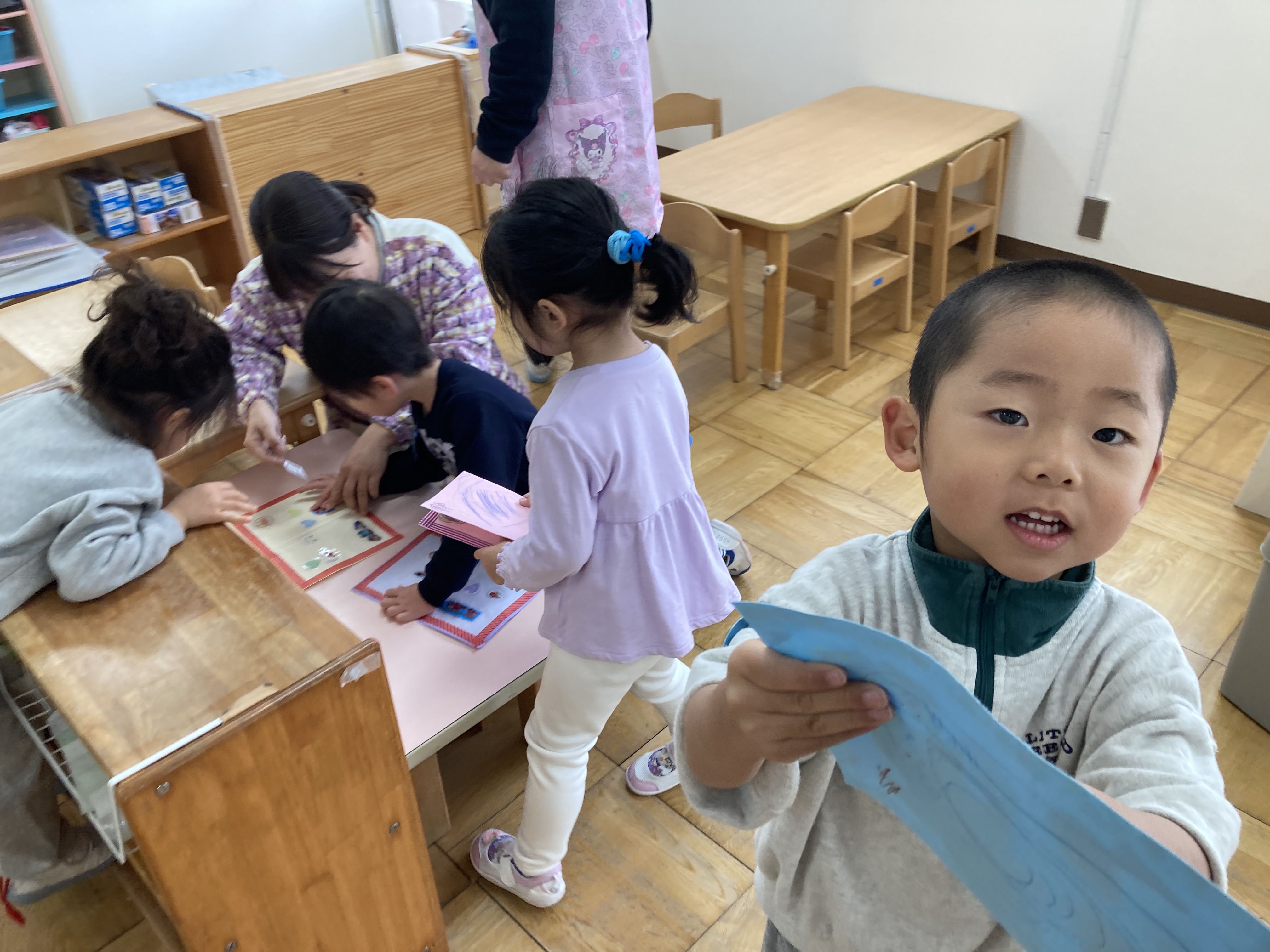 好きなイラストを選んで貼っていると「なんかシール帳みたいだね!」「シール交換したいね!」とお友だち同士で楽しそうな会話が聞こえたので・・・