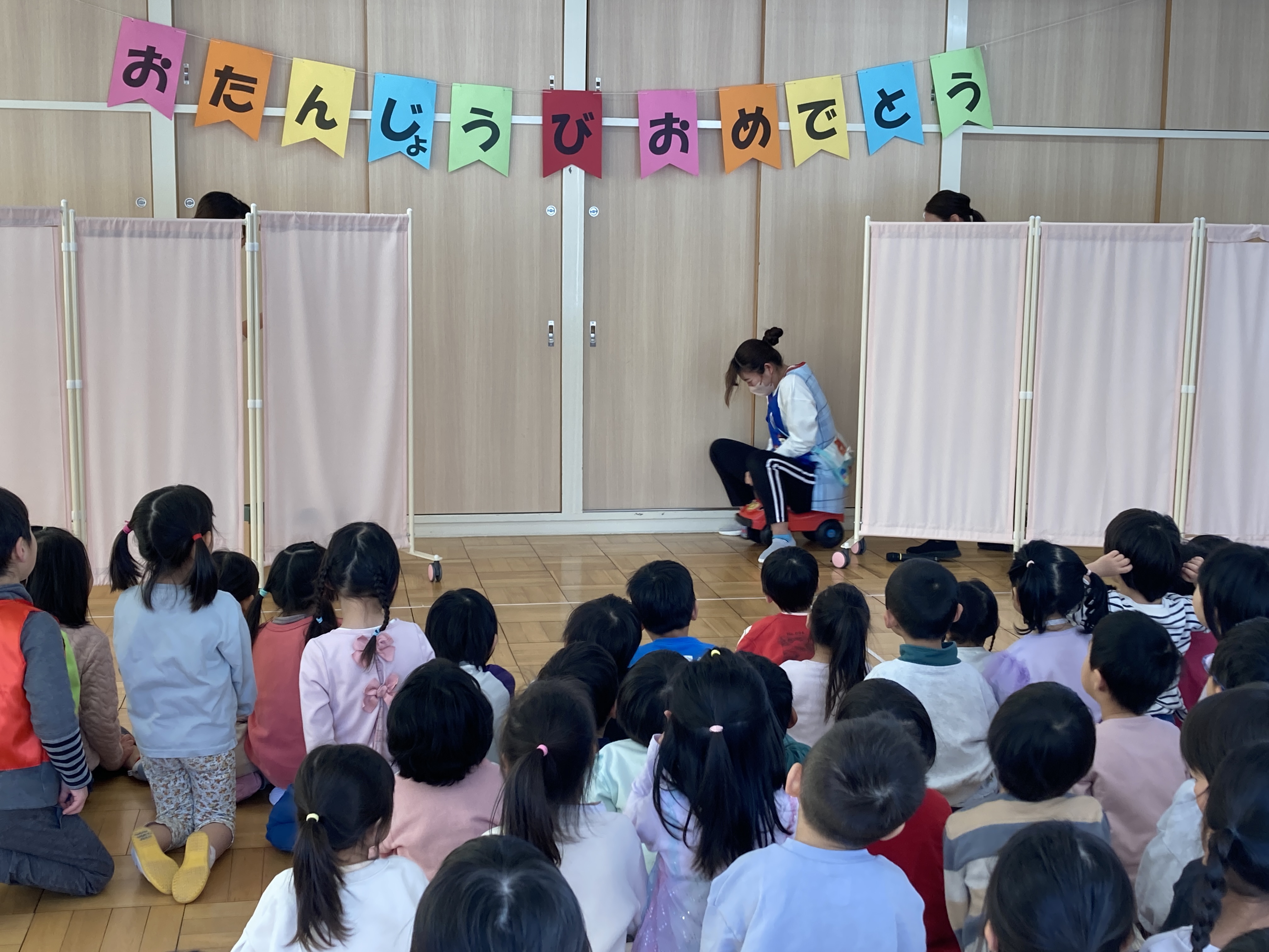 保育士からのお楽しみは、パーテーションの間から何が飛んでいたか当てるゲームでした。