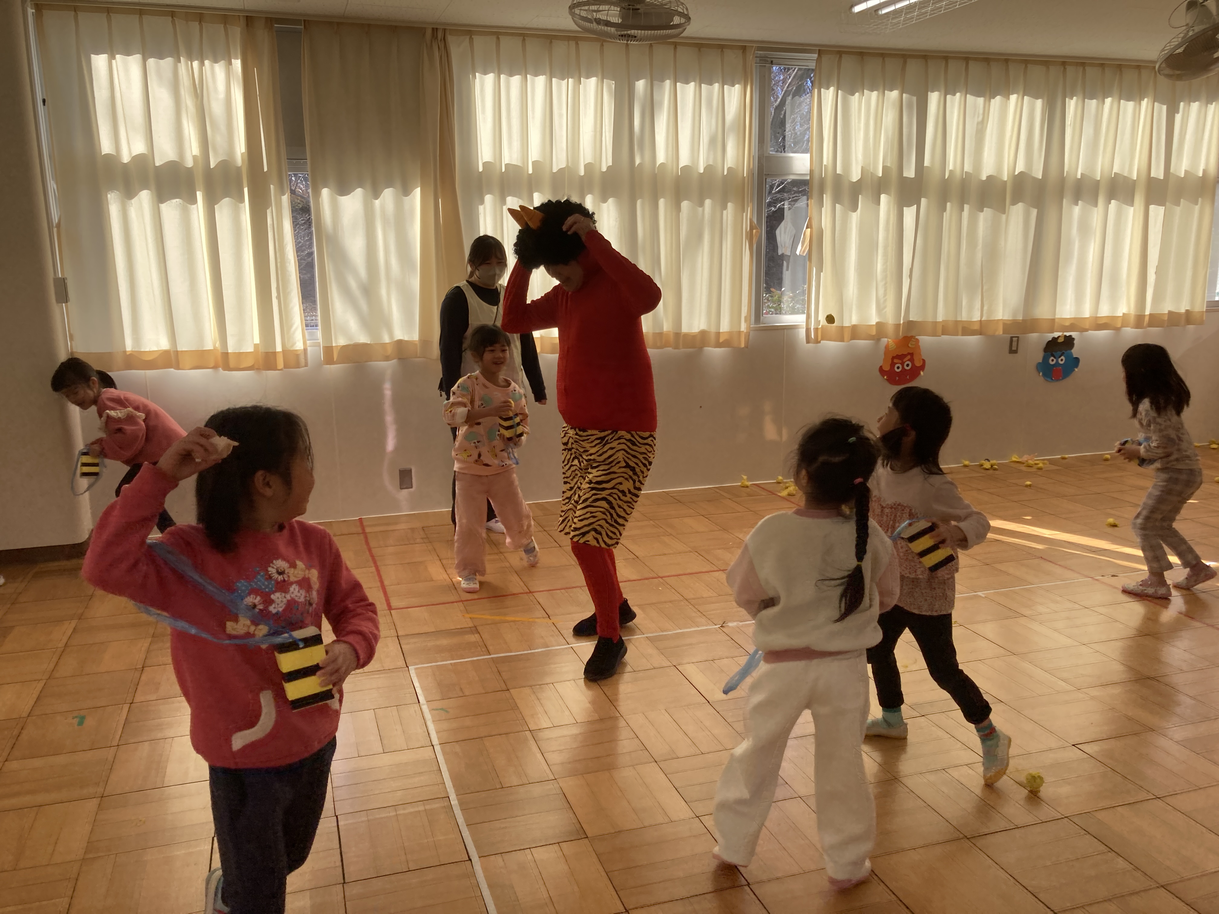 始まると「鬼はそとー!福はうちー!」と元気いっぱいの声が響き渡り、みんなで力を合わせて鬼を退治しました!
