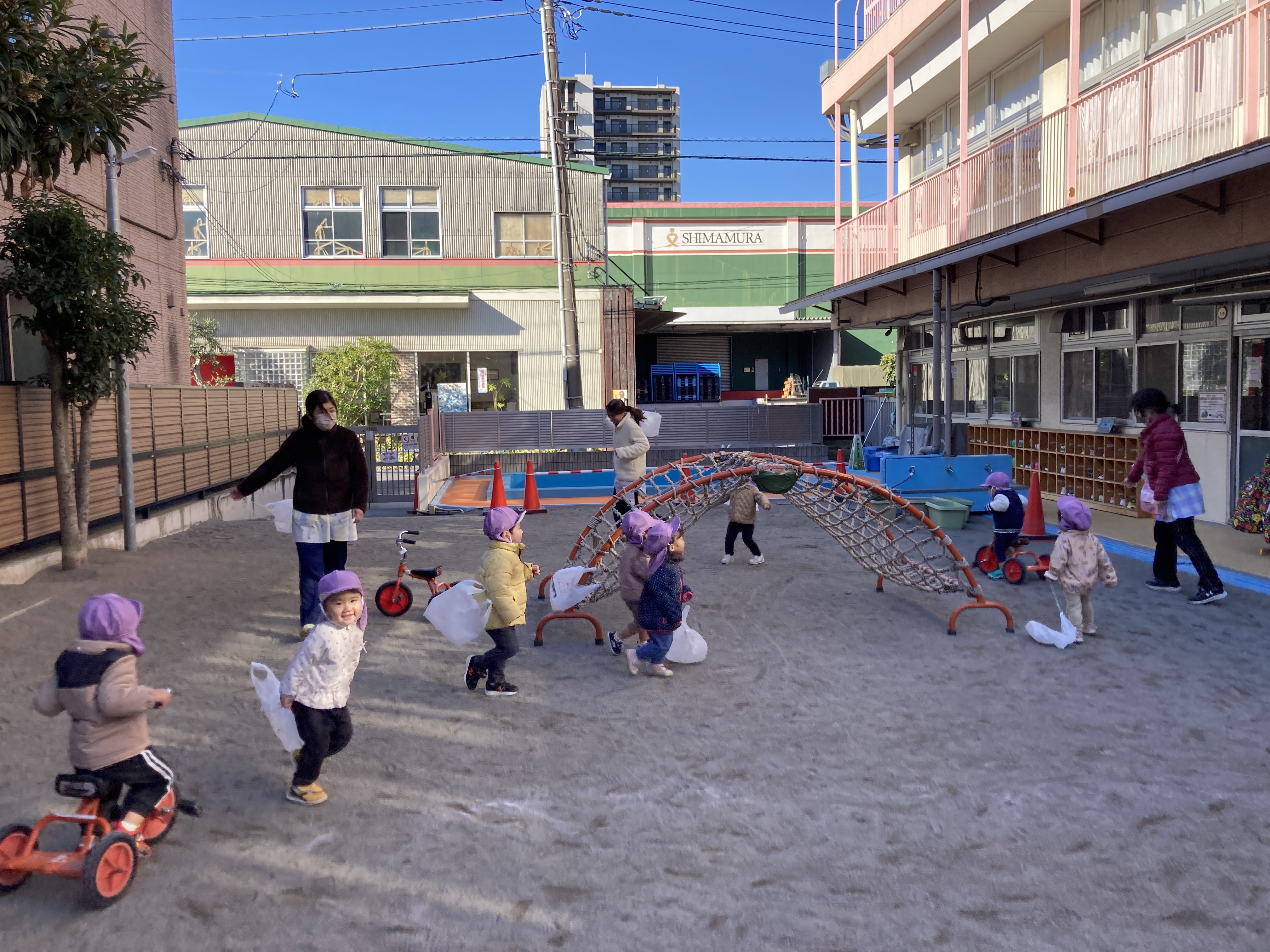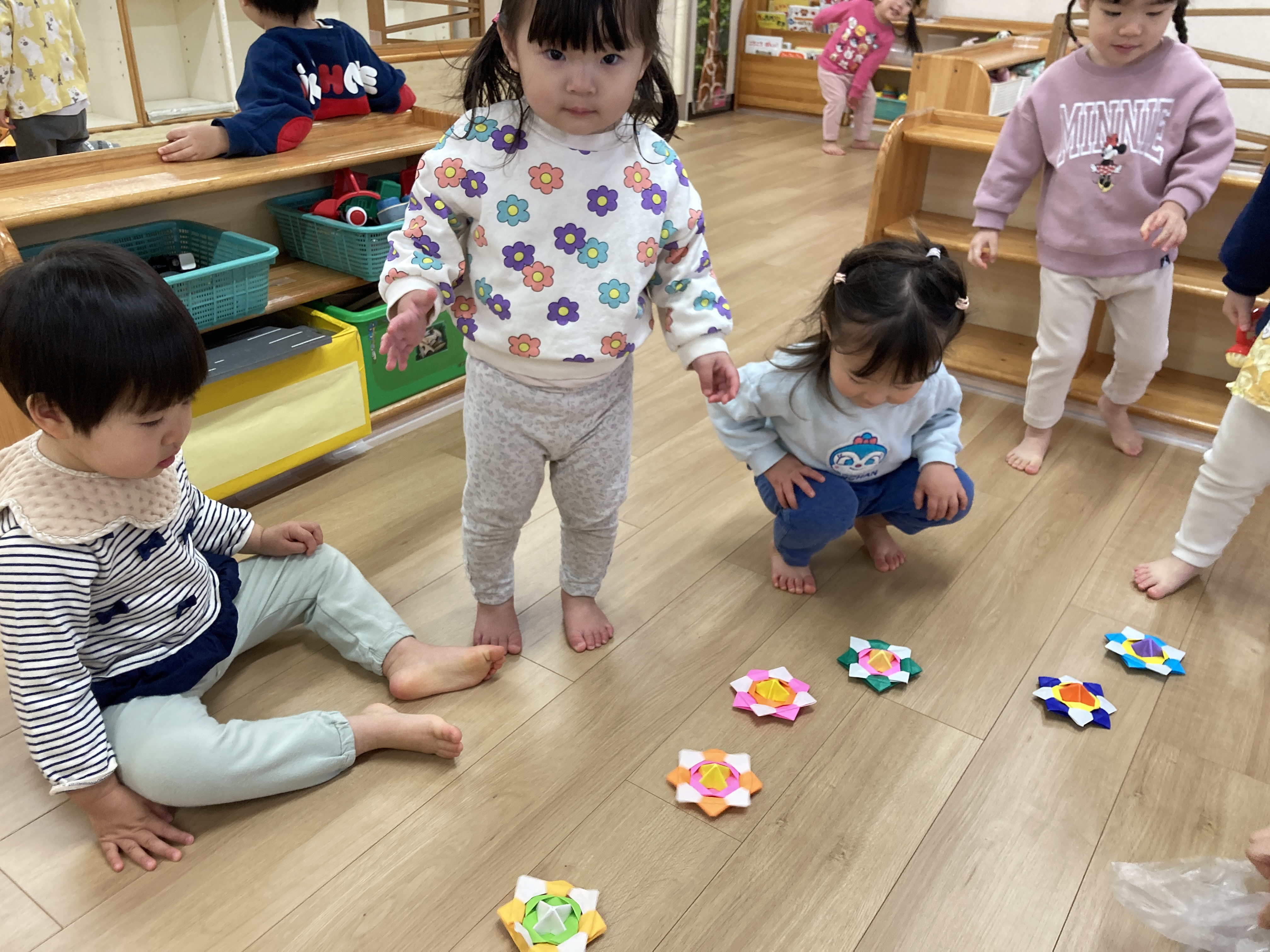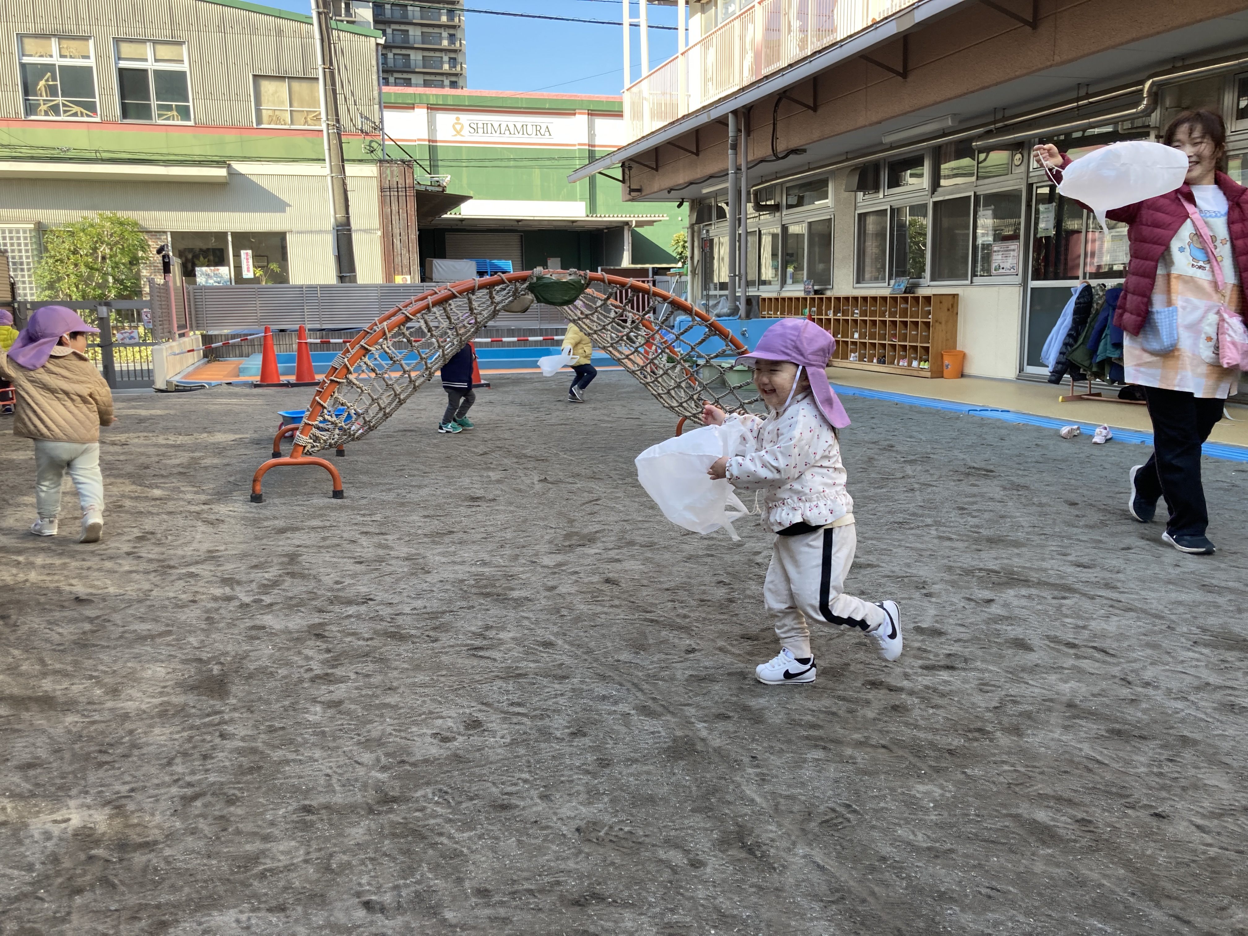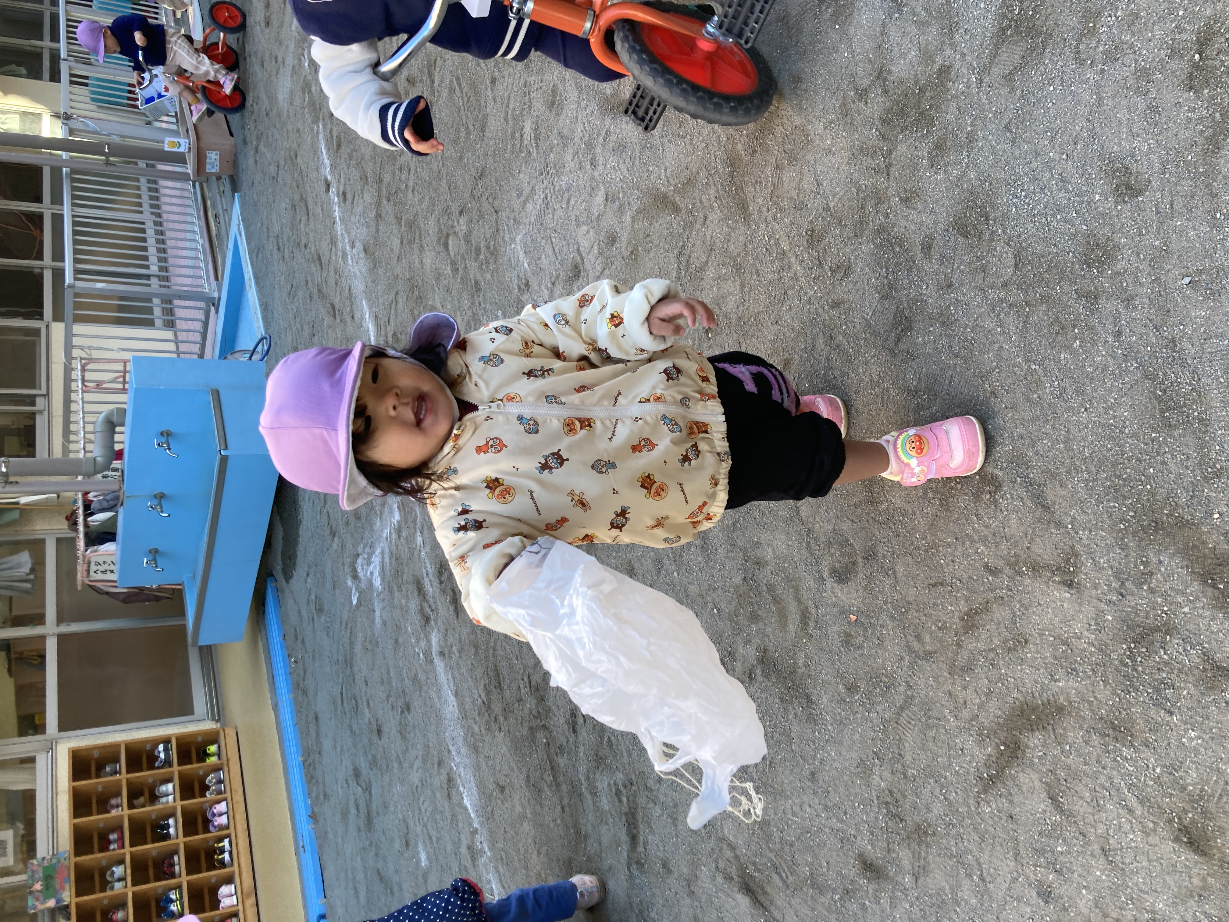 初めて見る「凧」にみんな興味津々で、「ちょうだ~い!」とあっという間に全部なくなり、みんなで全力で走って風を感じながらふんわりと飛ばして凧あげを楽しんでいました!
