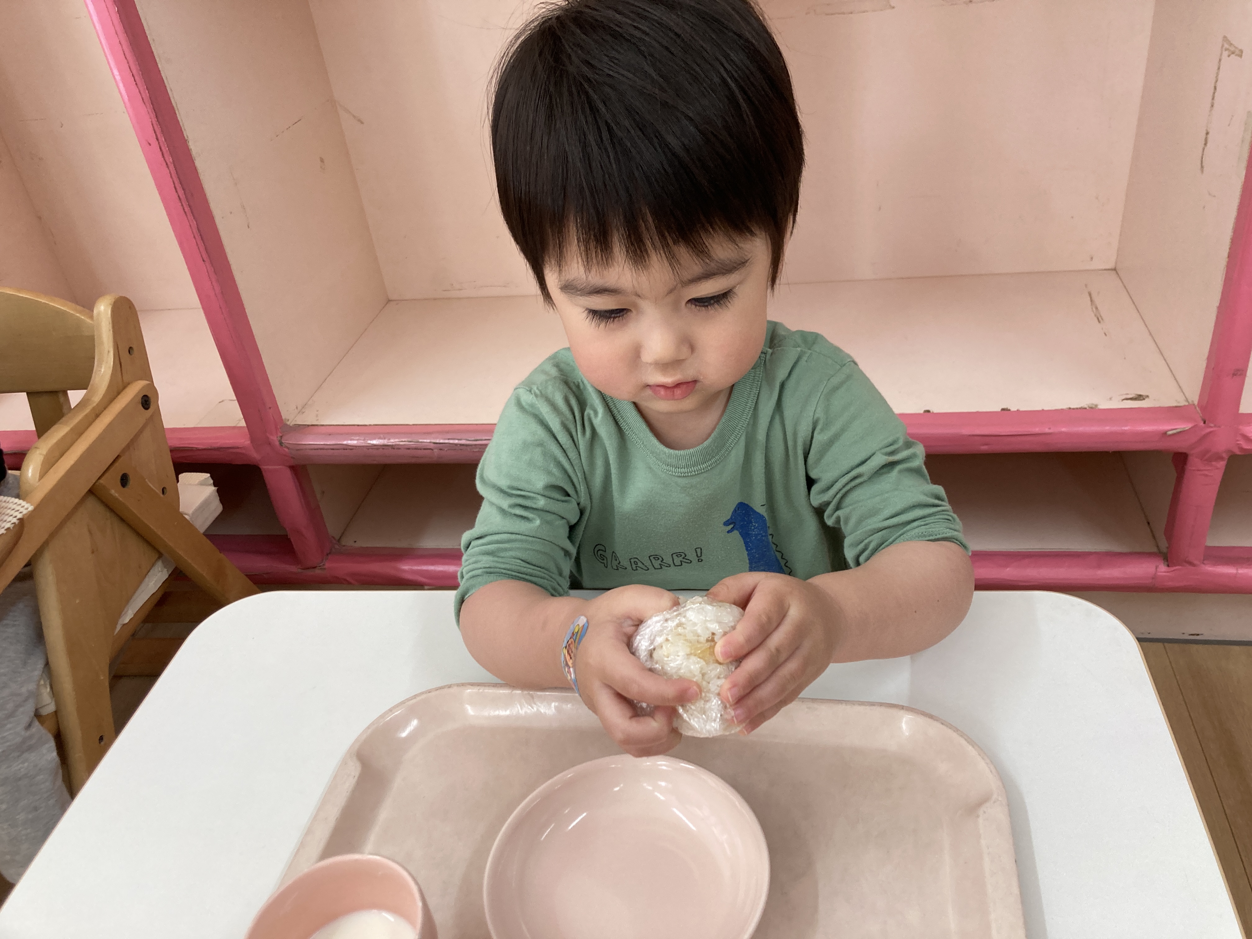 先日はおやつでおにぎりが提供され、ラップで包まれたおにぎりを自分で握りました。