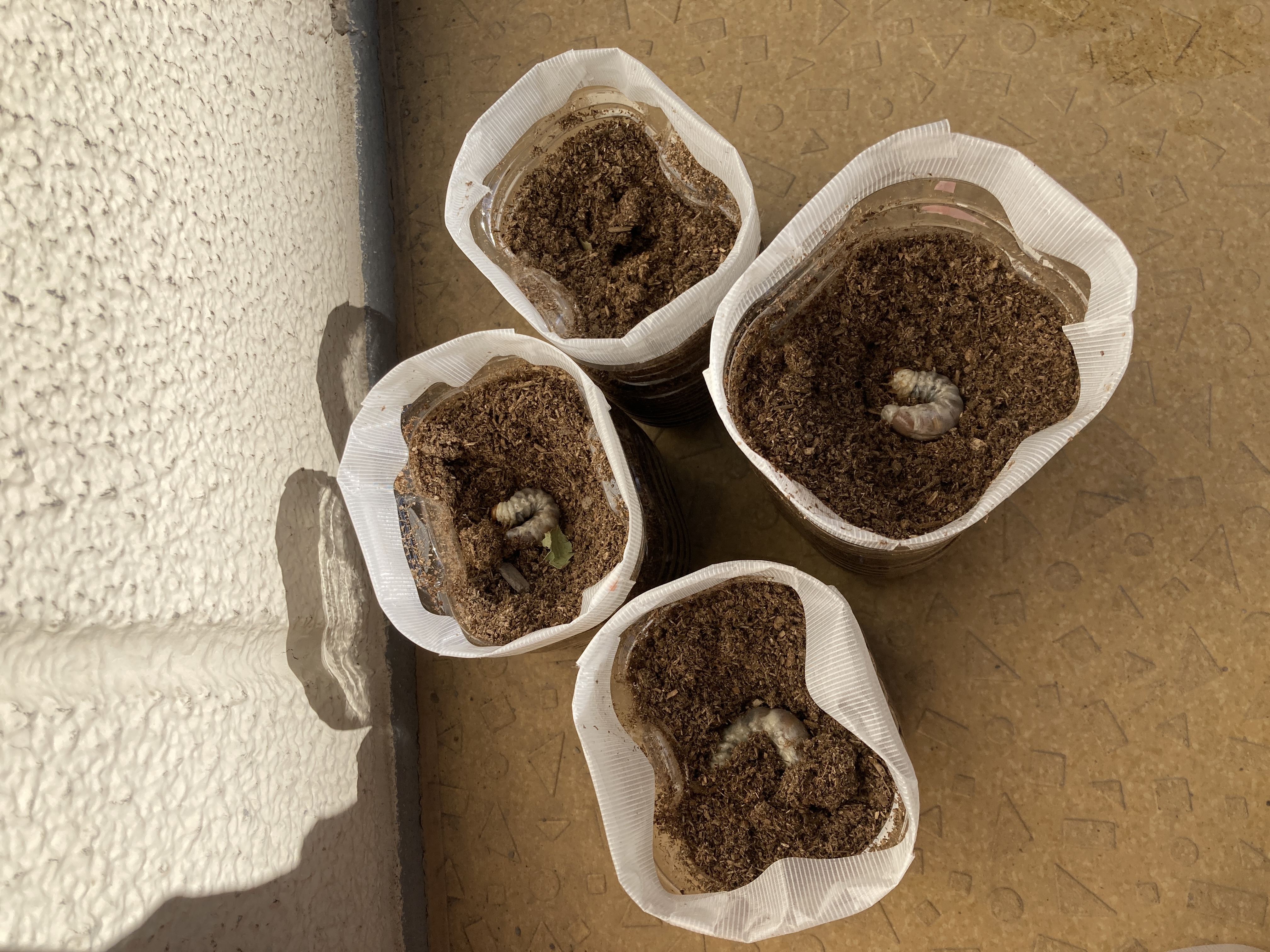現在では、生まれてきた4匹の幼虫と、カブトムシの幼虫1匹も一緒に飼育しています。