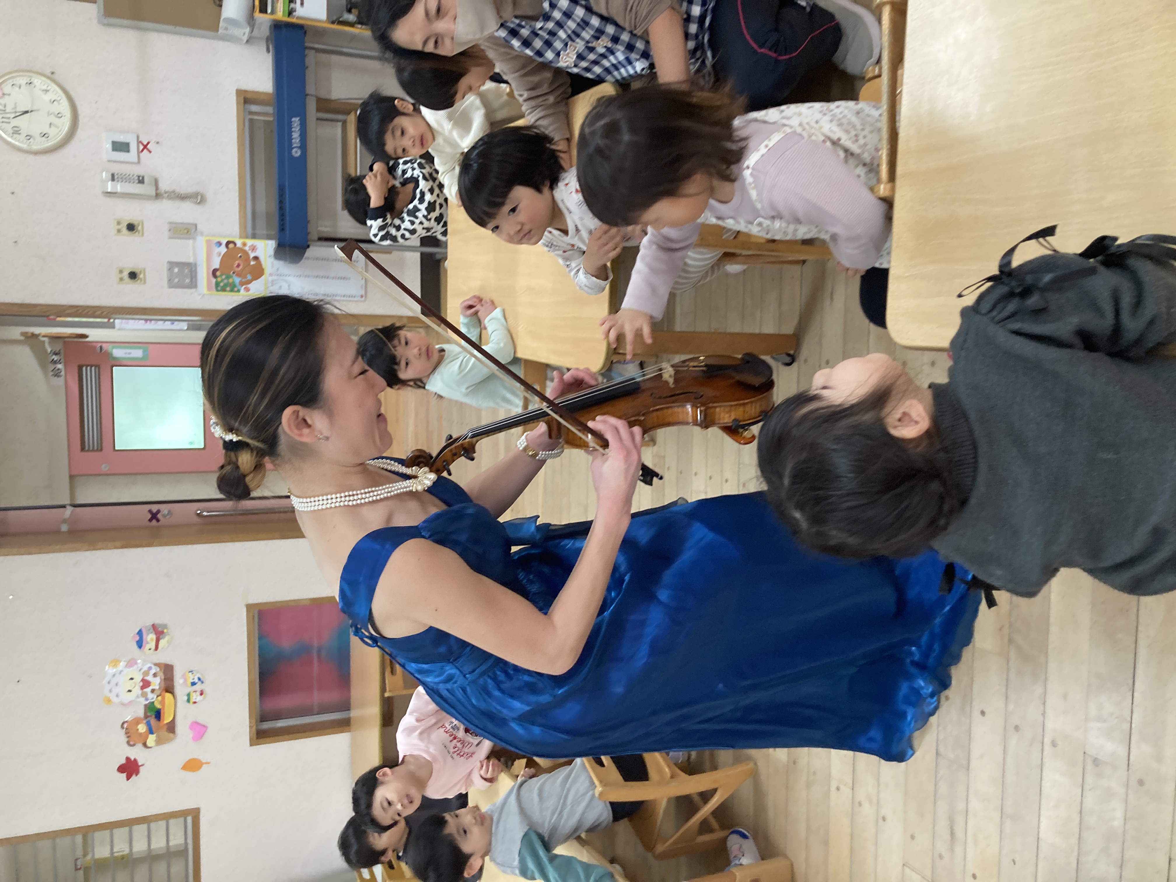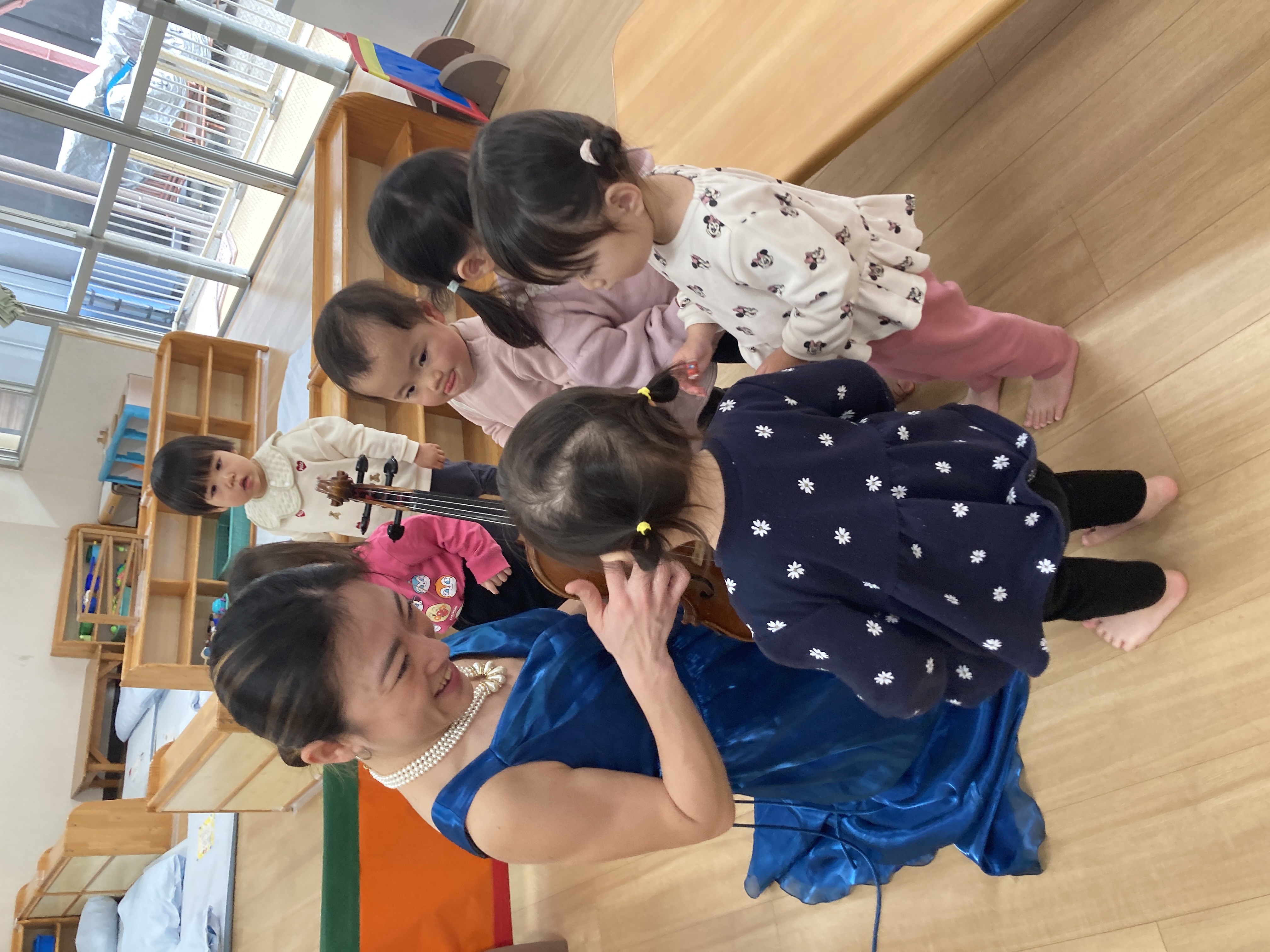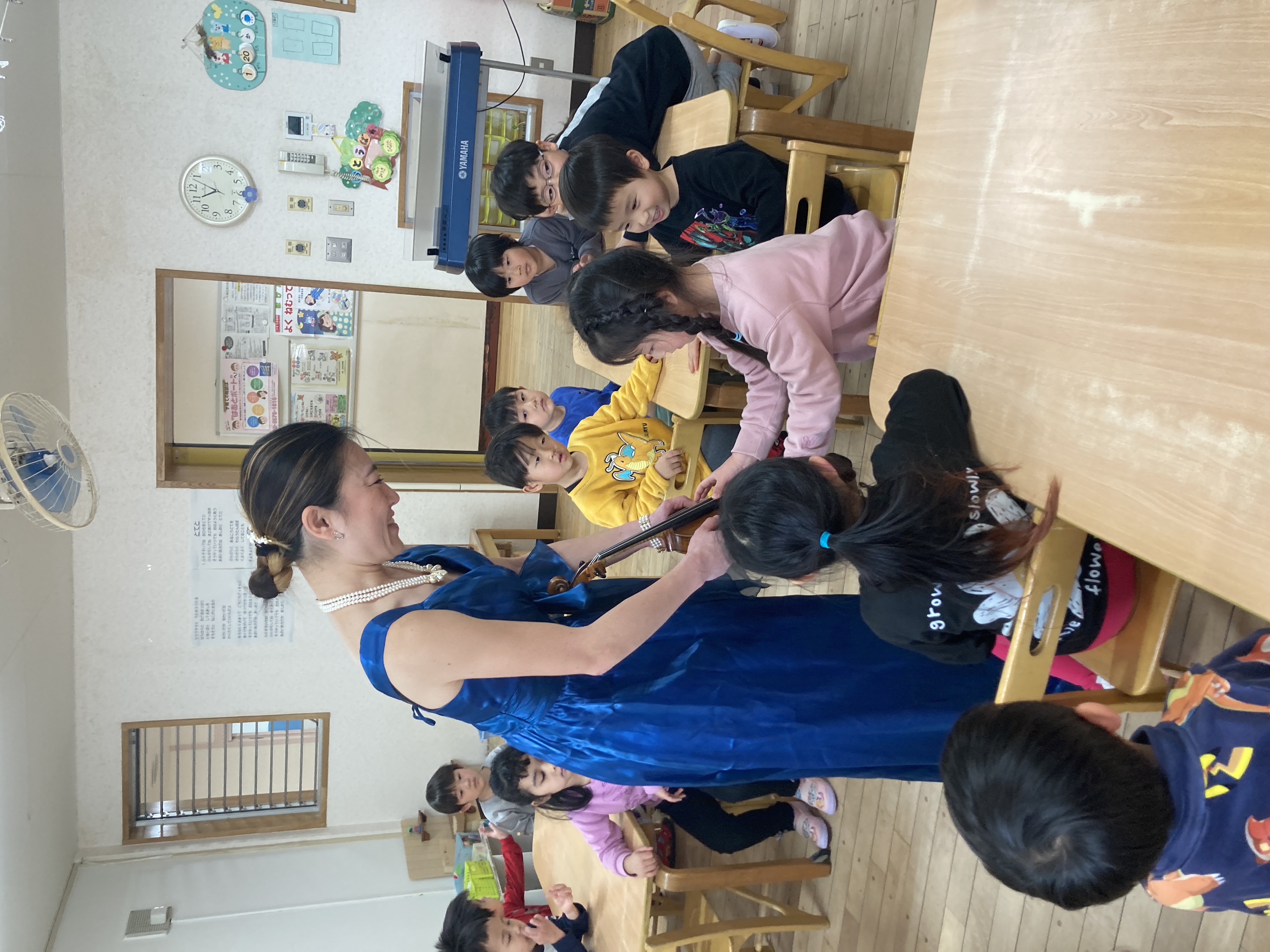お部屋では好きな曲をリクエストしてピアノで演奏してもらったり、バイオリンの音を間近で聴いたり、バイオリンの絃に触れる機会も作っていただき、子どもたちは大喜び!