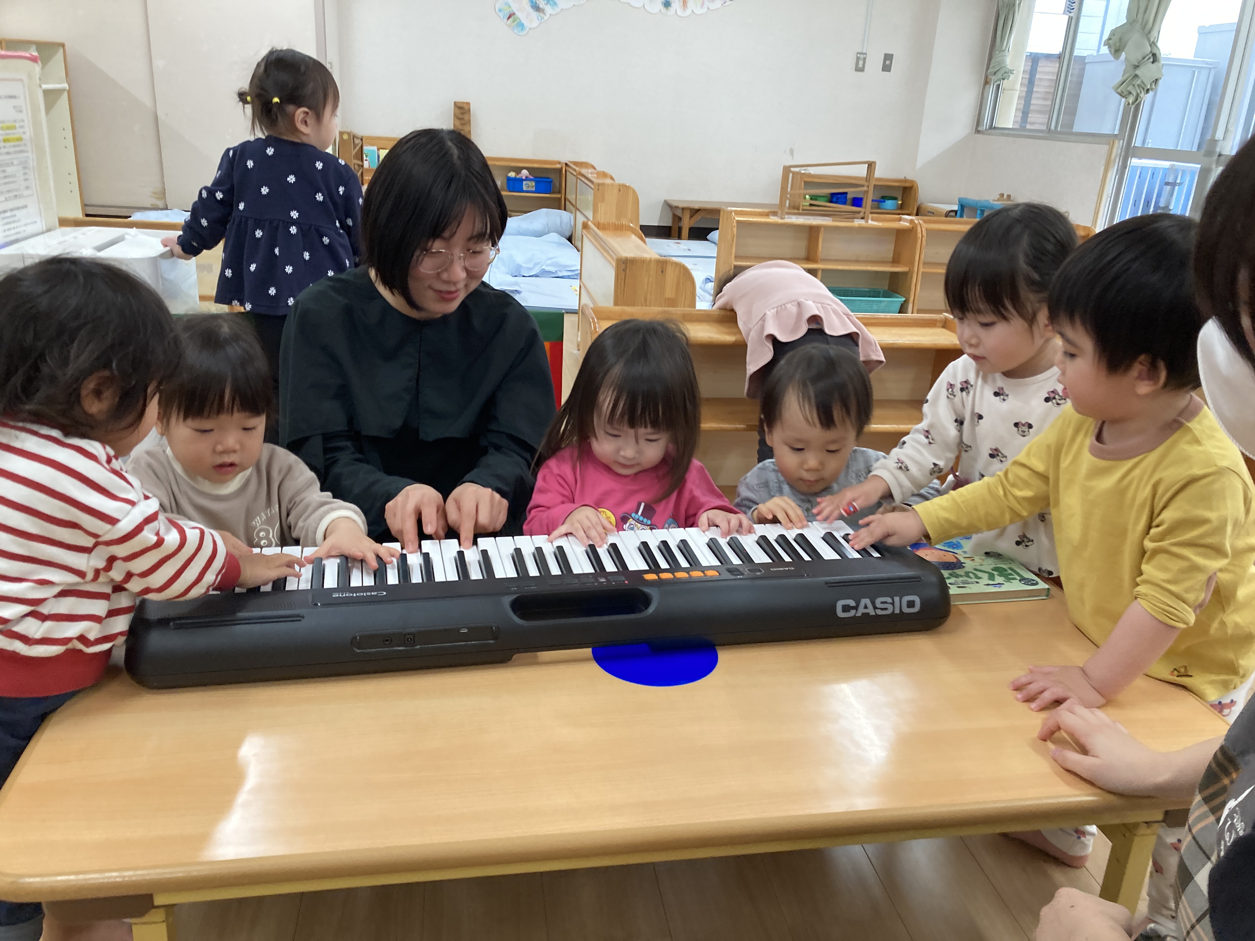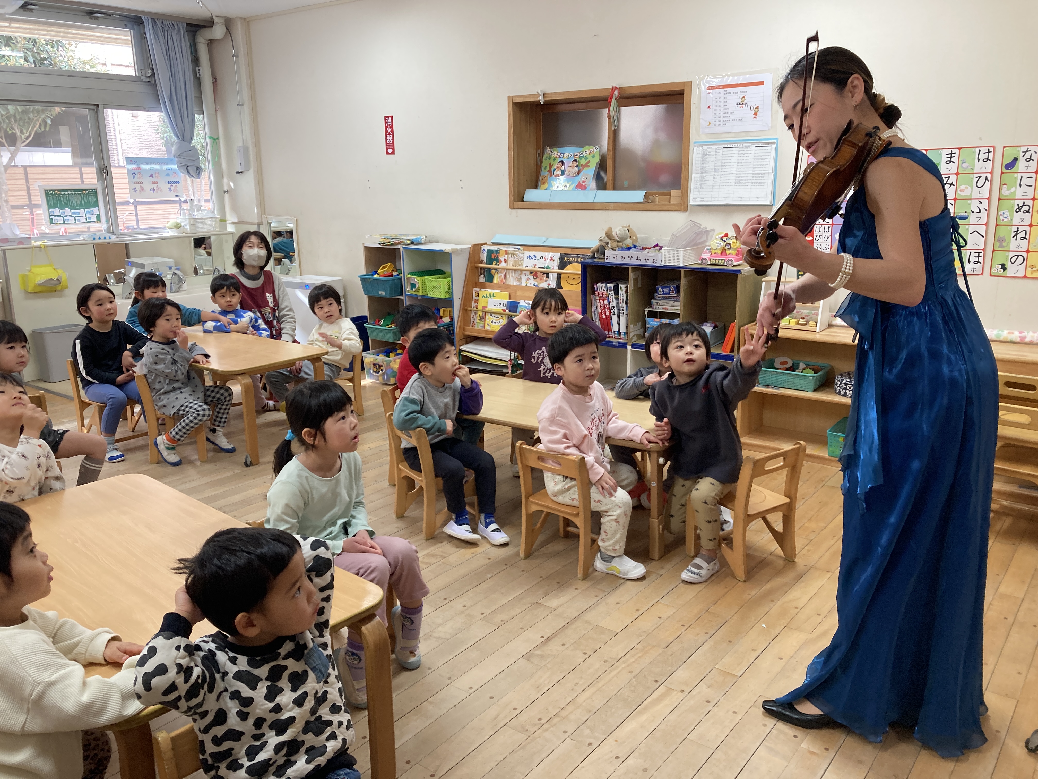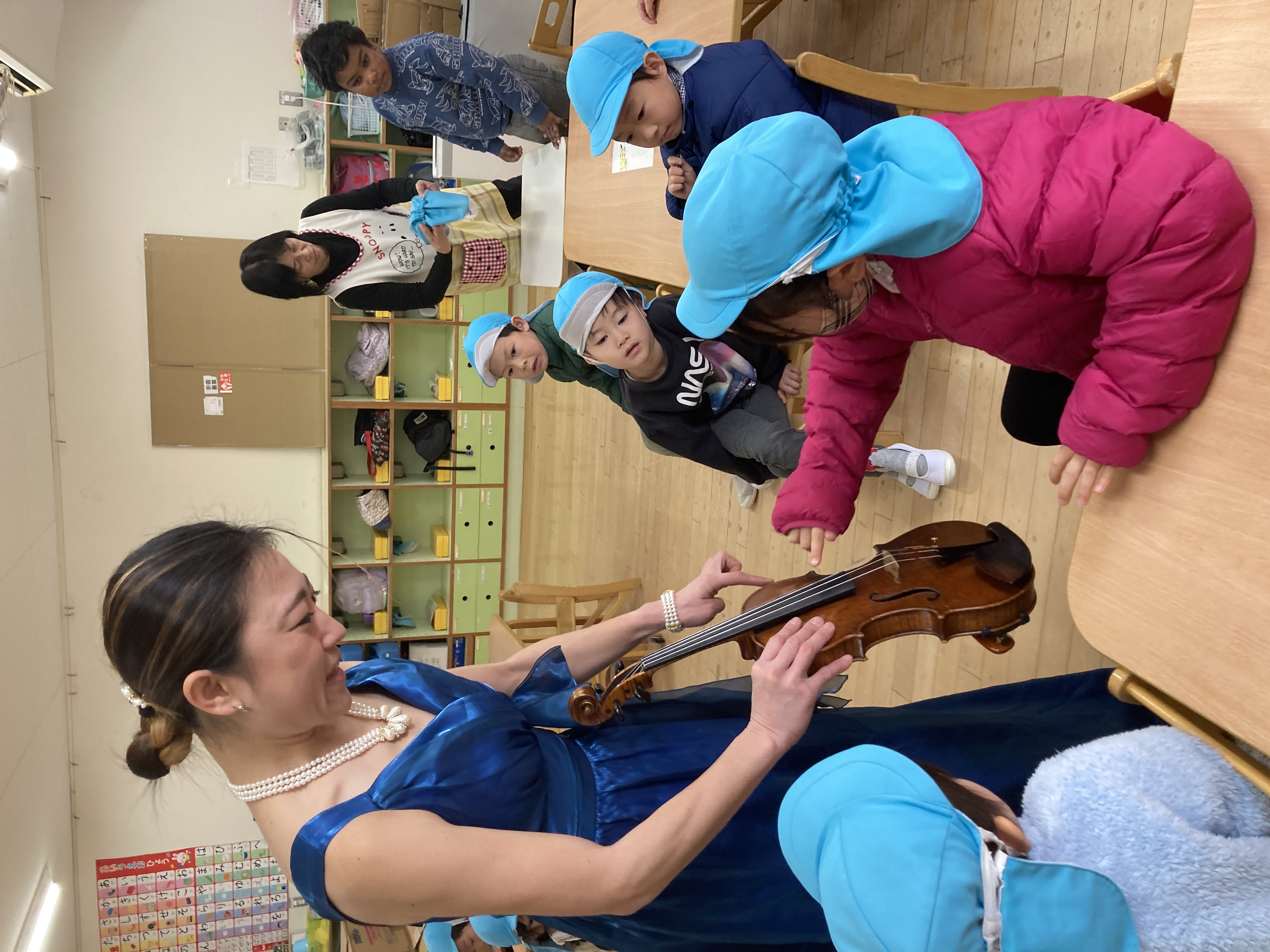 お部屋では好きな曲をリクエストしてピアノで演奏してもらったり、バイオリンの音を間近で聴いたり、バイオリンの絃に触れる機会も作っていただき、子どもたちは大喜び!