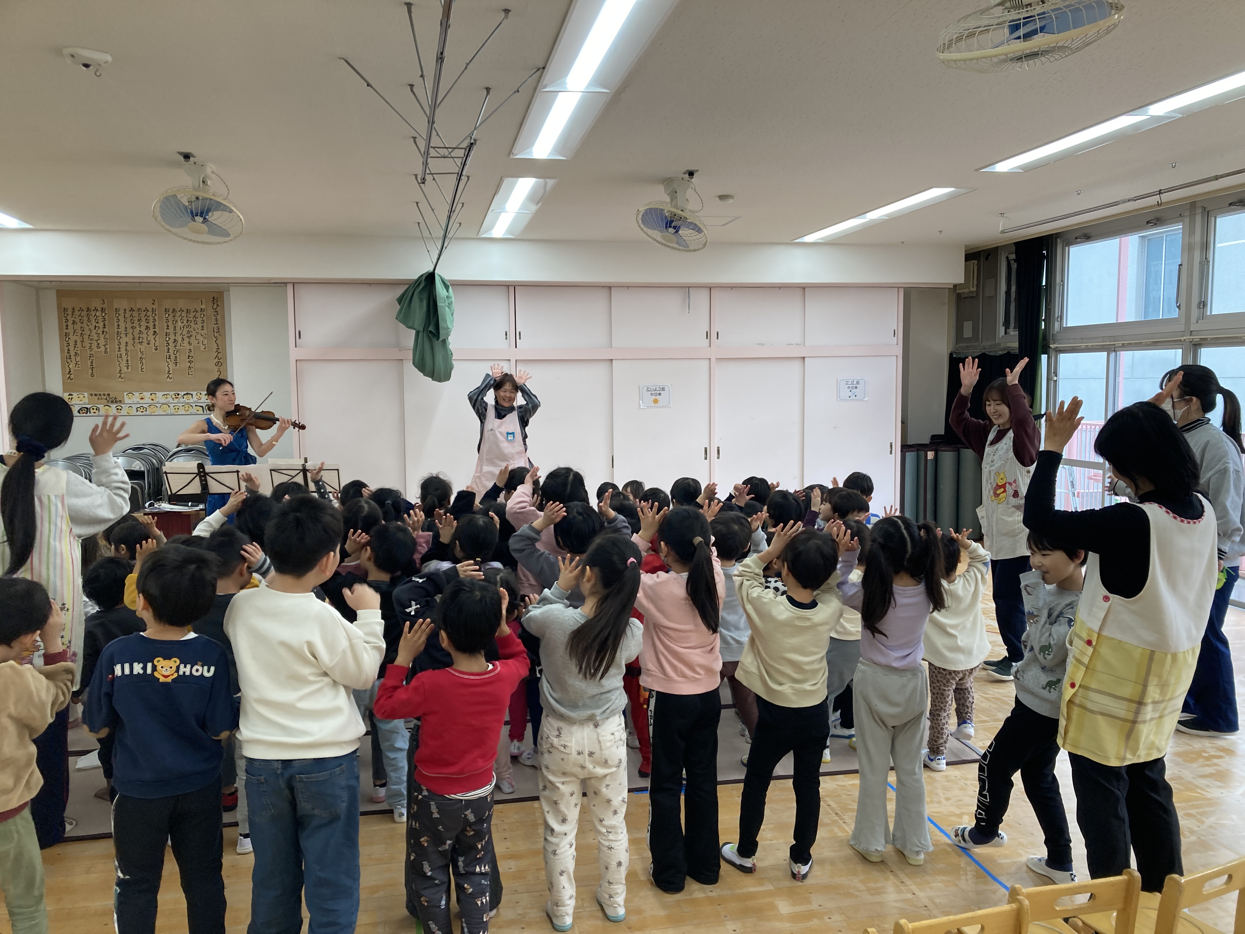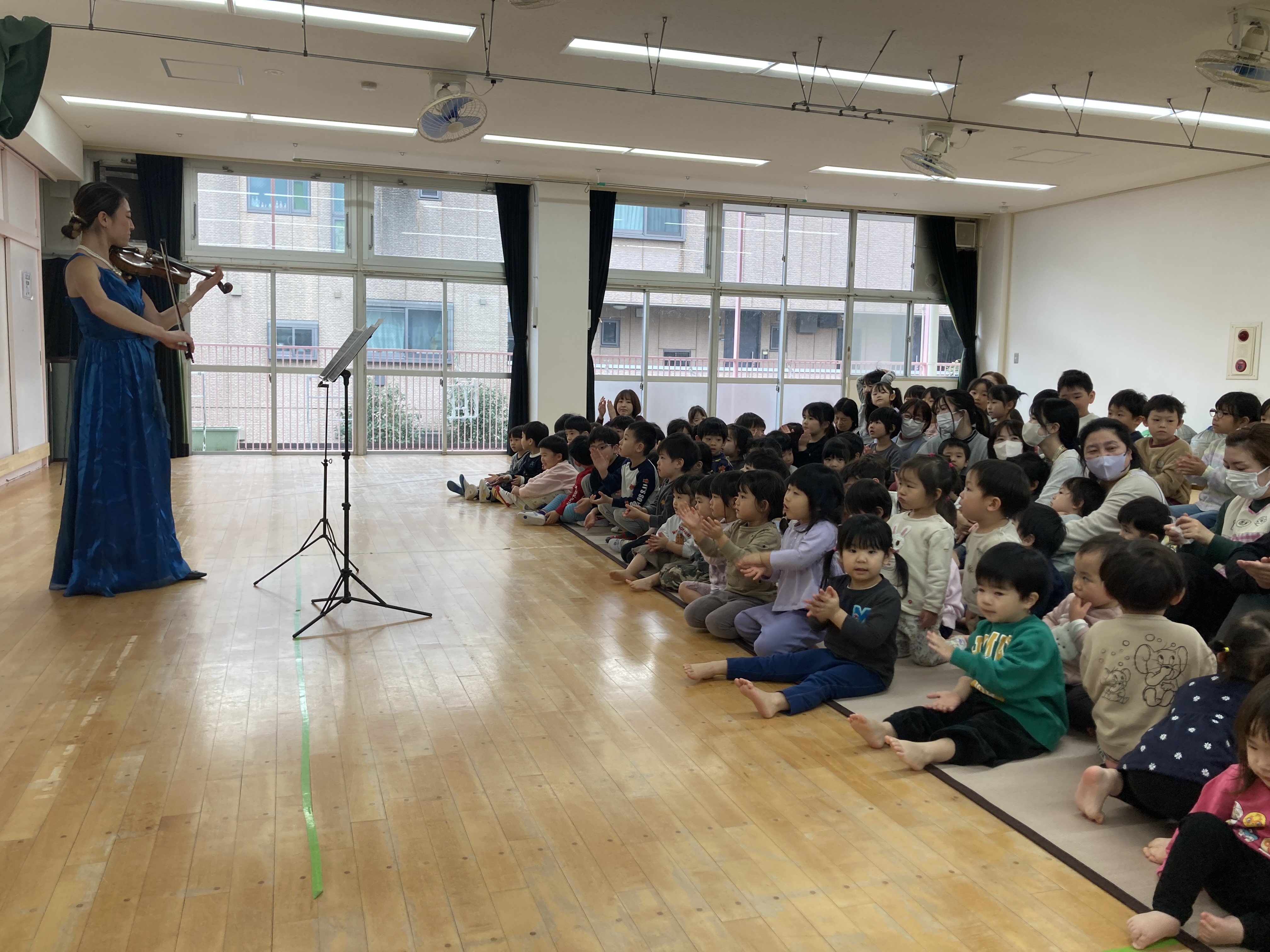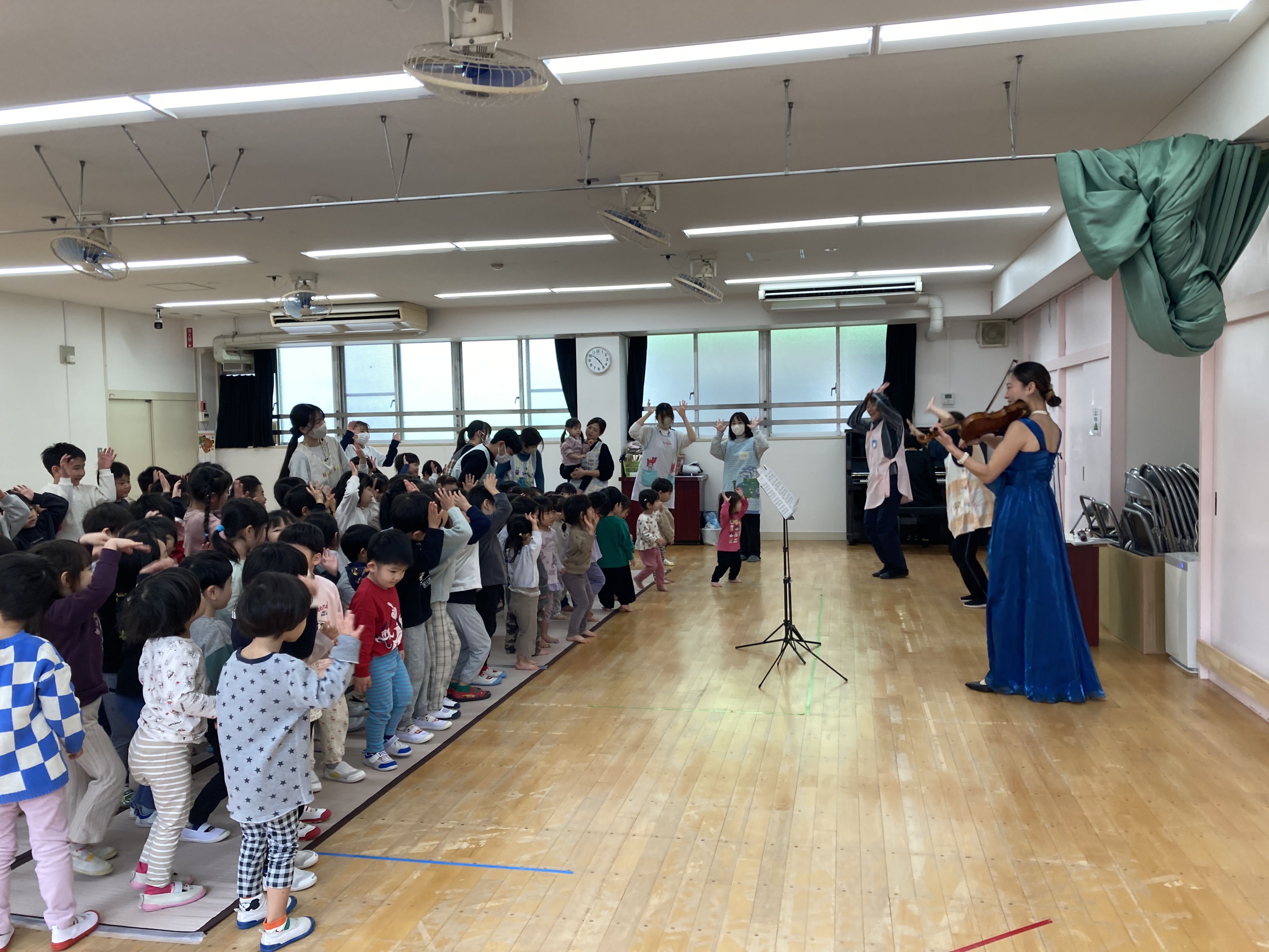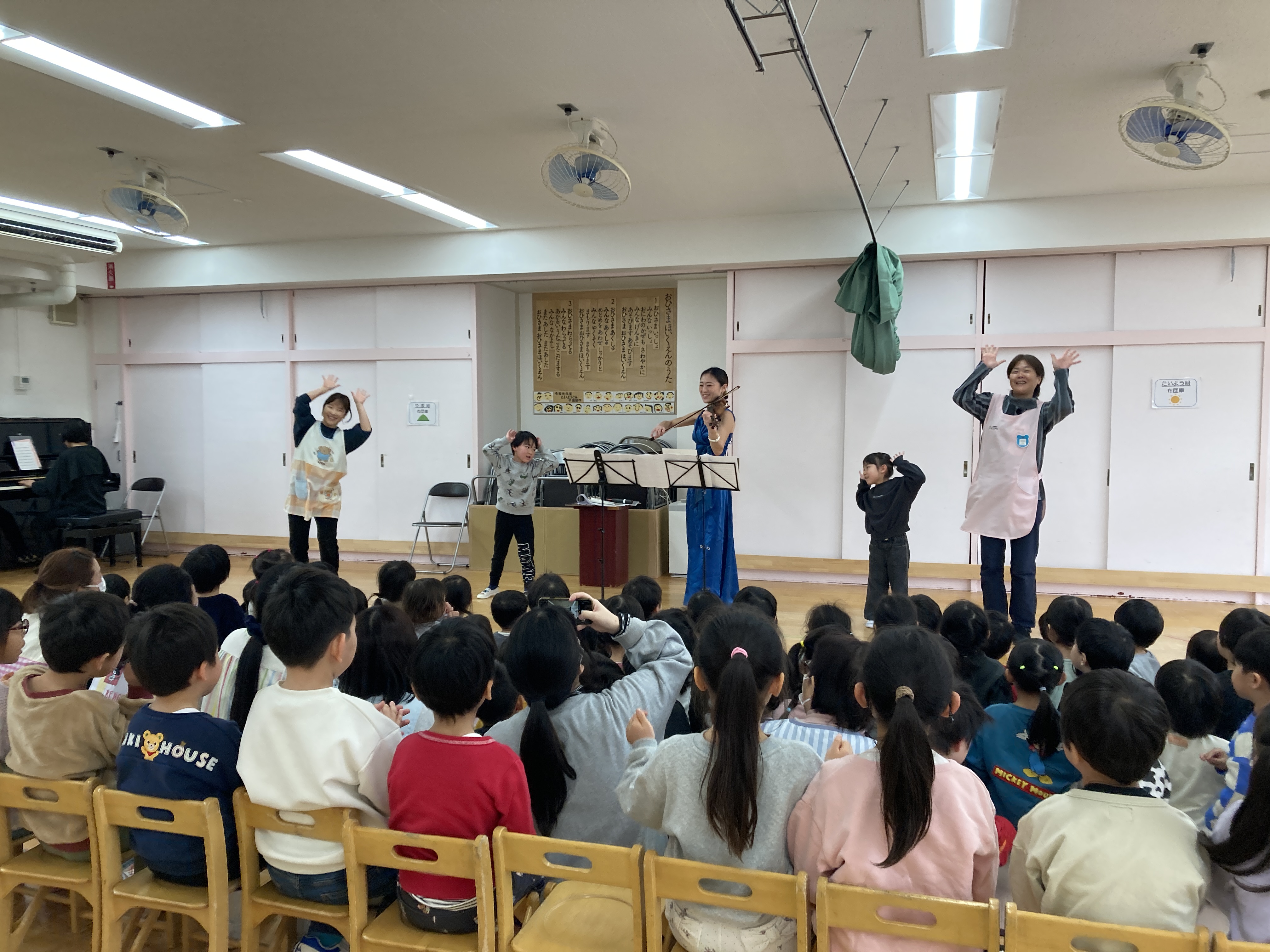 クラシックのかっこいい曲から始まり、みんなが大好きなディズニーのプリンセスメドレー、じょいふる、ツバメ、アンパンマン、おもちゃのチャチャチャなどの曲が流れると、一気に釘付けとなり一緒に口ずさみながら楽しんでいました!