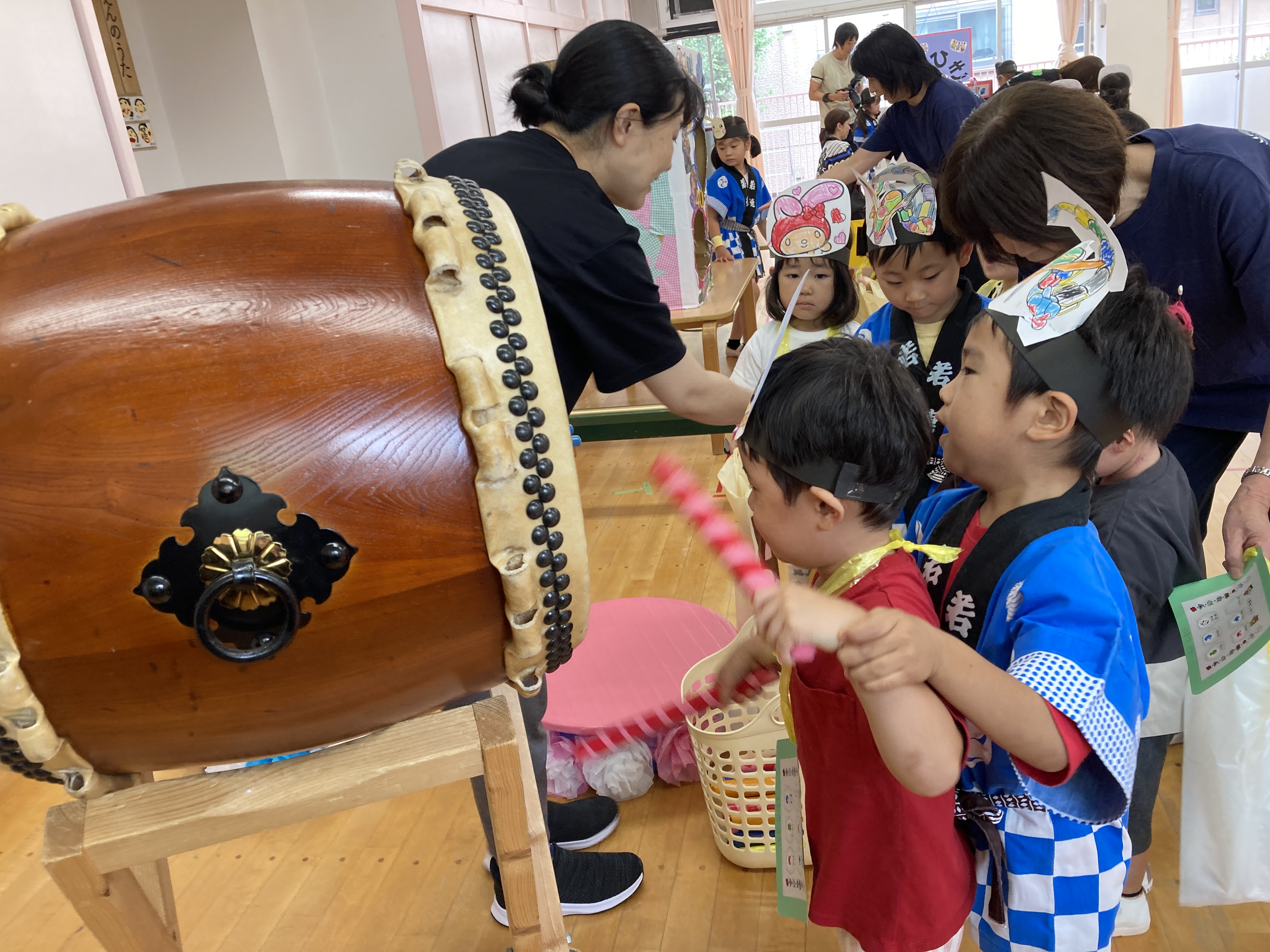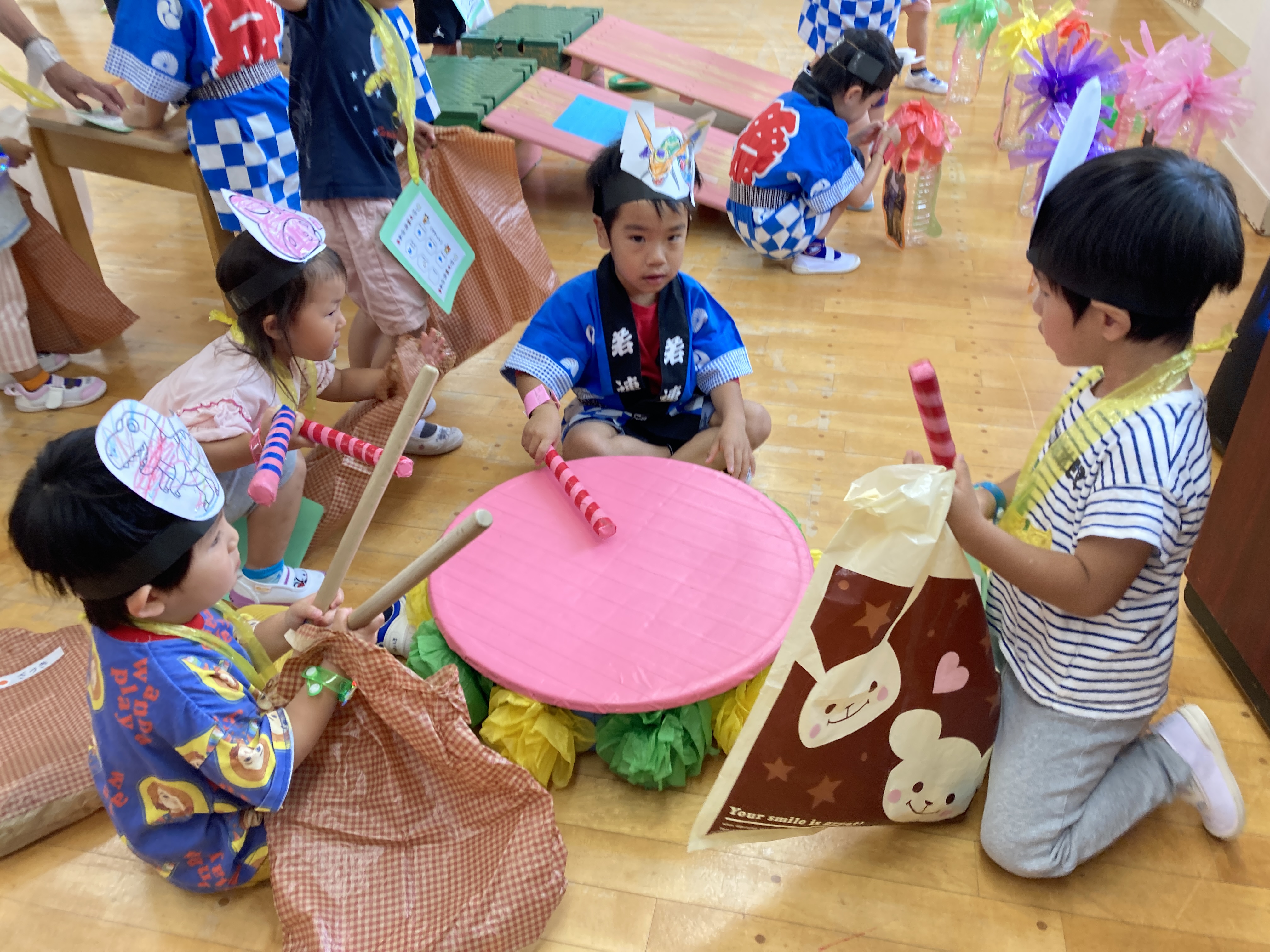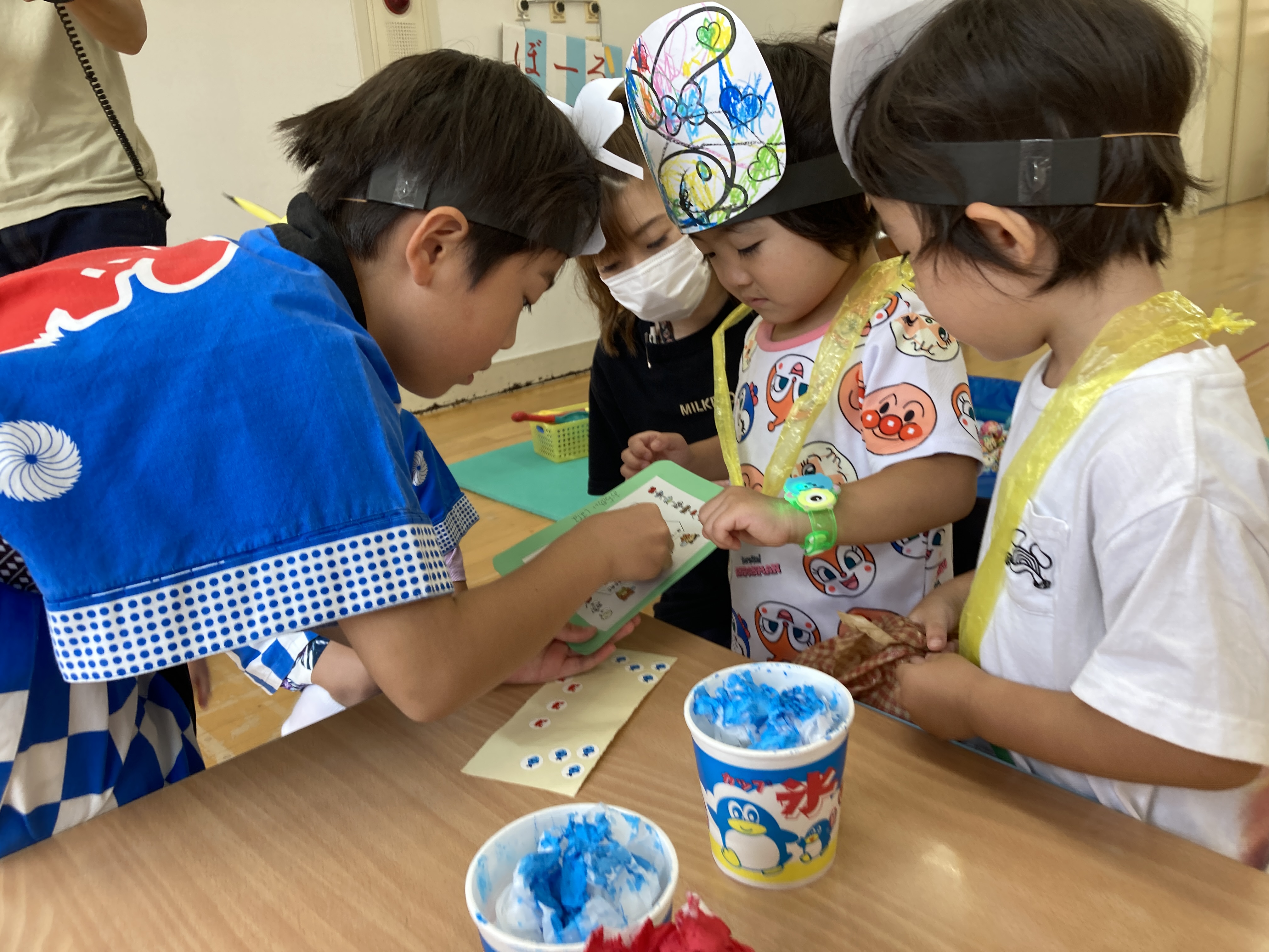 5歳児たいよう組がボーリング、ひもひき、ボールすくい、おみやげ屋さん(アイス、金魚、かき氷)、太鼓、まとあてなどの各コーナーでお店屋さんになりお客さんをおもてなしを