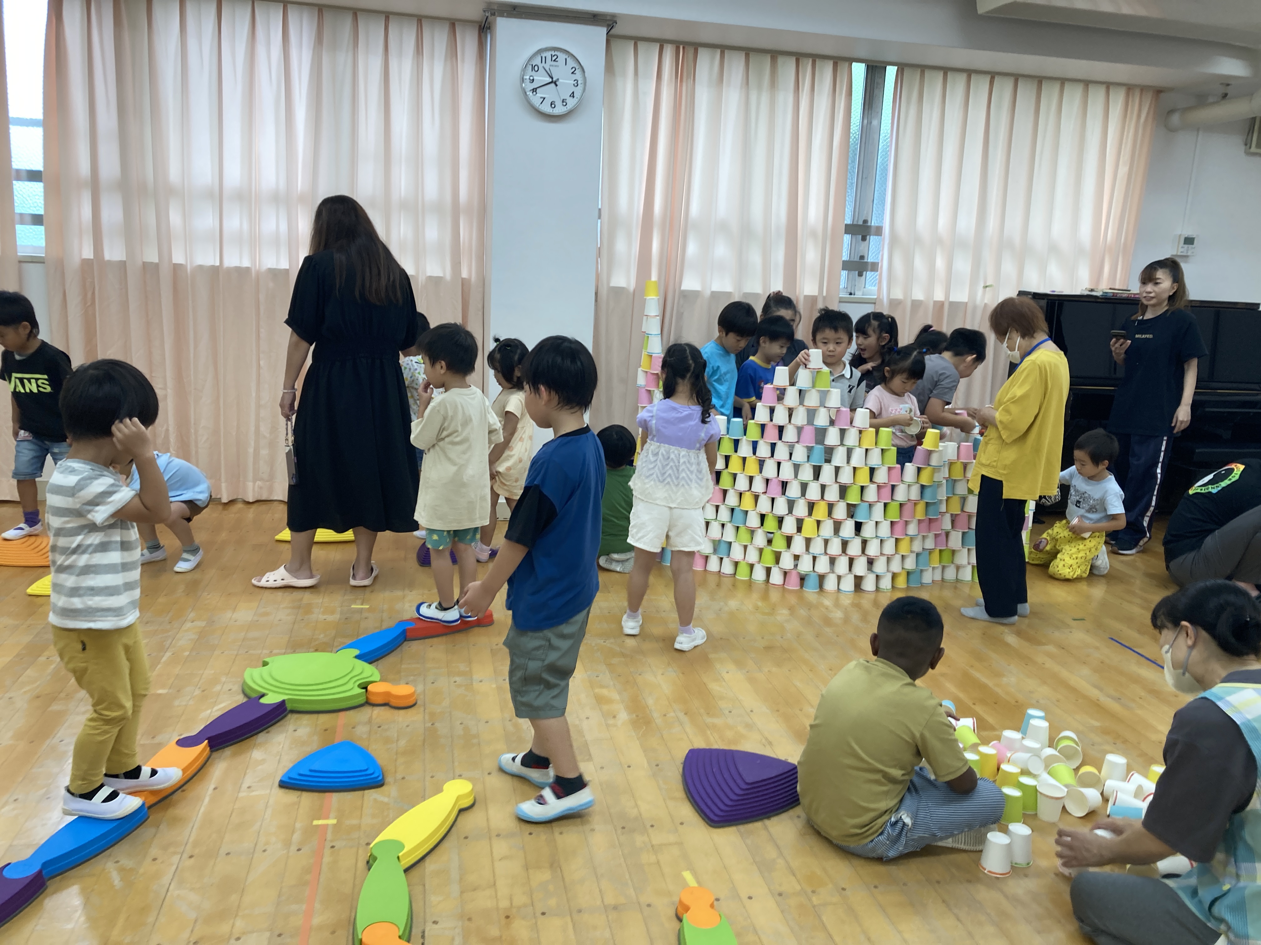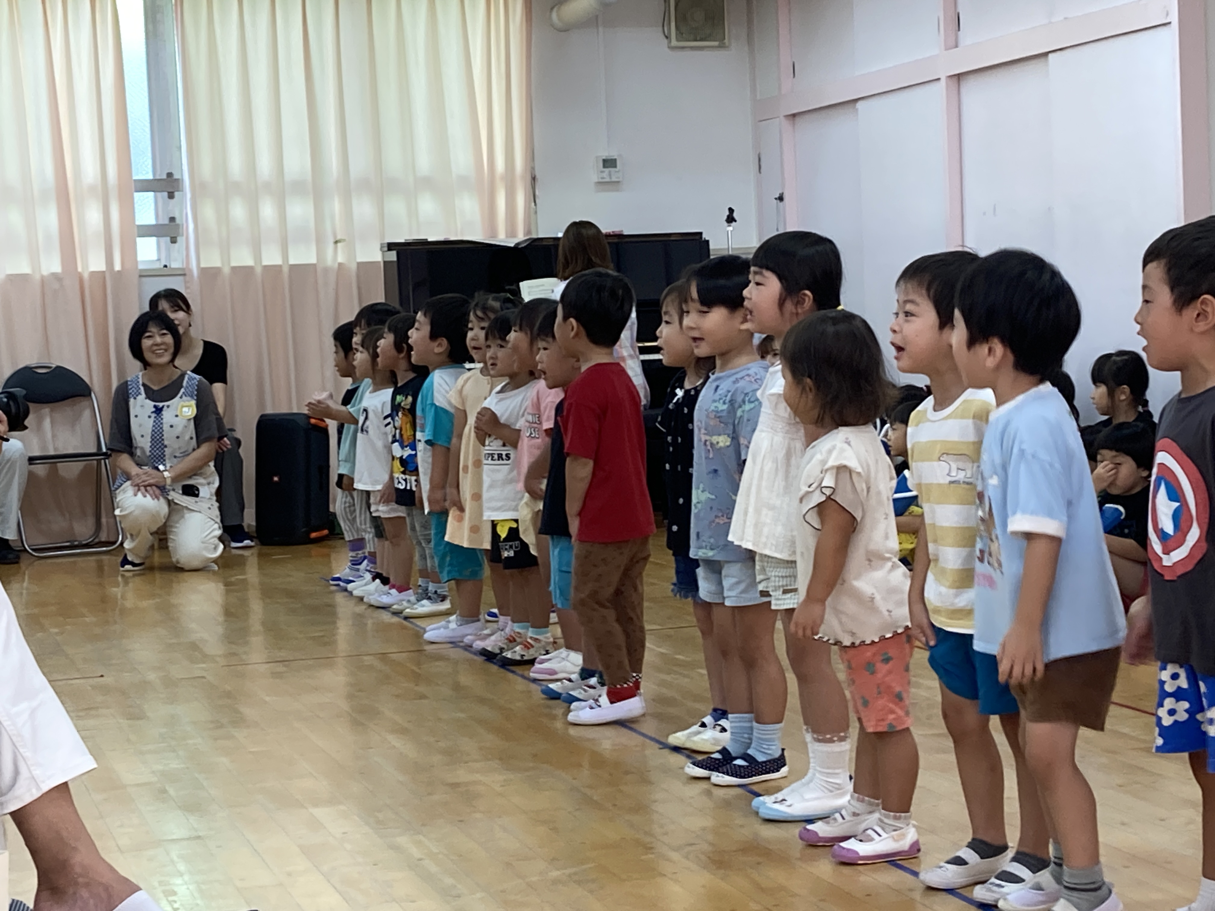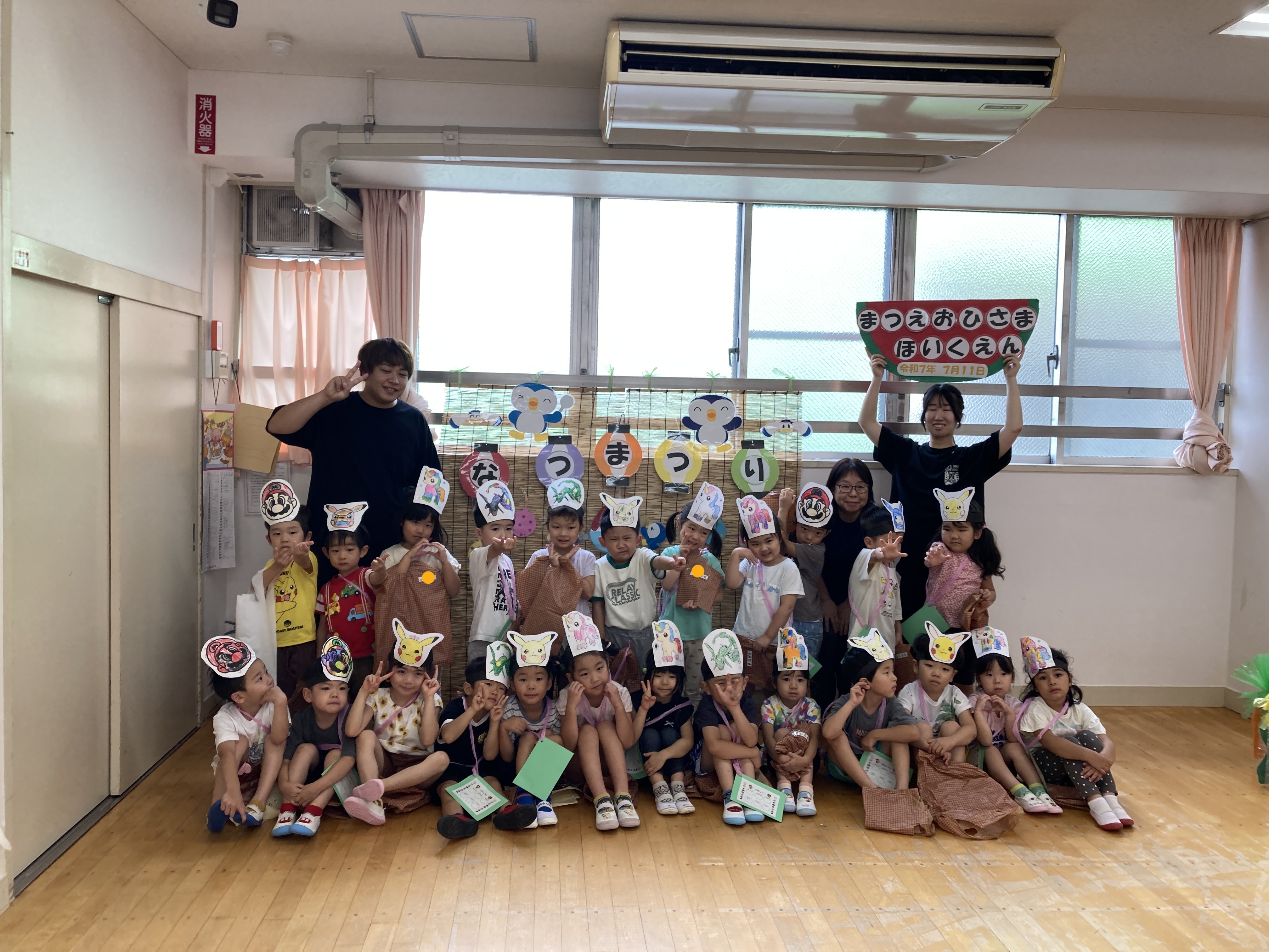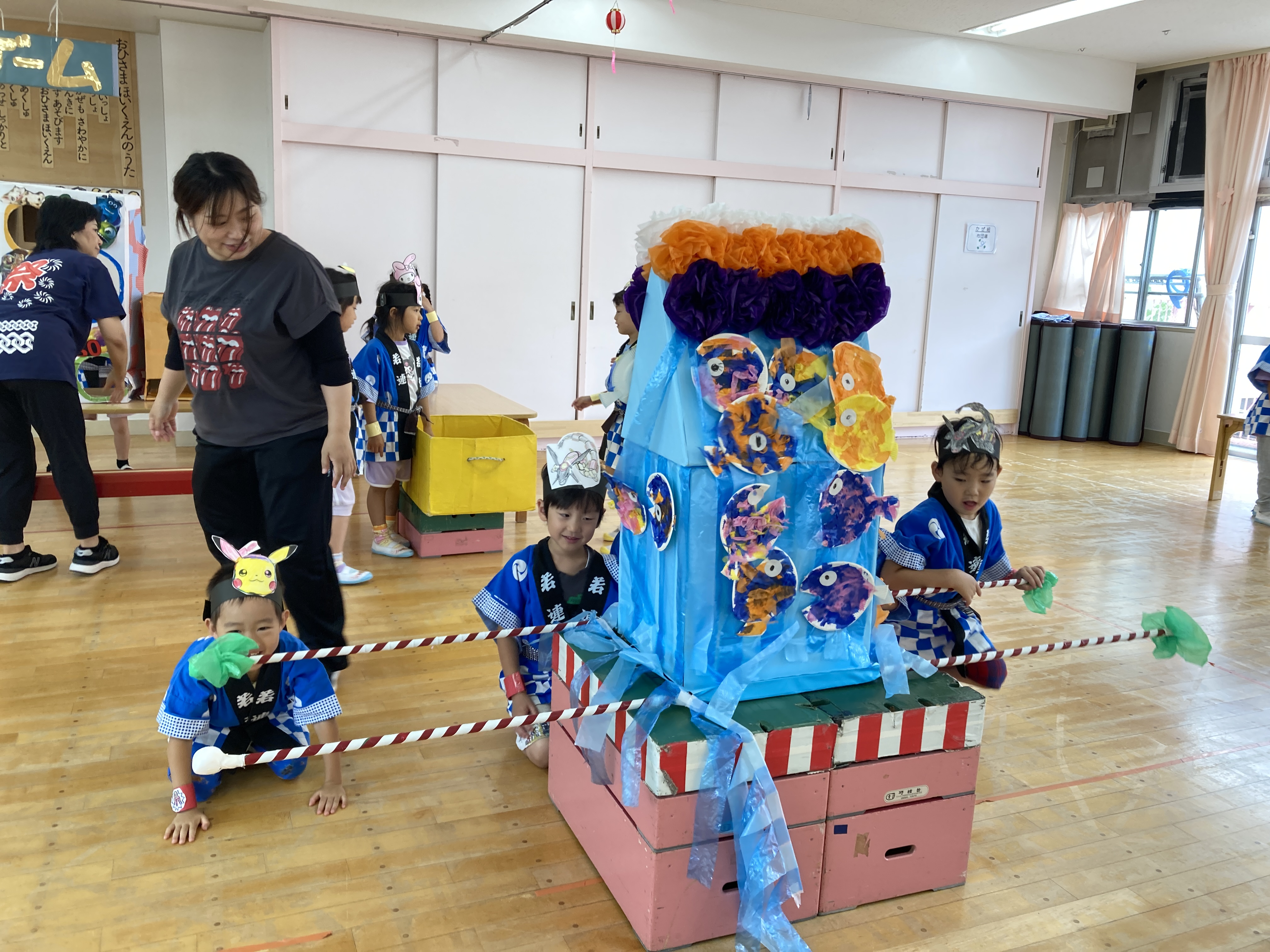 5歳児たいよう組がボーリング、ひもひき、ボールすくい、おみやげ屋さん(アイス、金魚、かき氷)、太鼓、まとあてなどの各コーナーでお店屋さんになりお客さんをおもてなしを