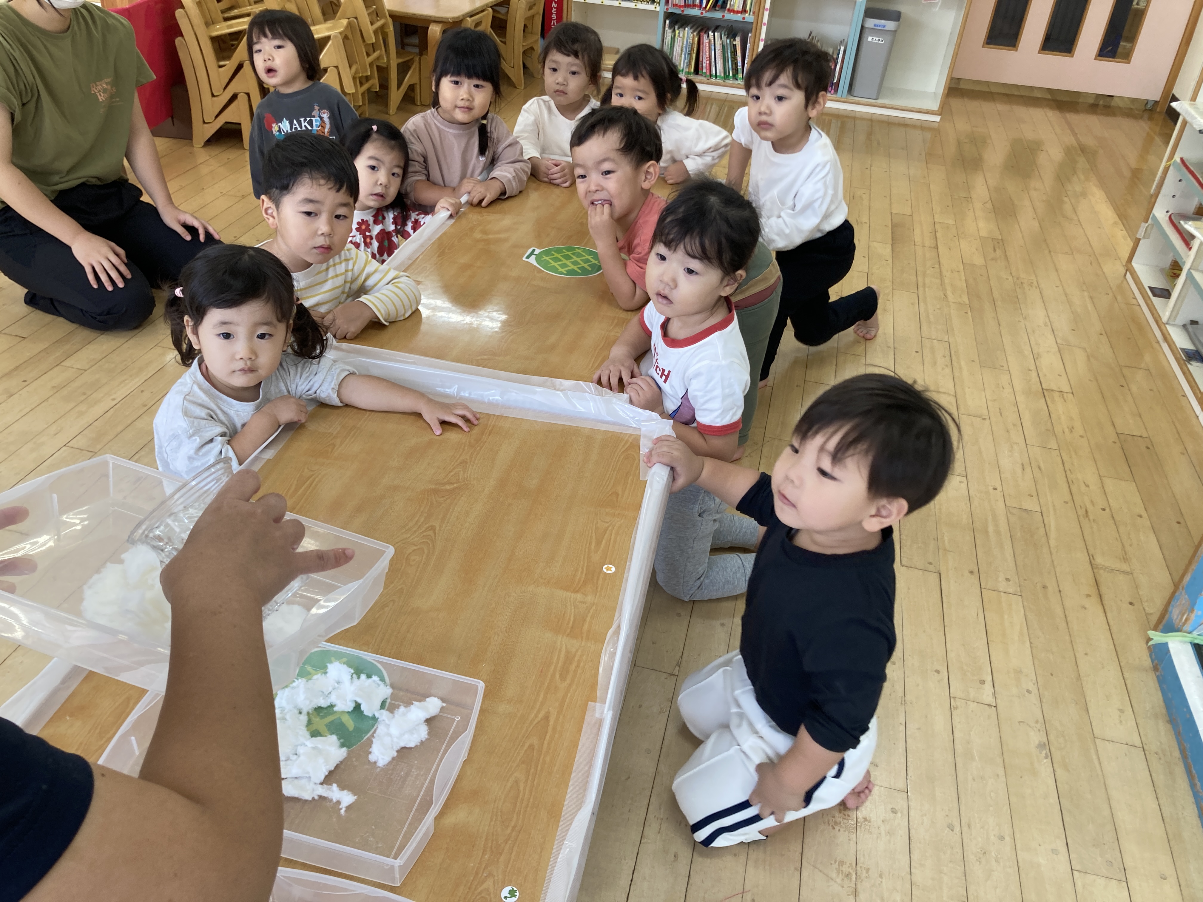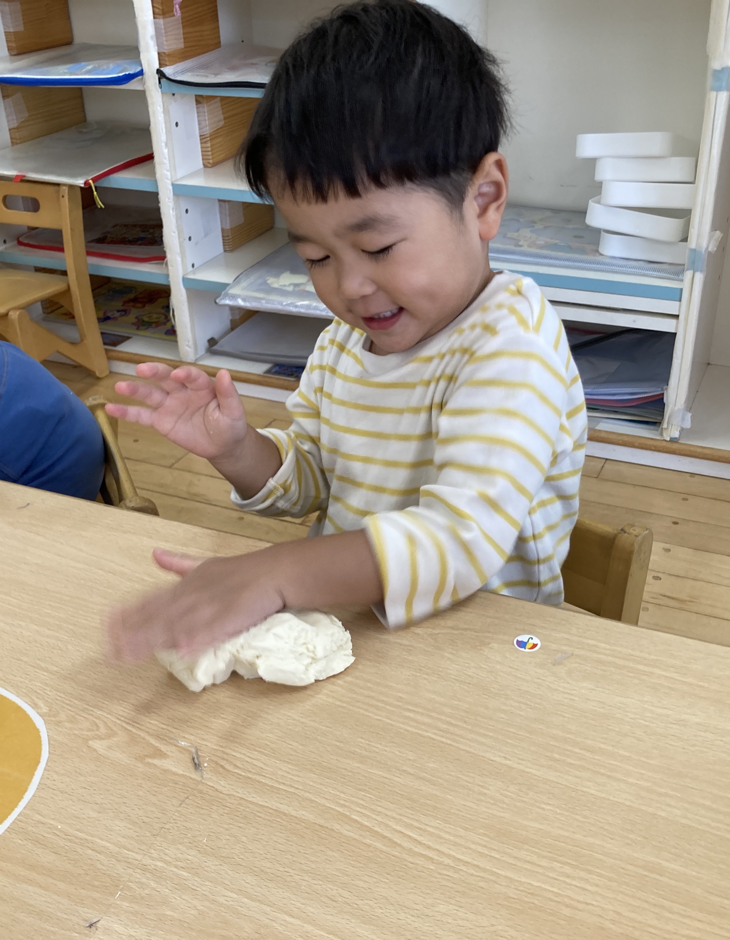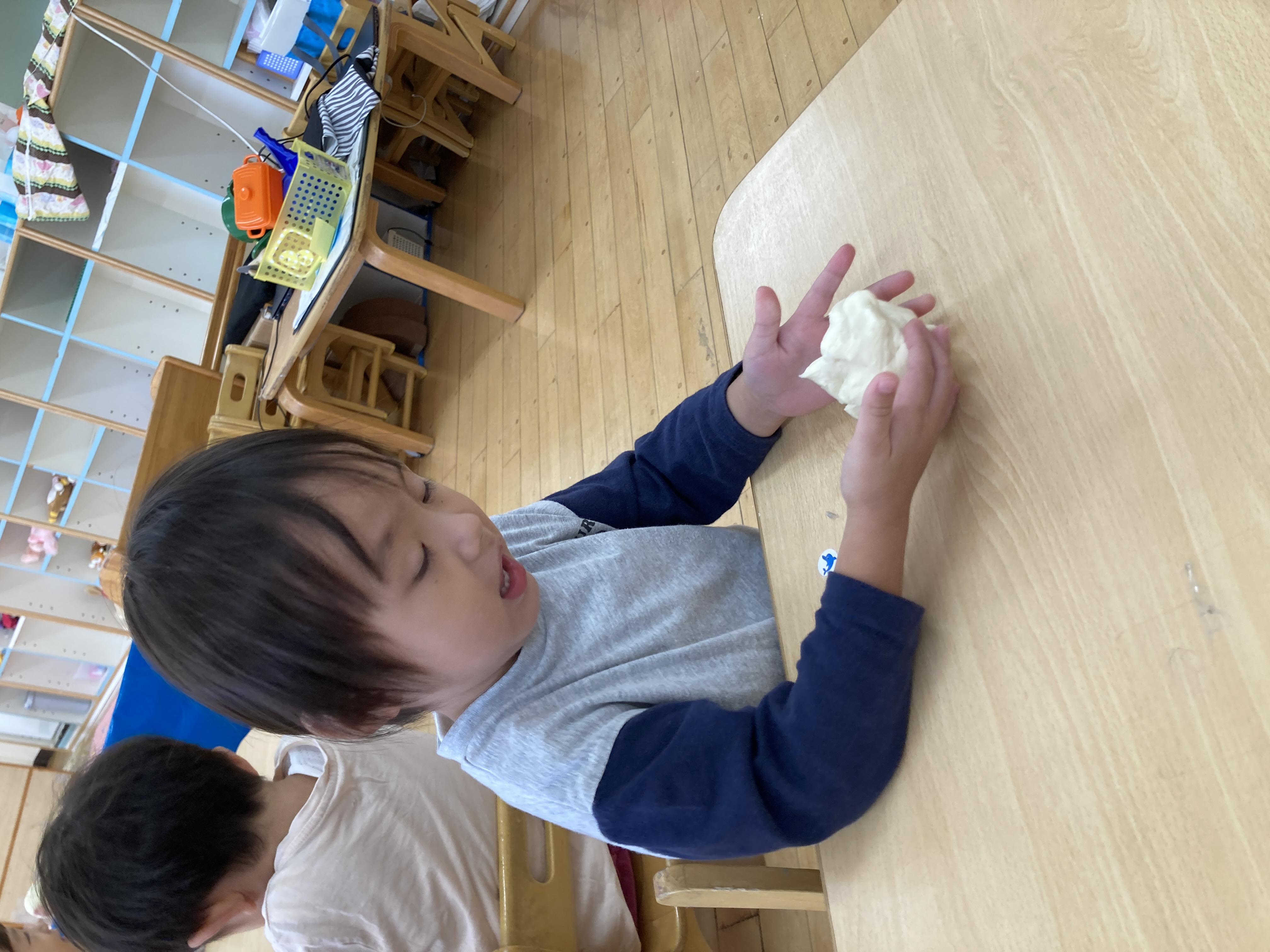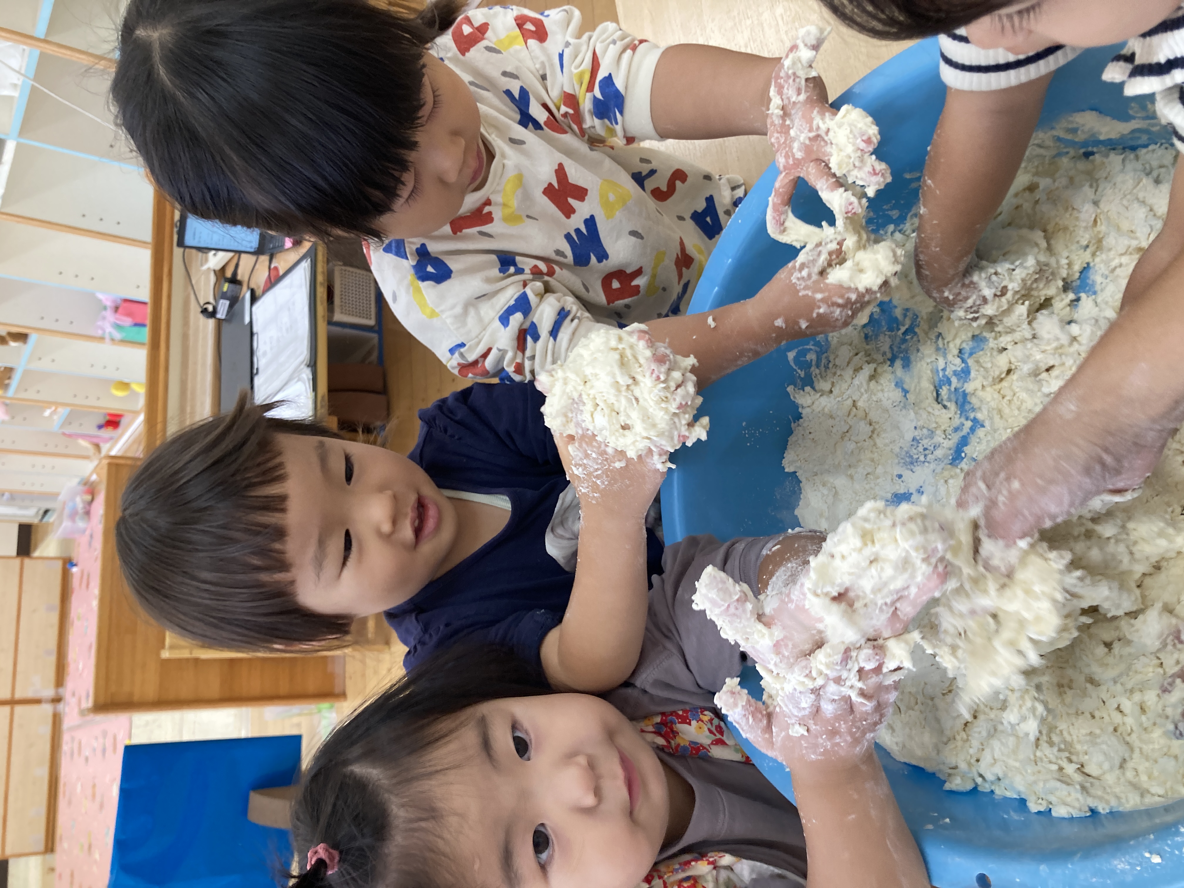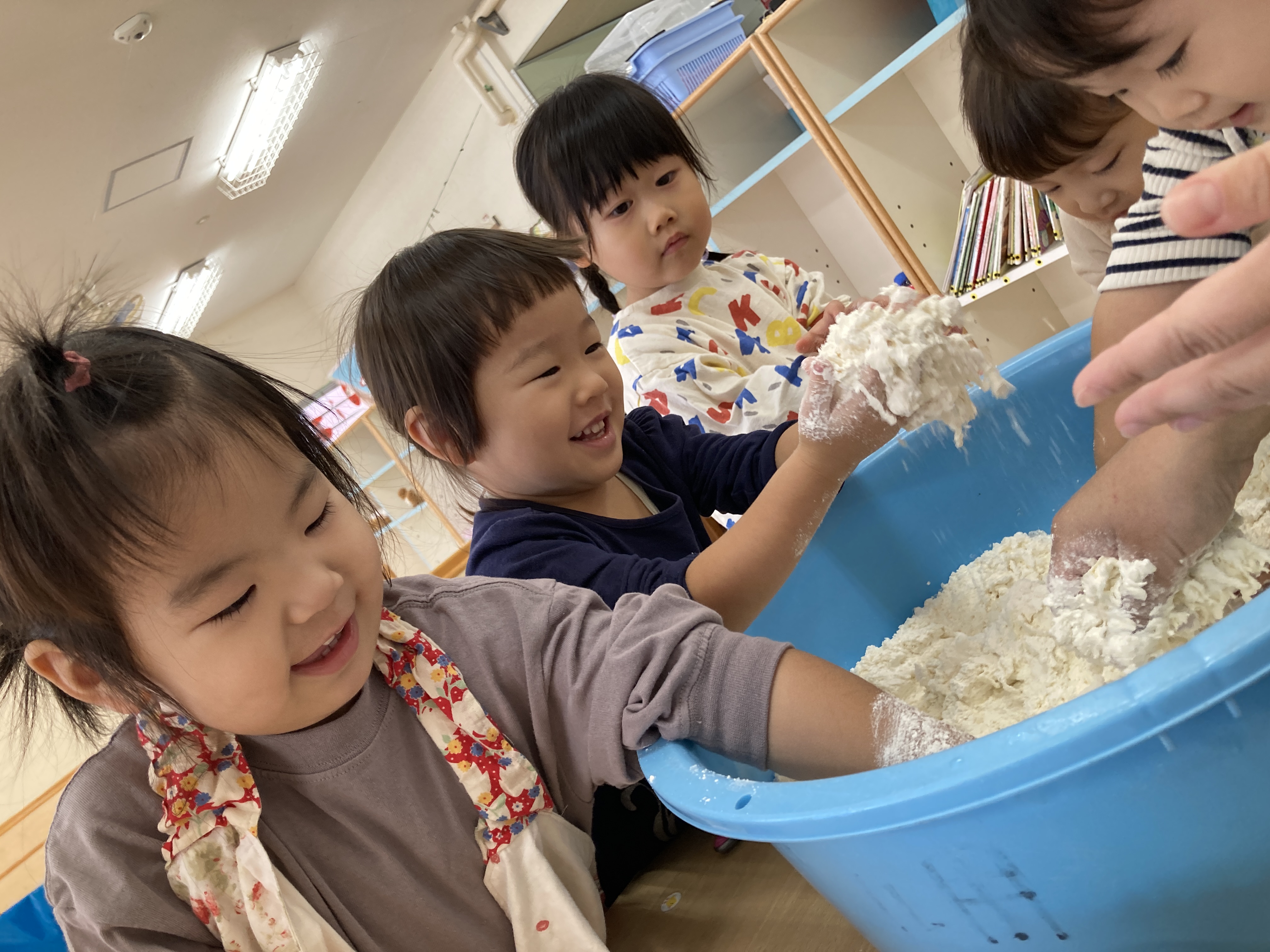 今日は、小麦粉粘土作り~粉はサラサラ気持ち~ね~。