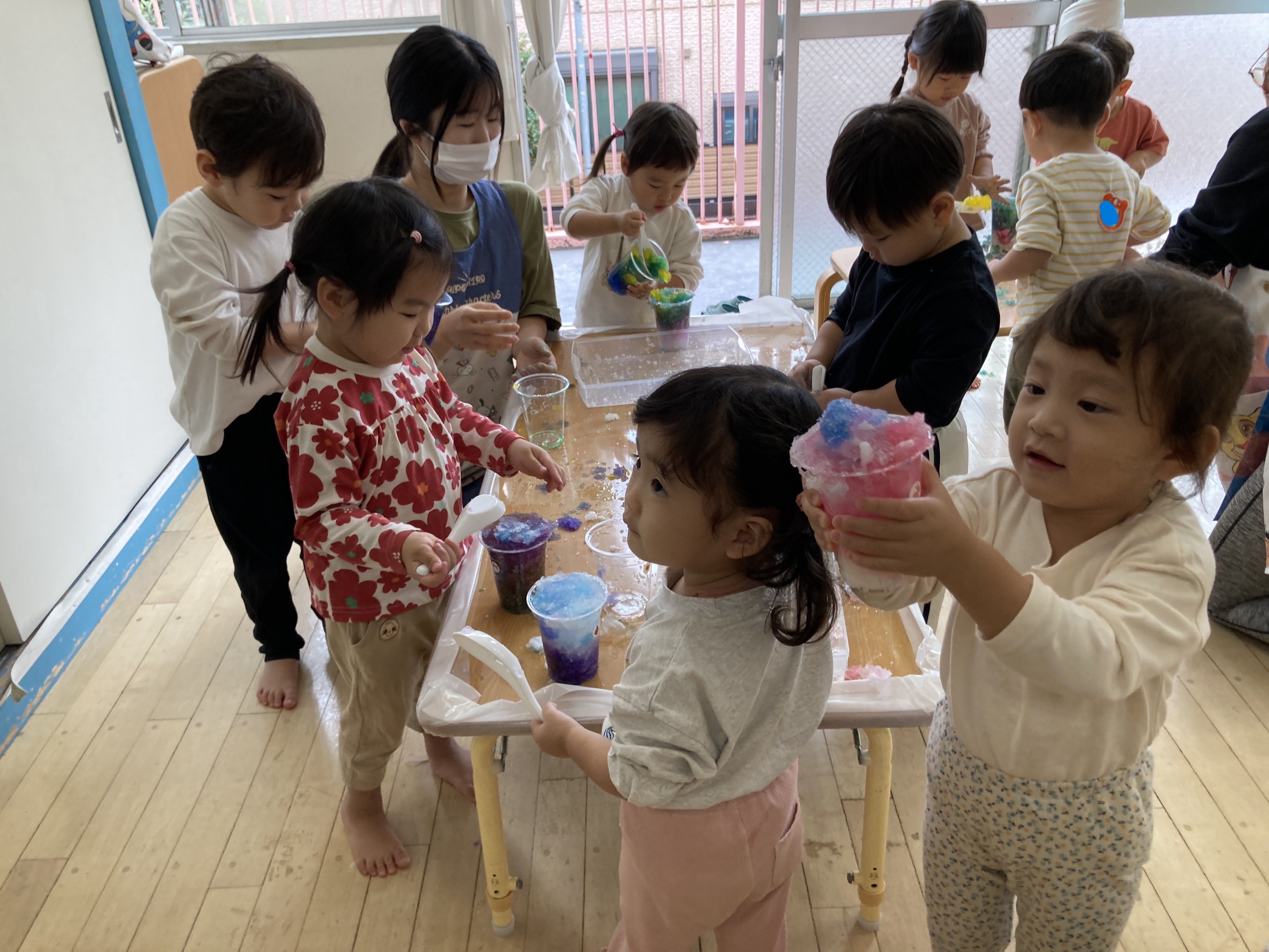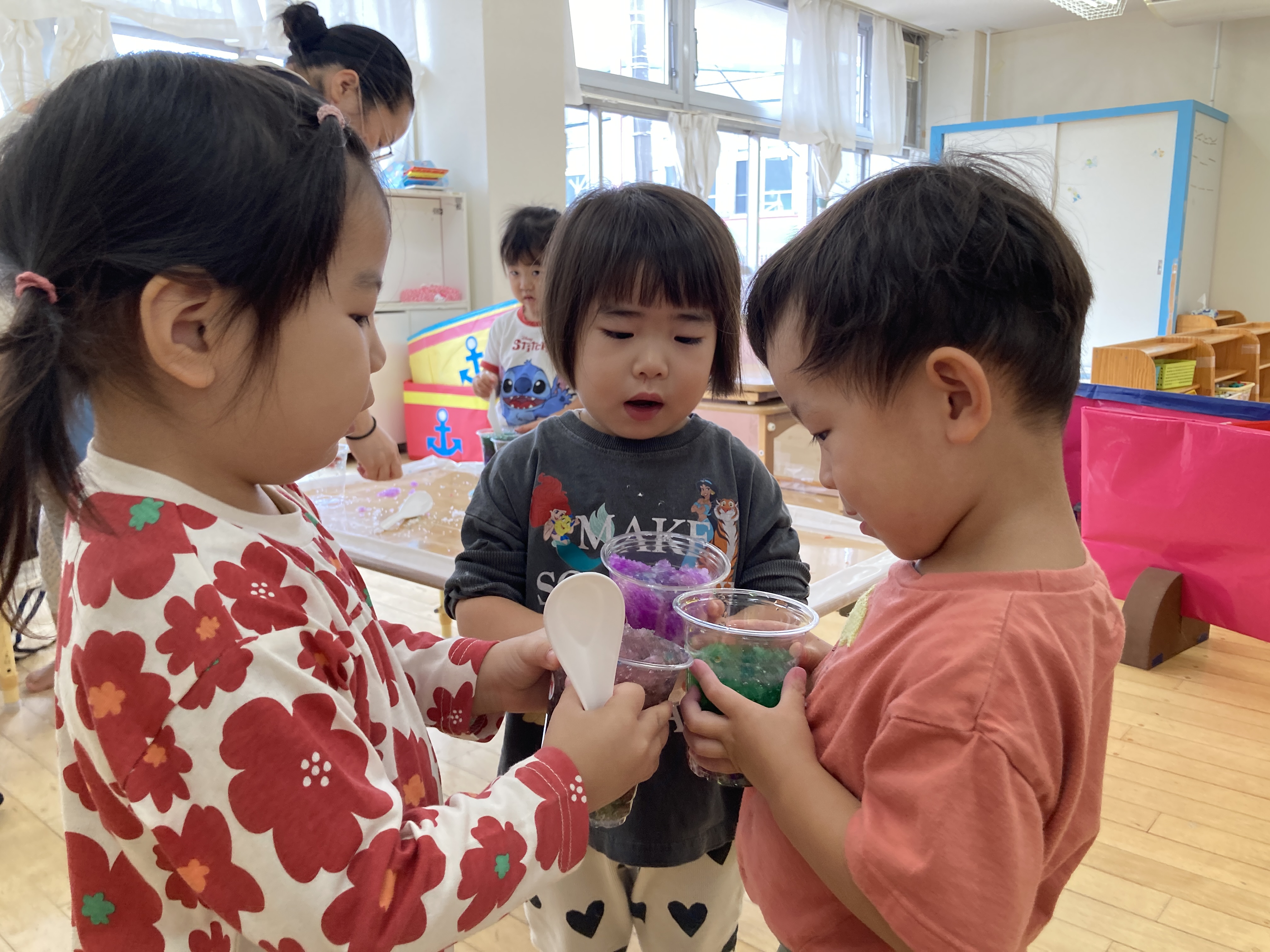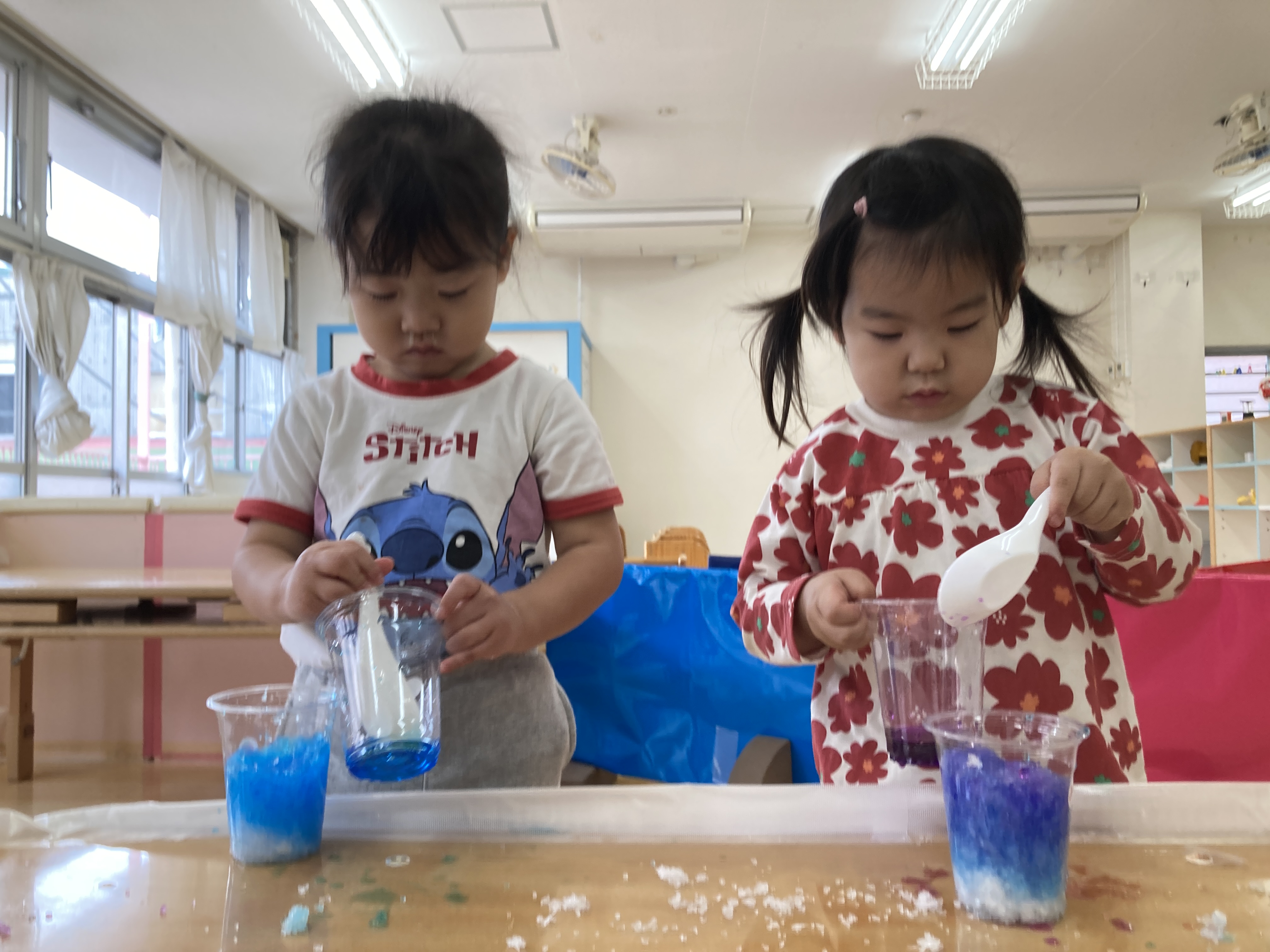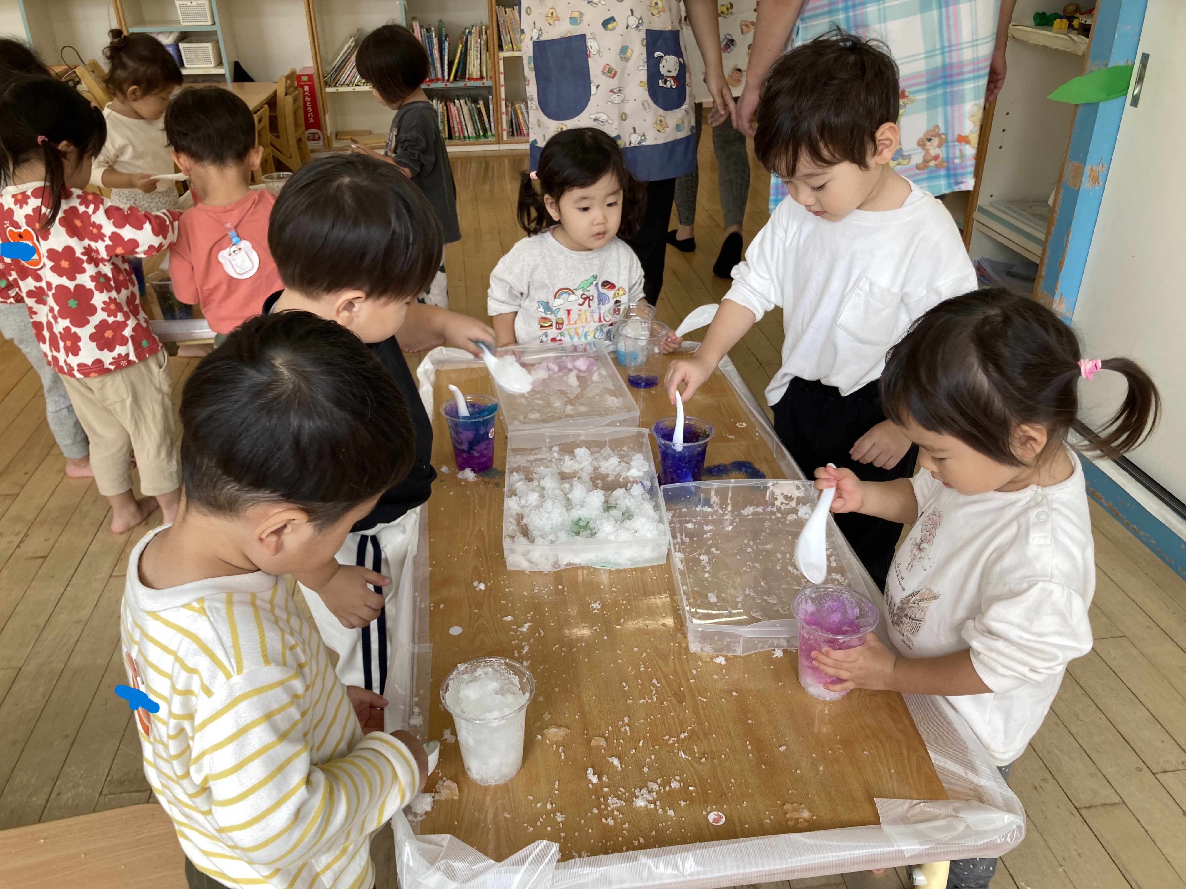 吸収ポリマーに水を入れて、かき氷を作ったよ~。