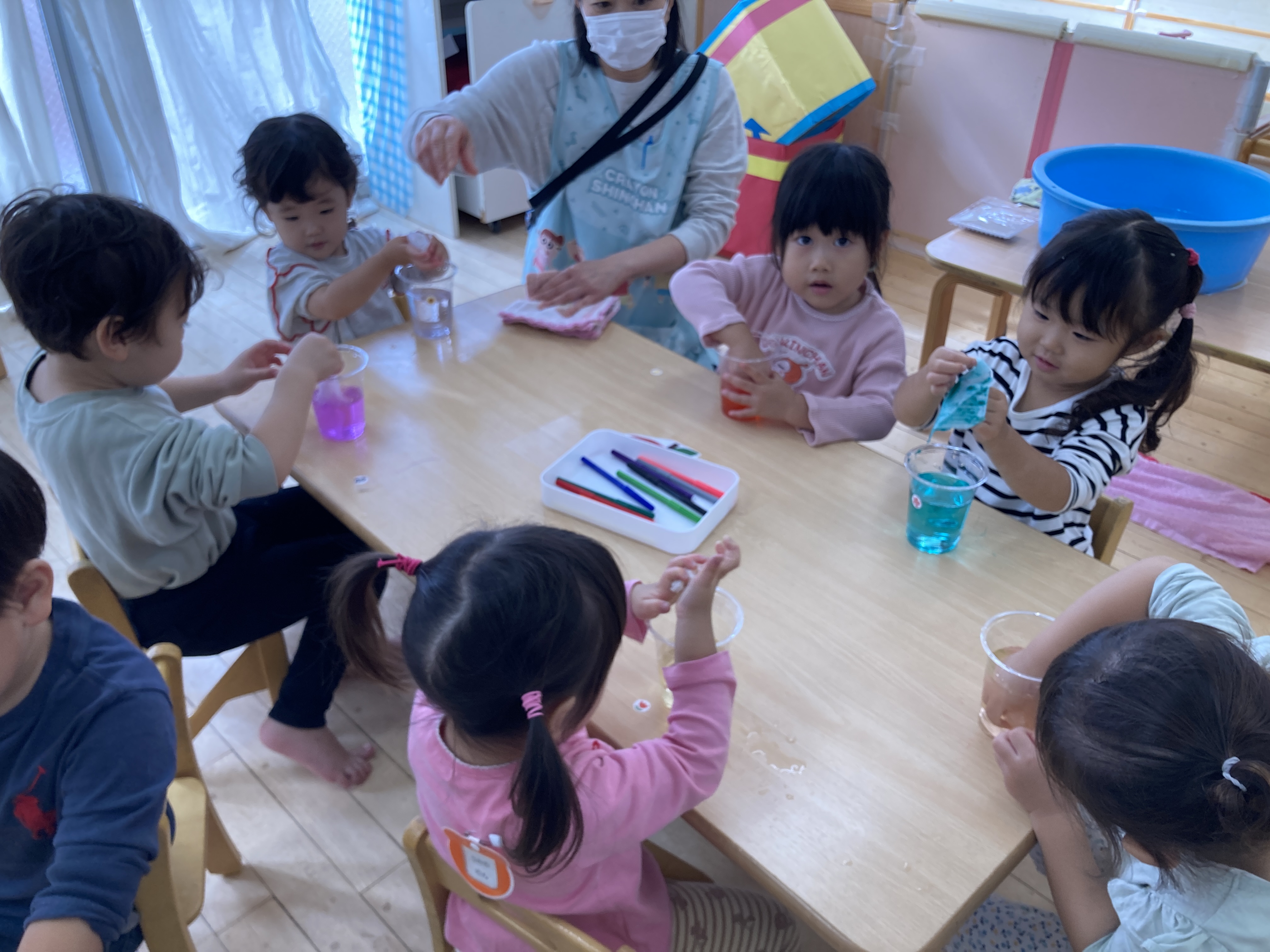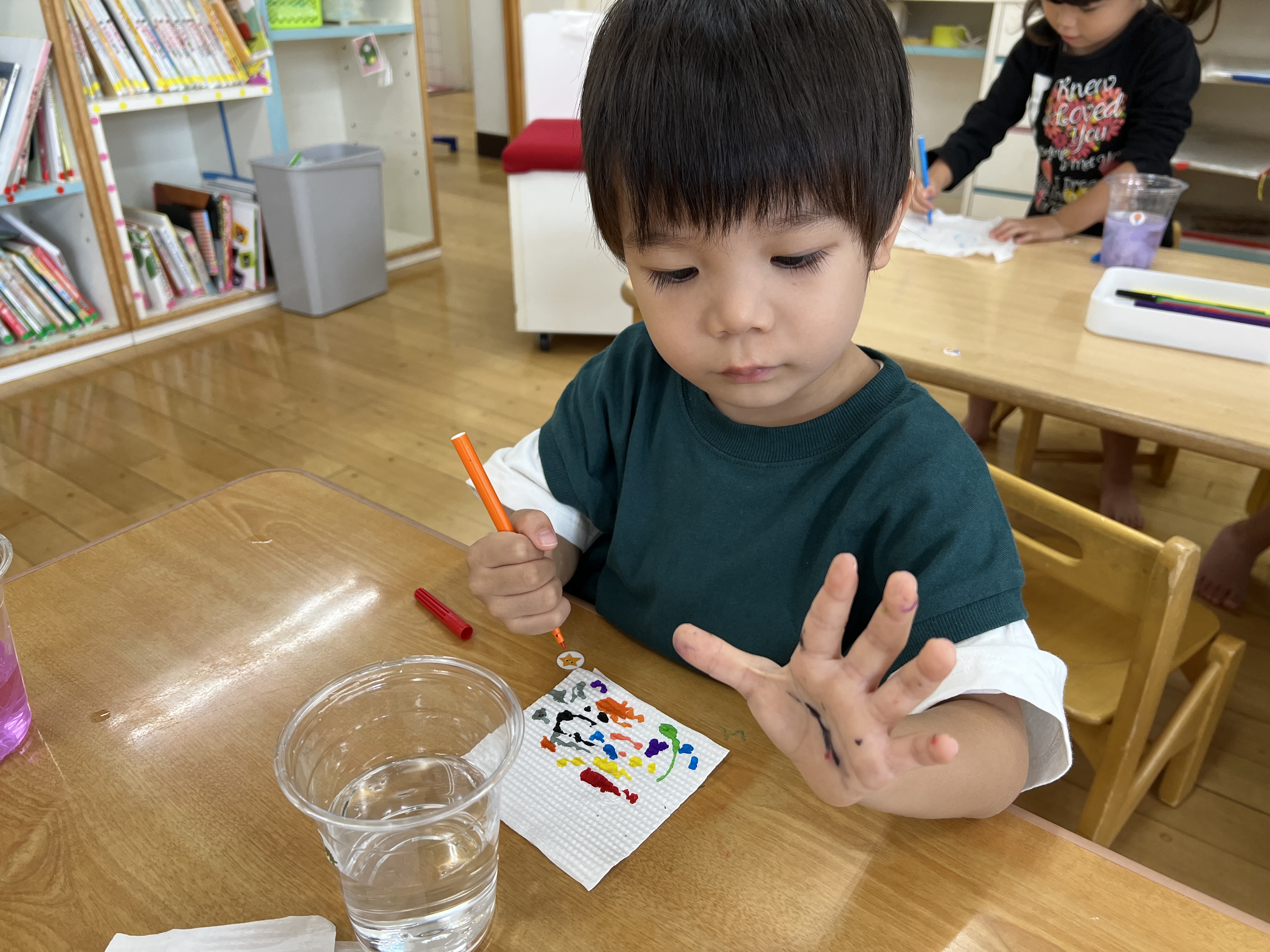 マーカーの色が、お水に溶けだして、綺麗な色に変身しました。
