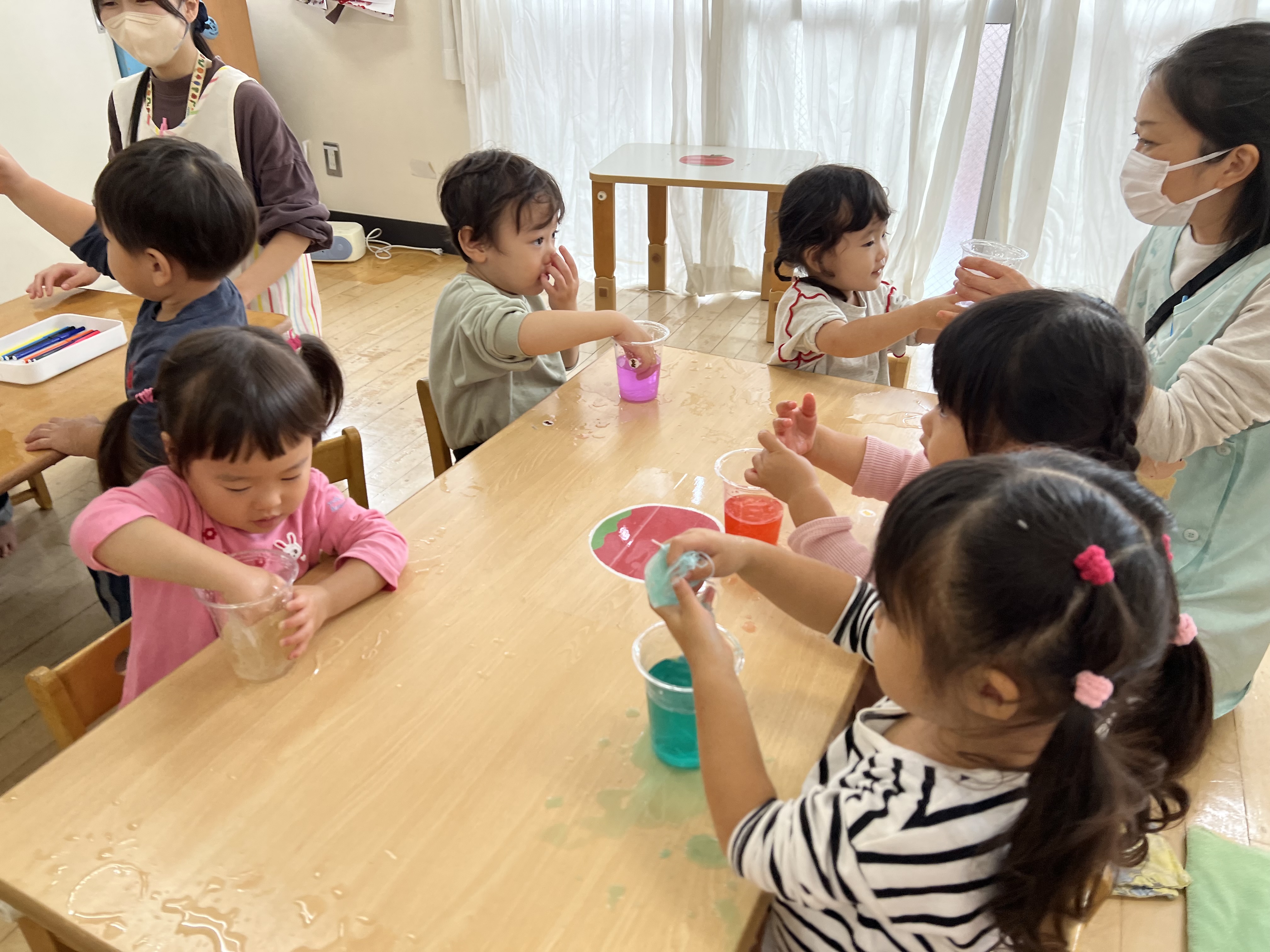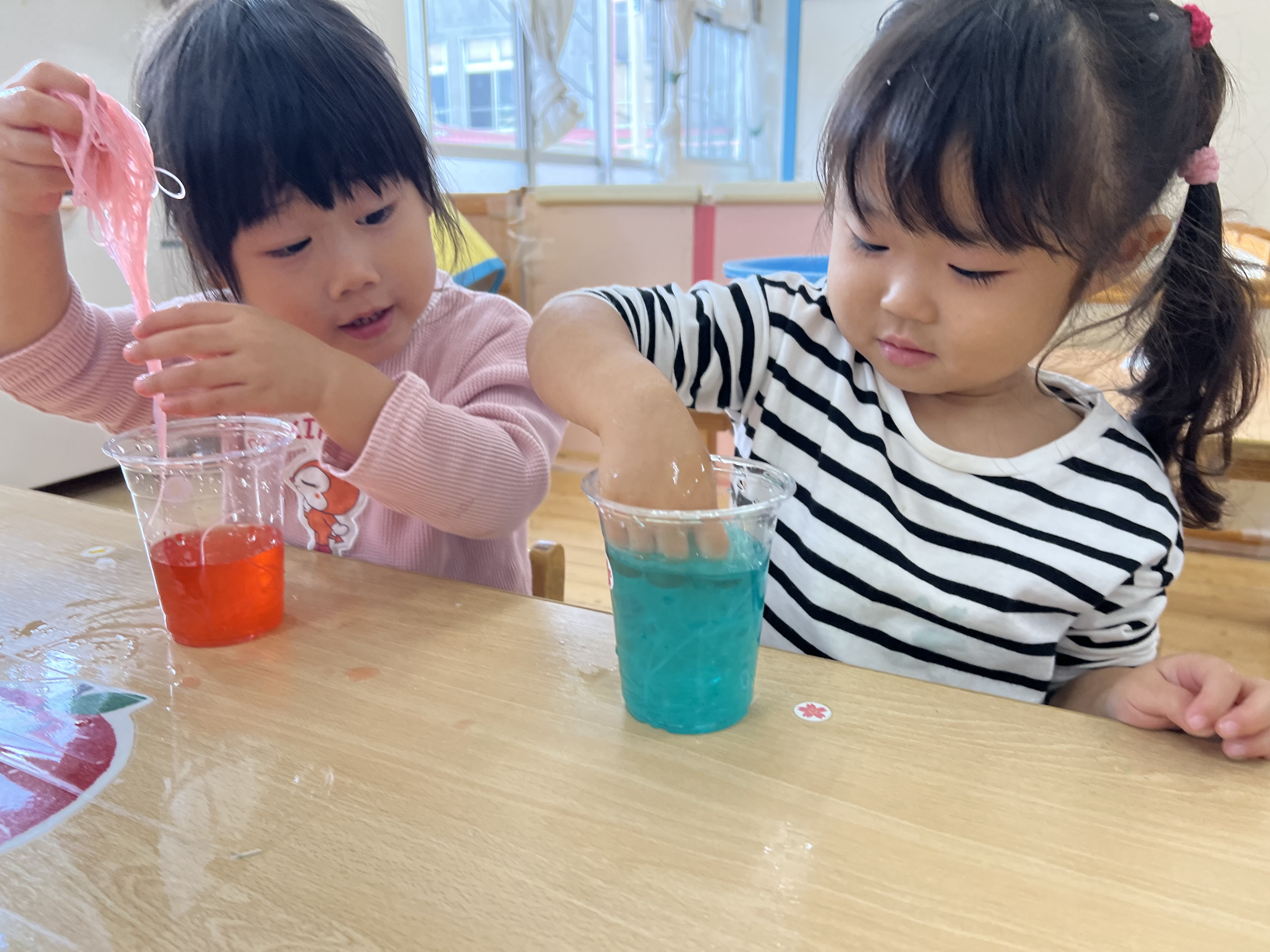 お水を入れたらベタベタになったよ~。わ~手から取れない~。