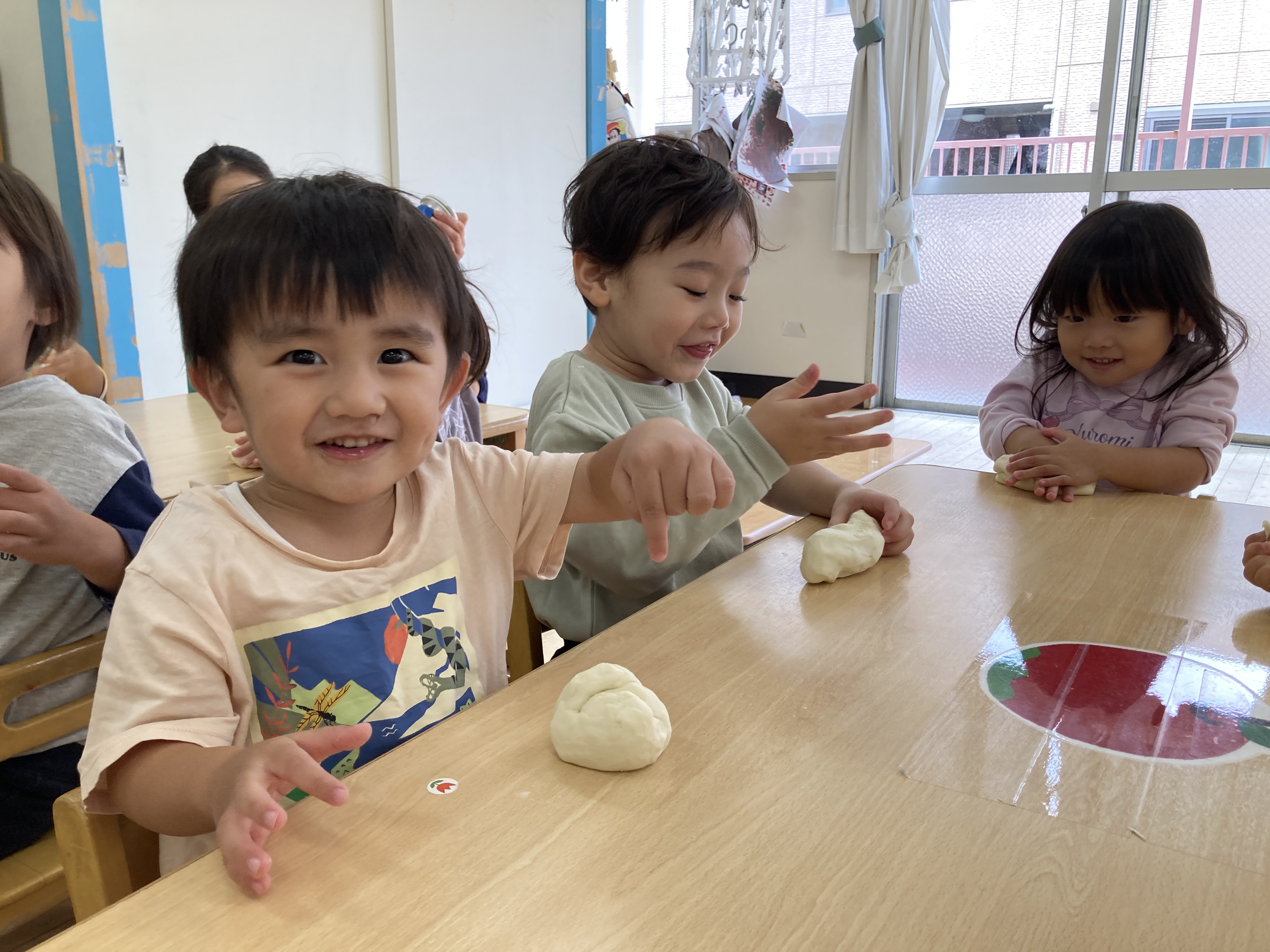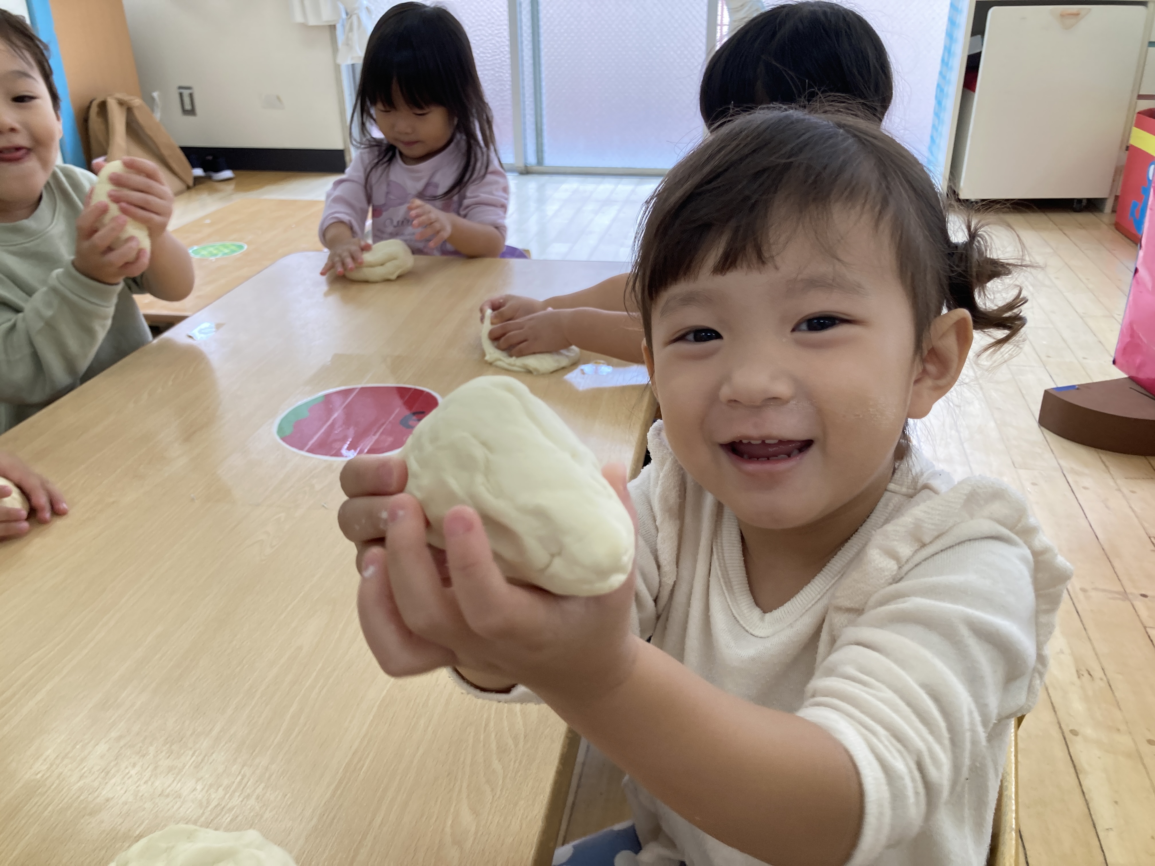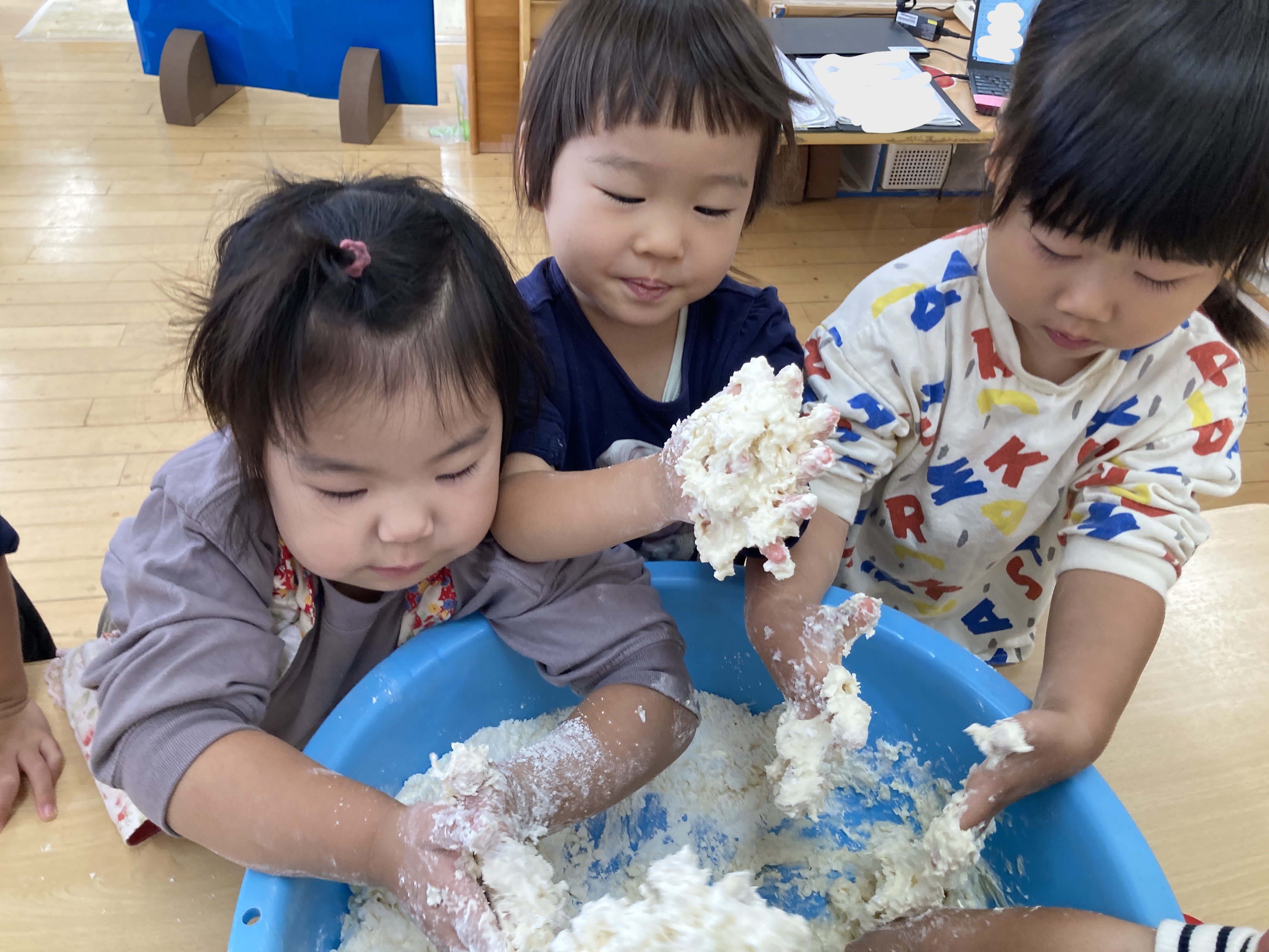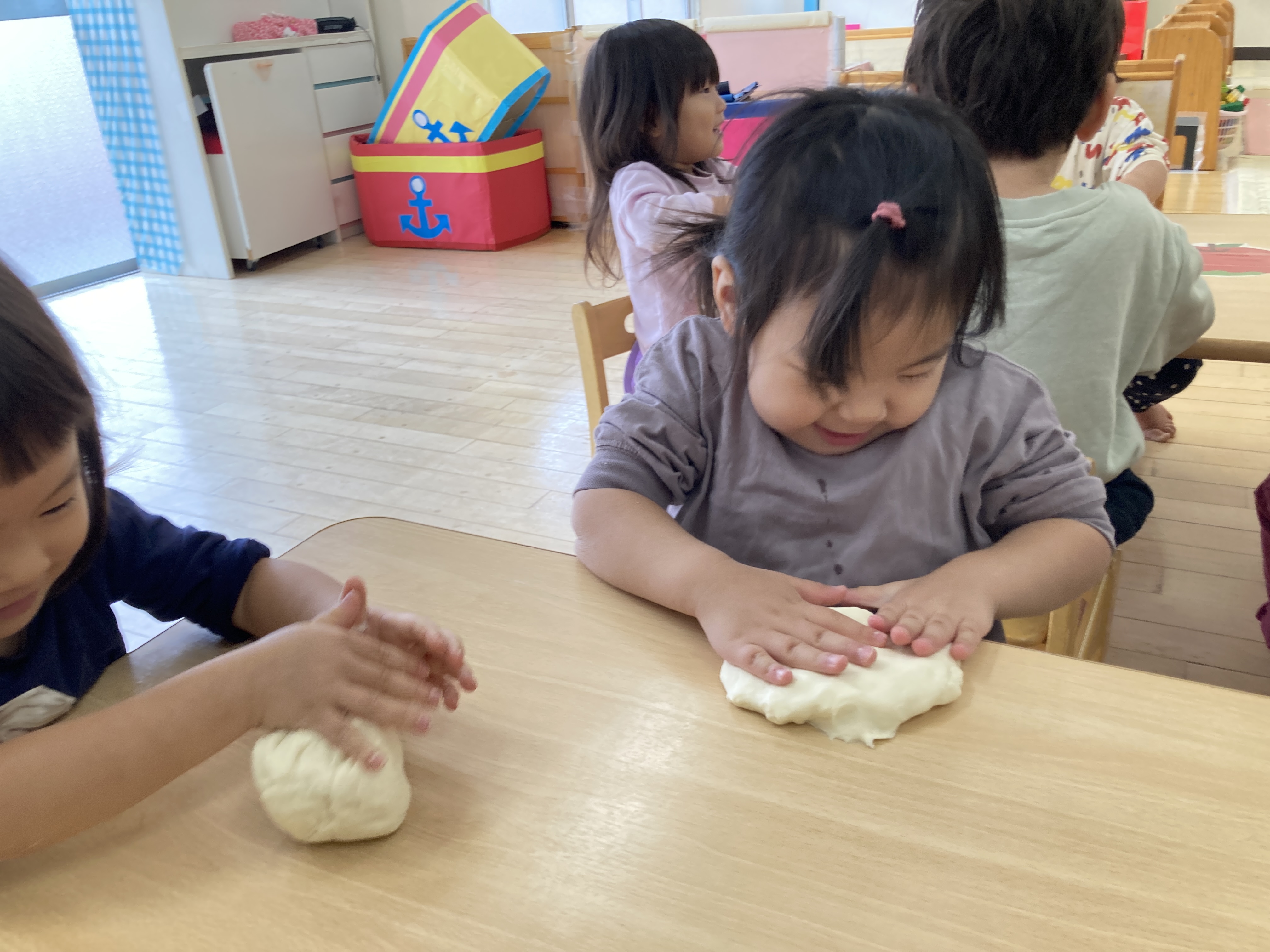 2歳児クラスも、小麦粉粘土遊びを楽しみました!