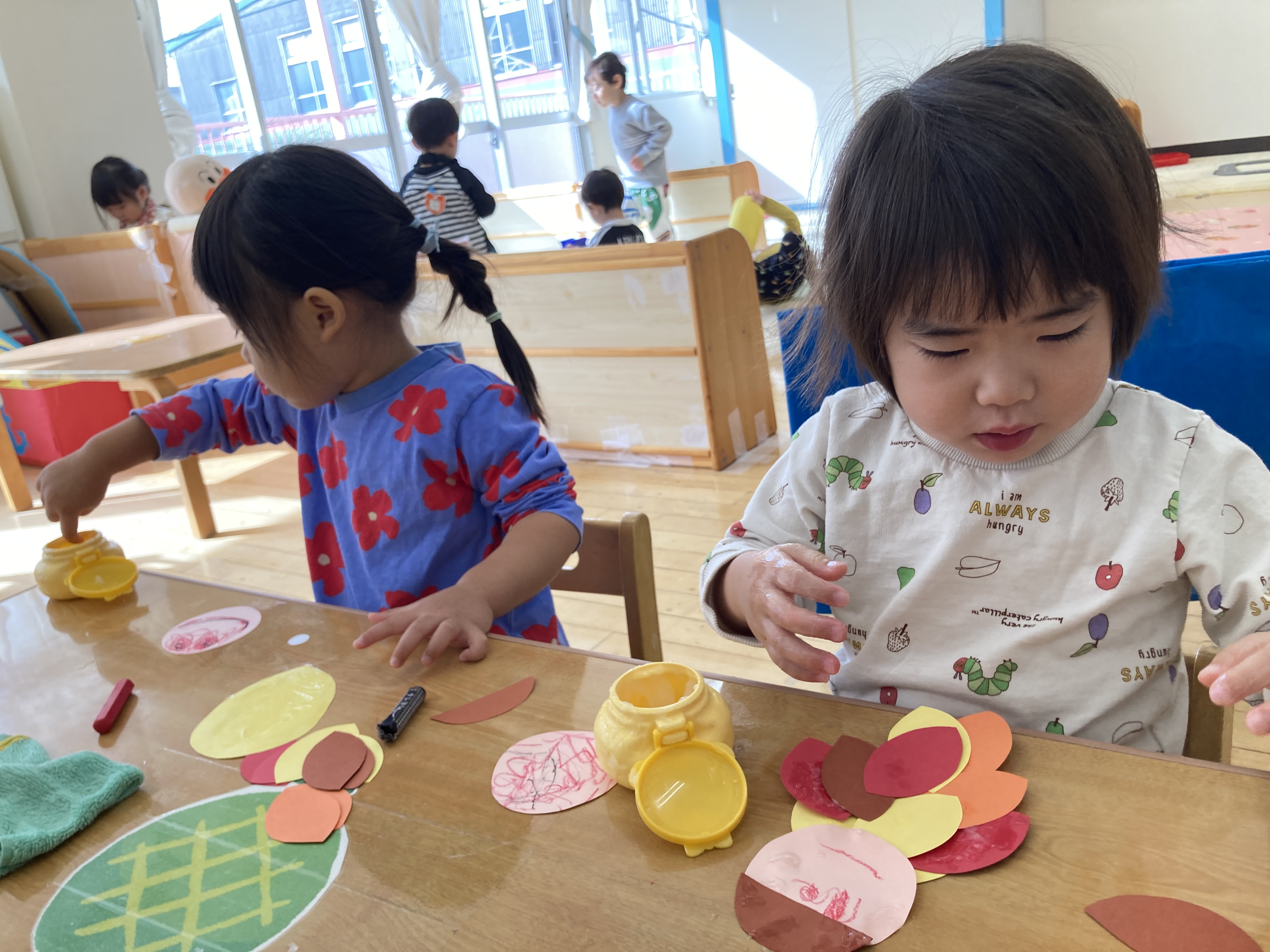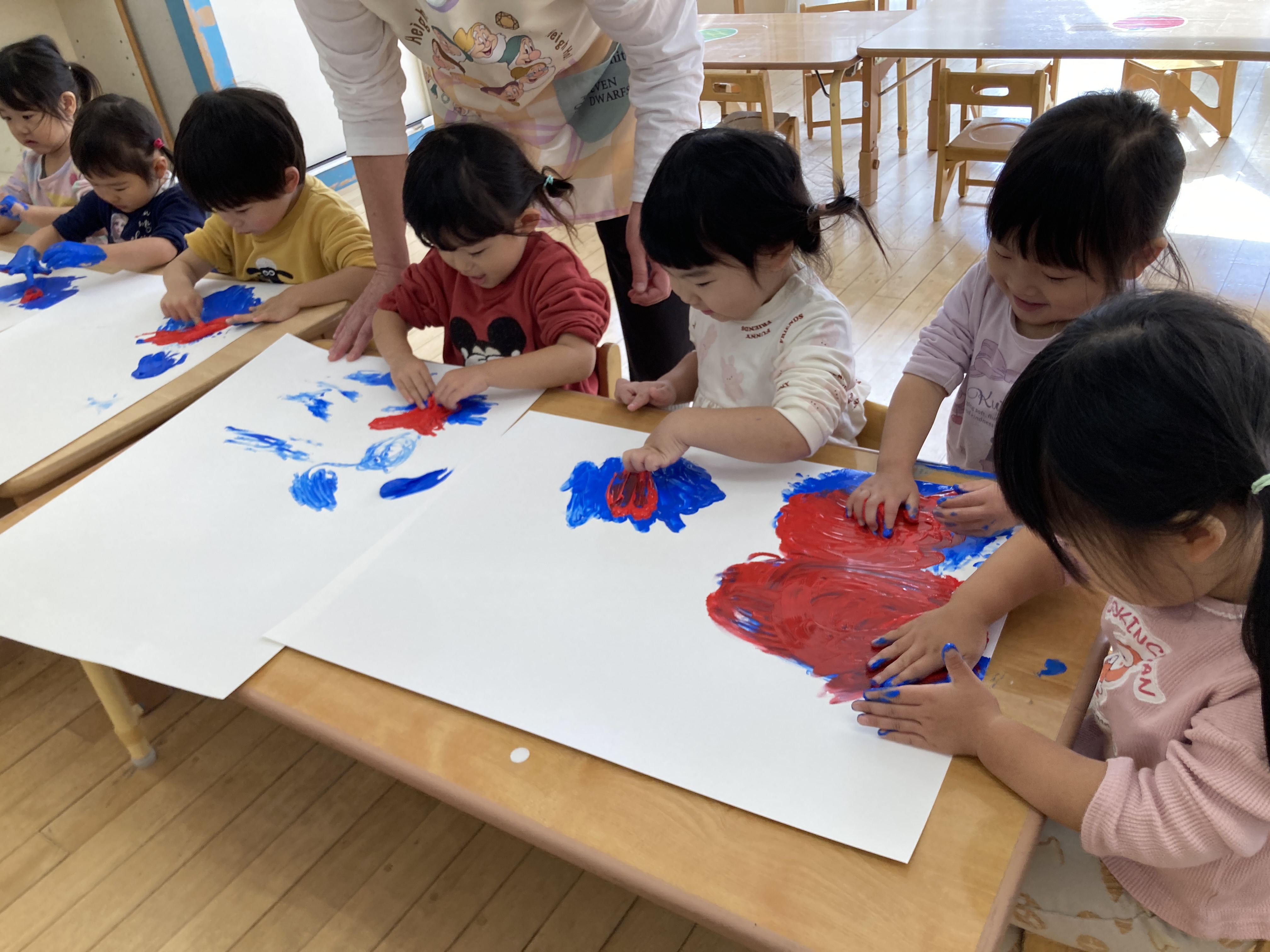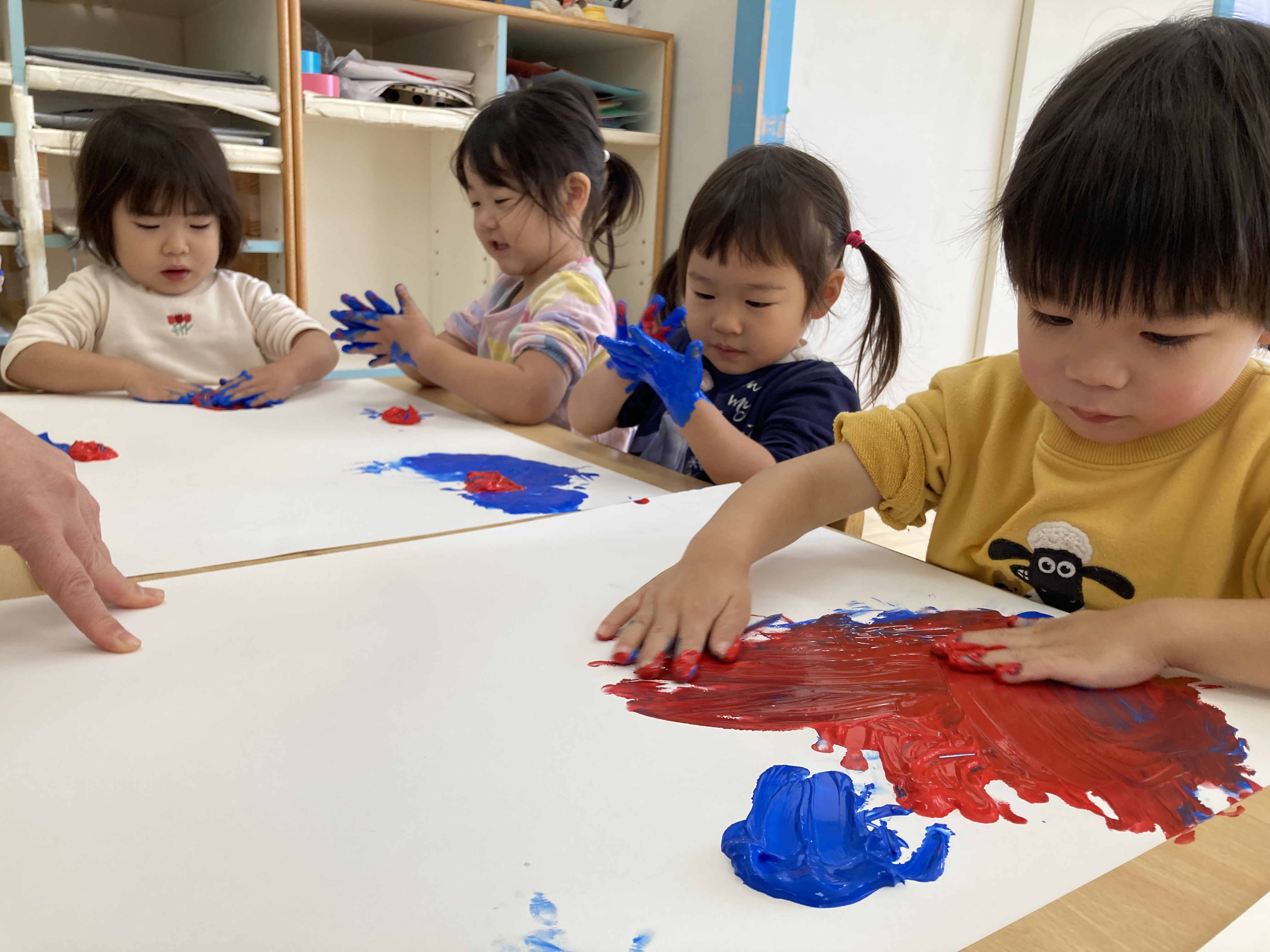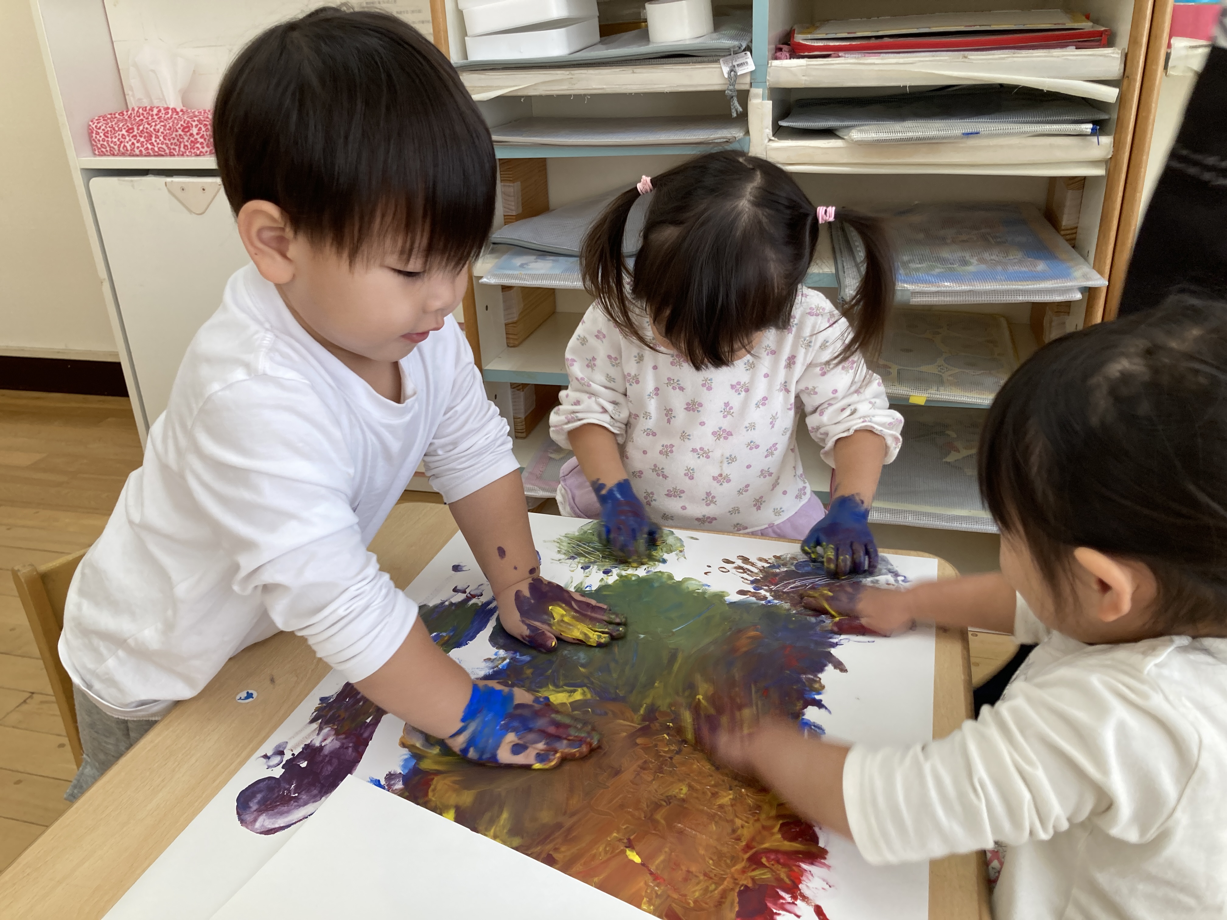 子ども達の大好きなゆびえのぐもたくさんしました。とても豪快にぬりぬりしています。