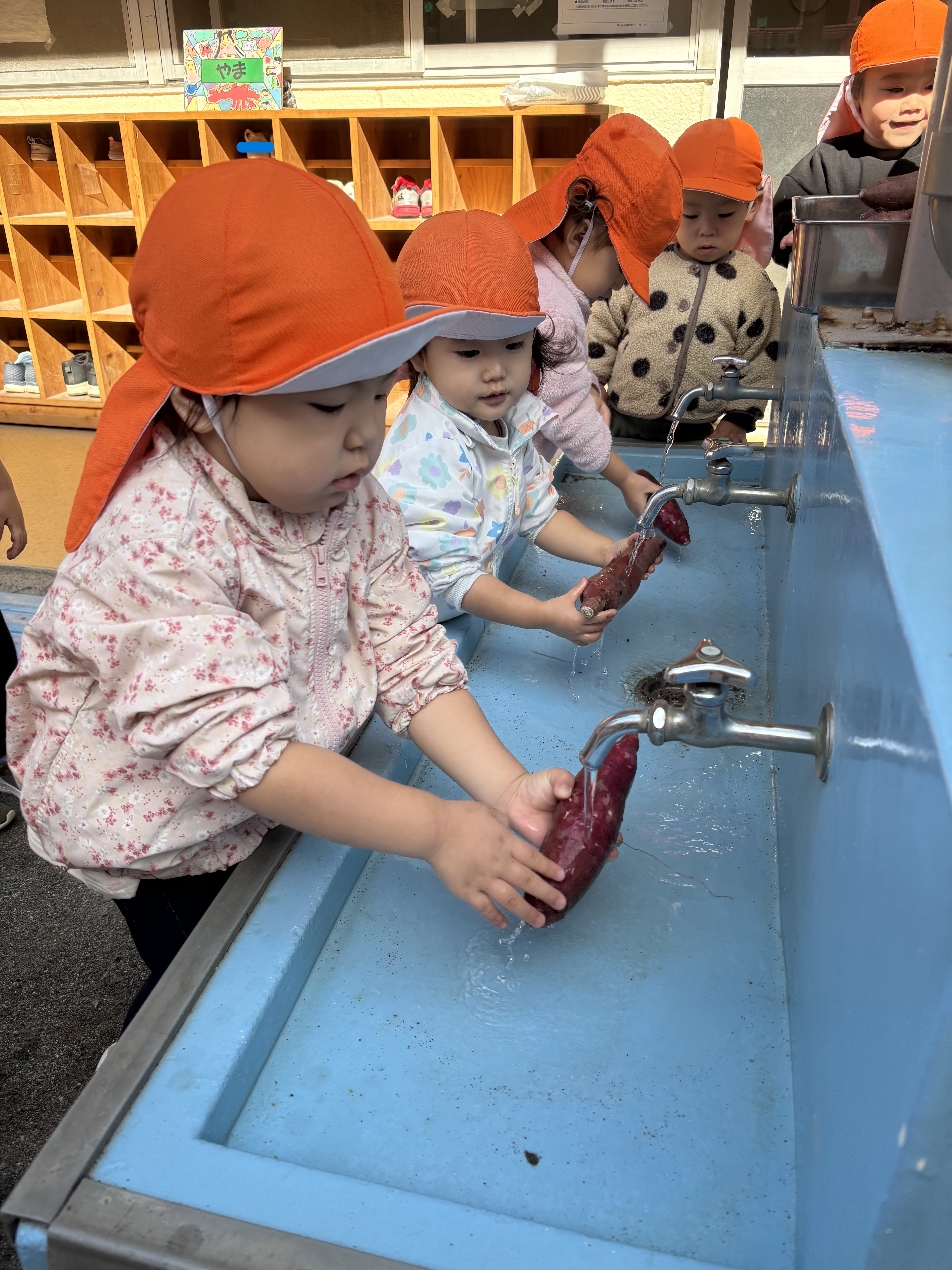 お外でサツマイモ洗いをして、おやつに食べました。お水がつめた~い!